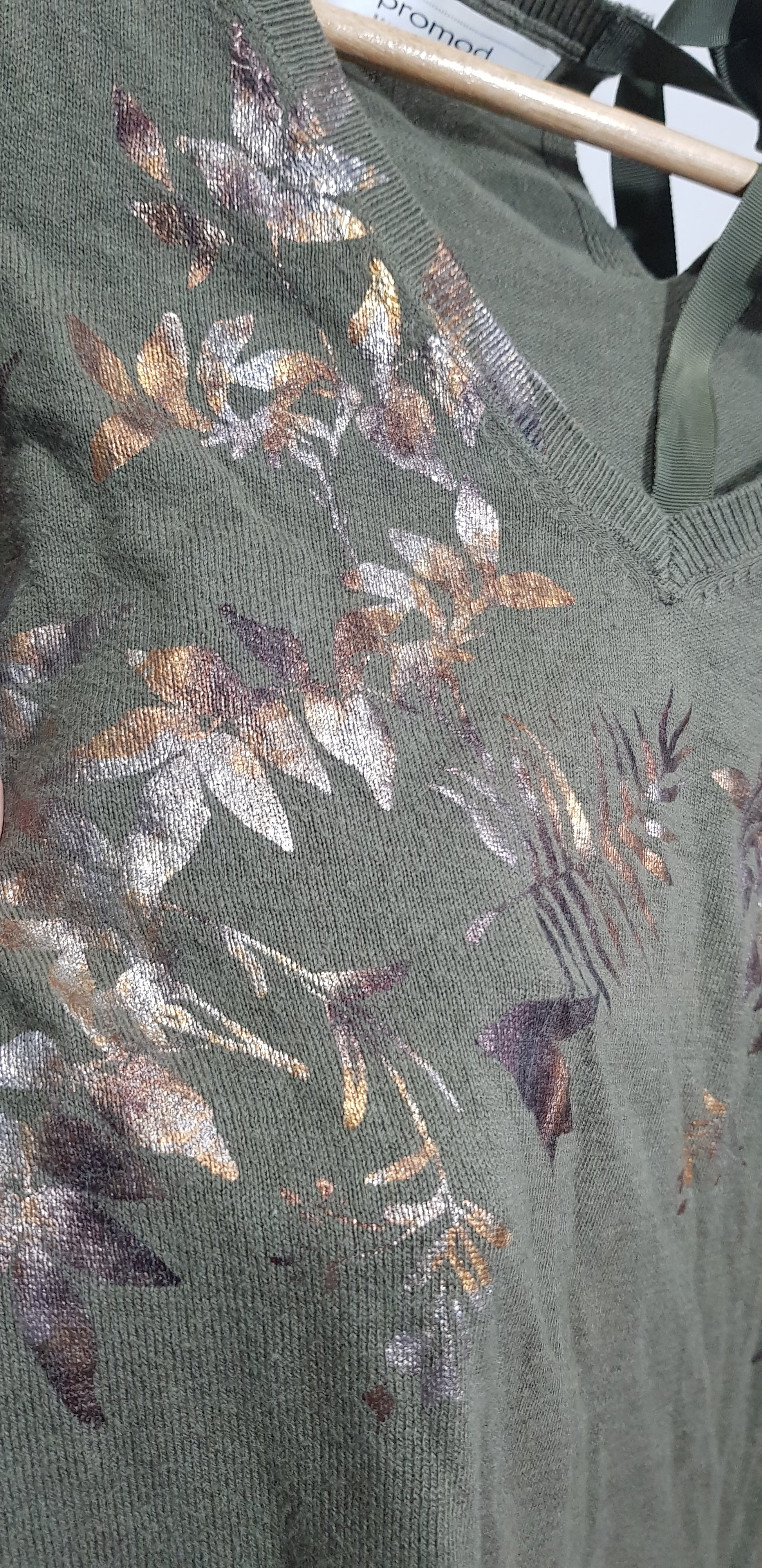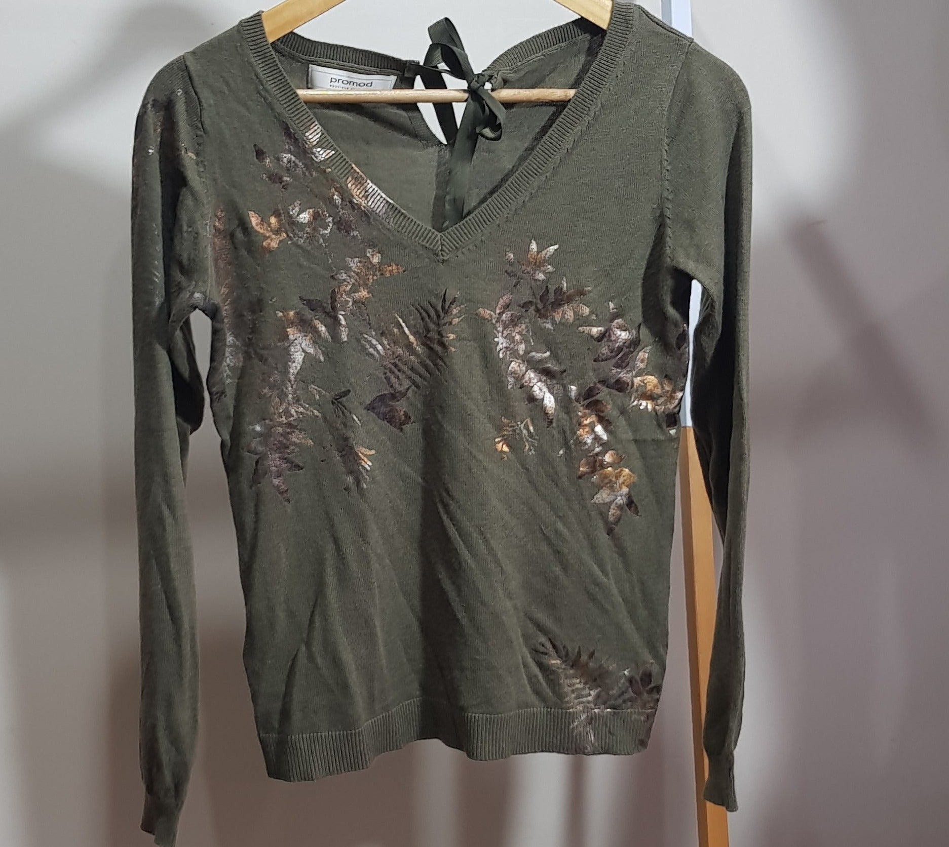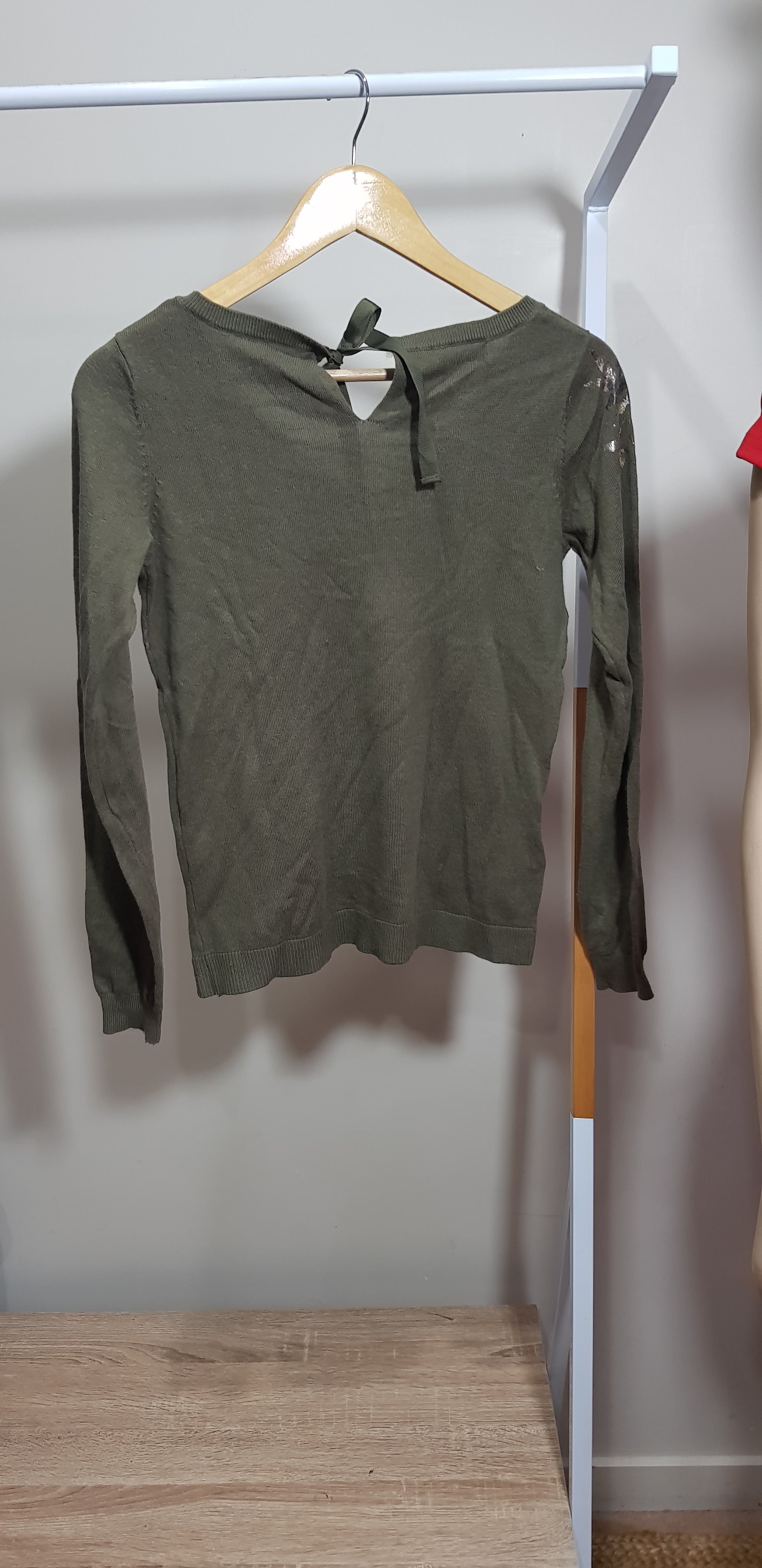This gorgeous promod top was purchased in Spain several years ago. Still good preloved condition. Long sleeves, with gold details in front and a super cute back. Size XS. Best fit size 6-8 in my opinion.