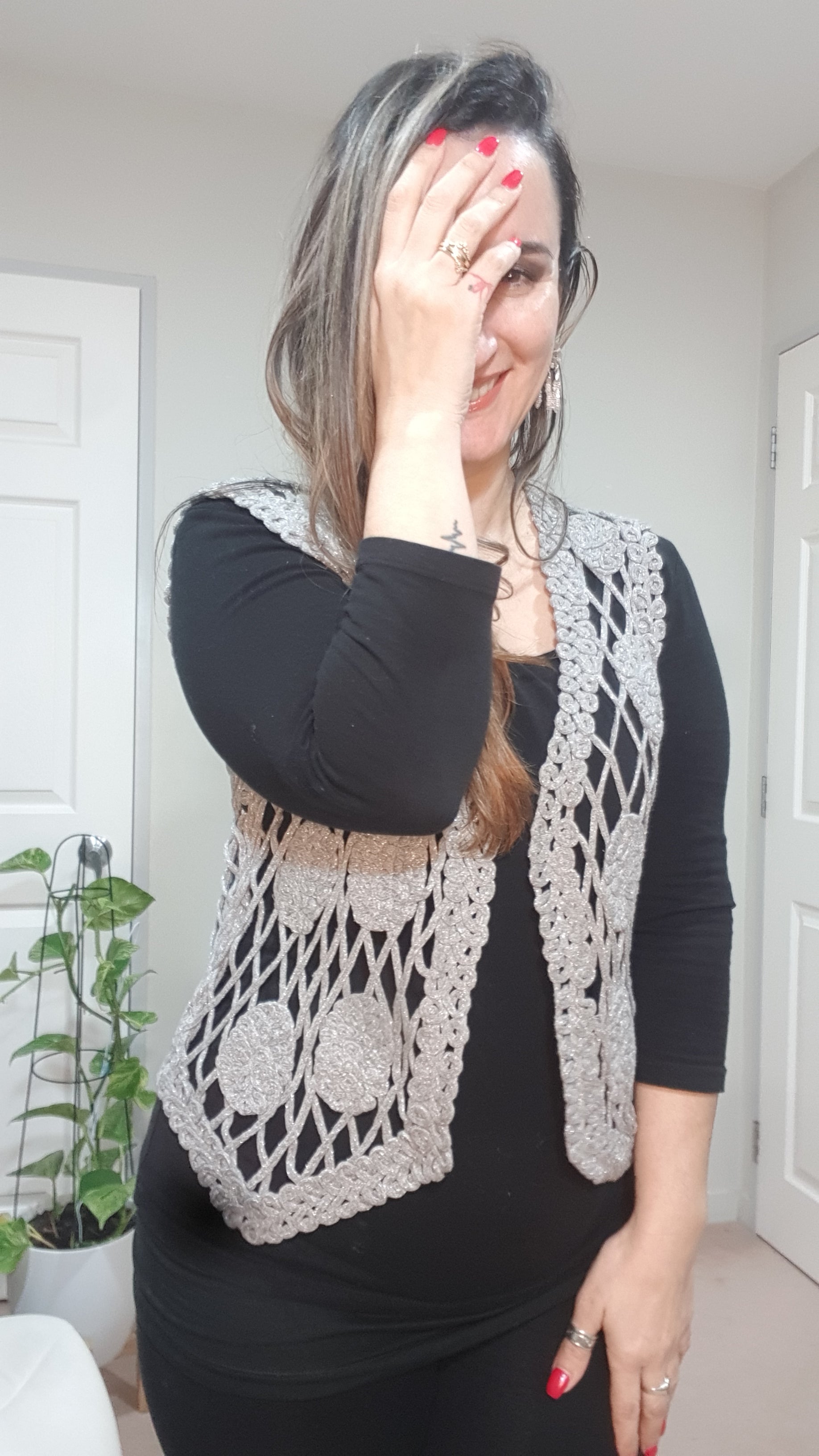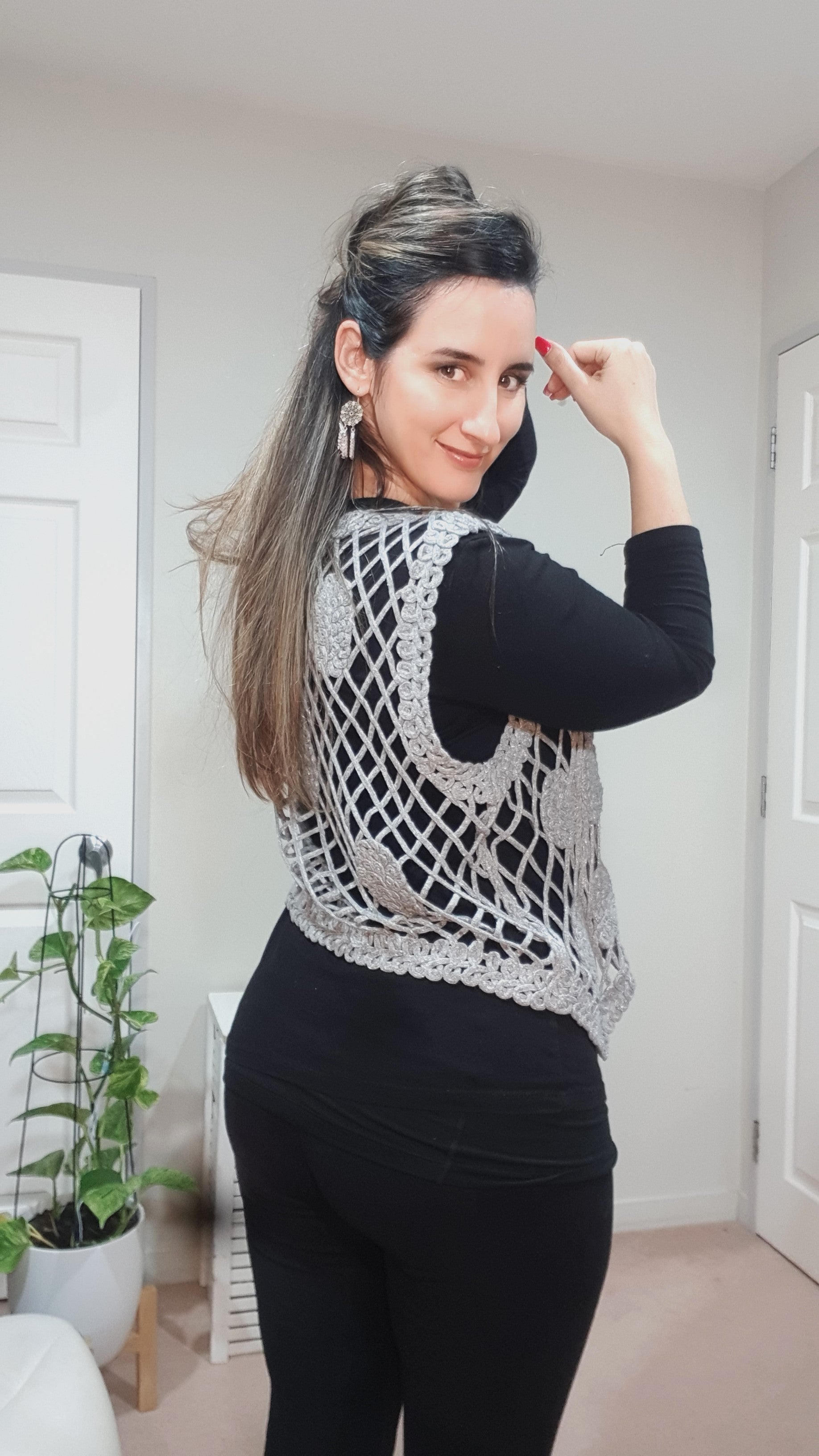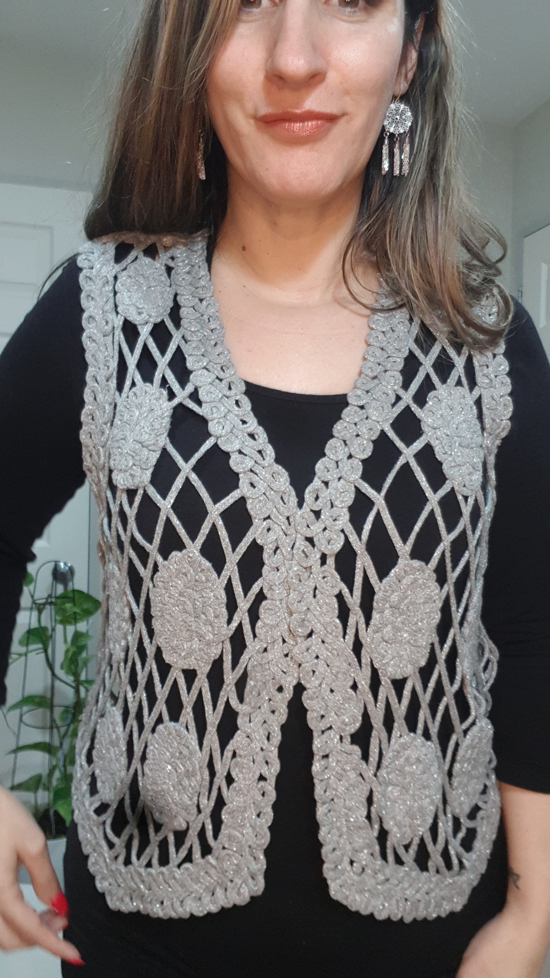 This gorgeous vest doesn't have any tags on, I assume it is a hand made piece but I an not too sure about it. The color is a delicate shiny grey. I would say it is a size medium but it depends on the look desired.