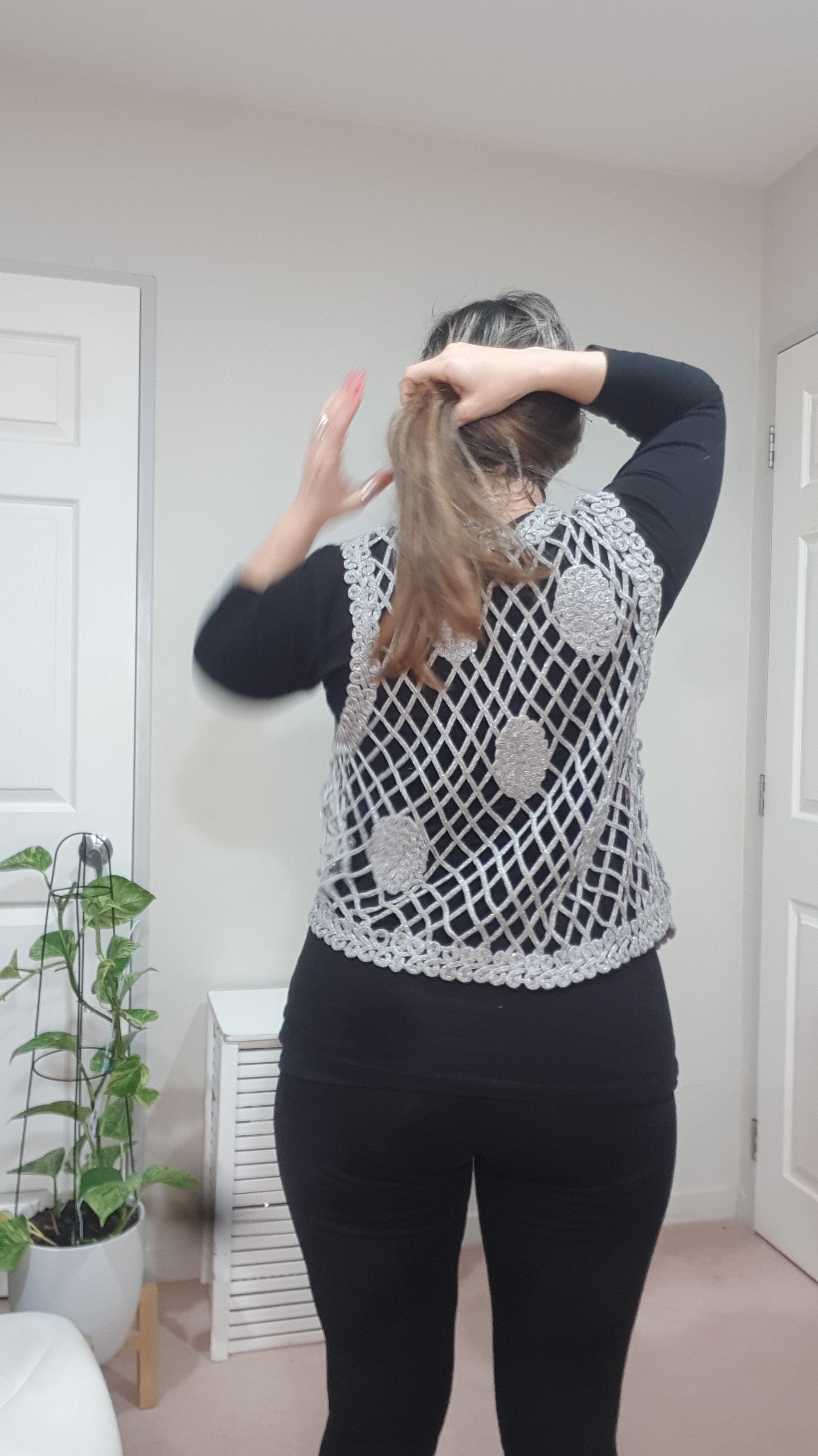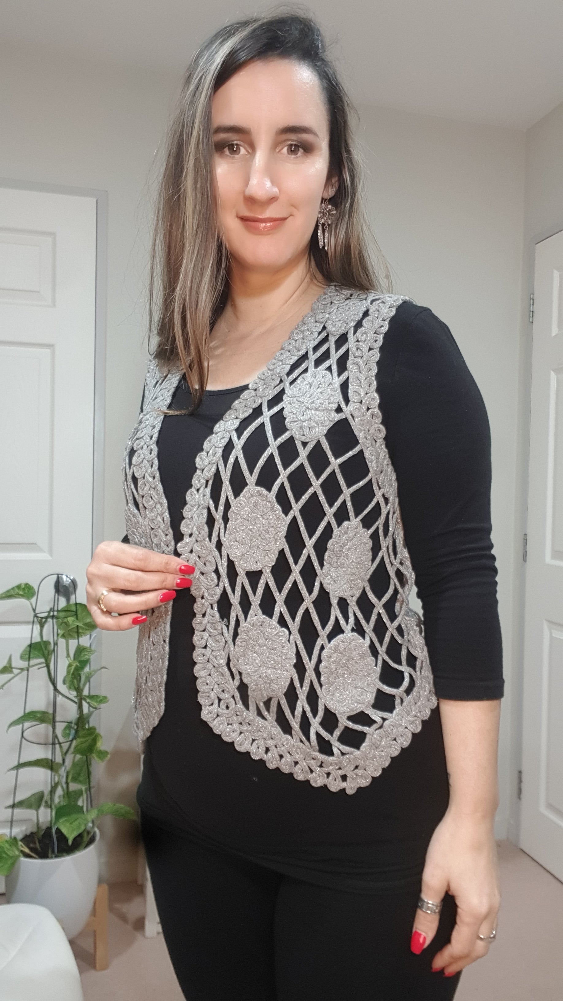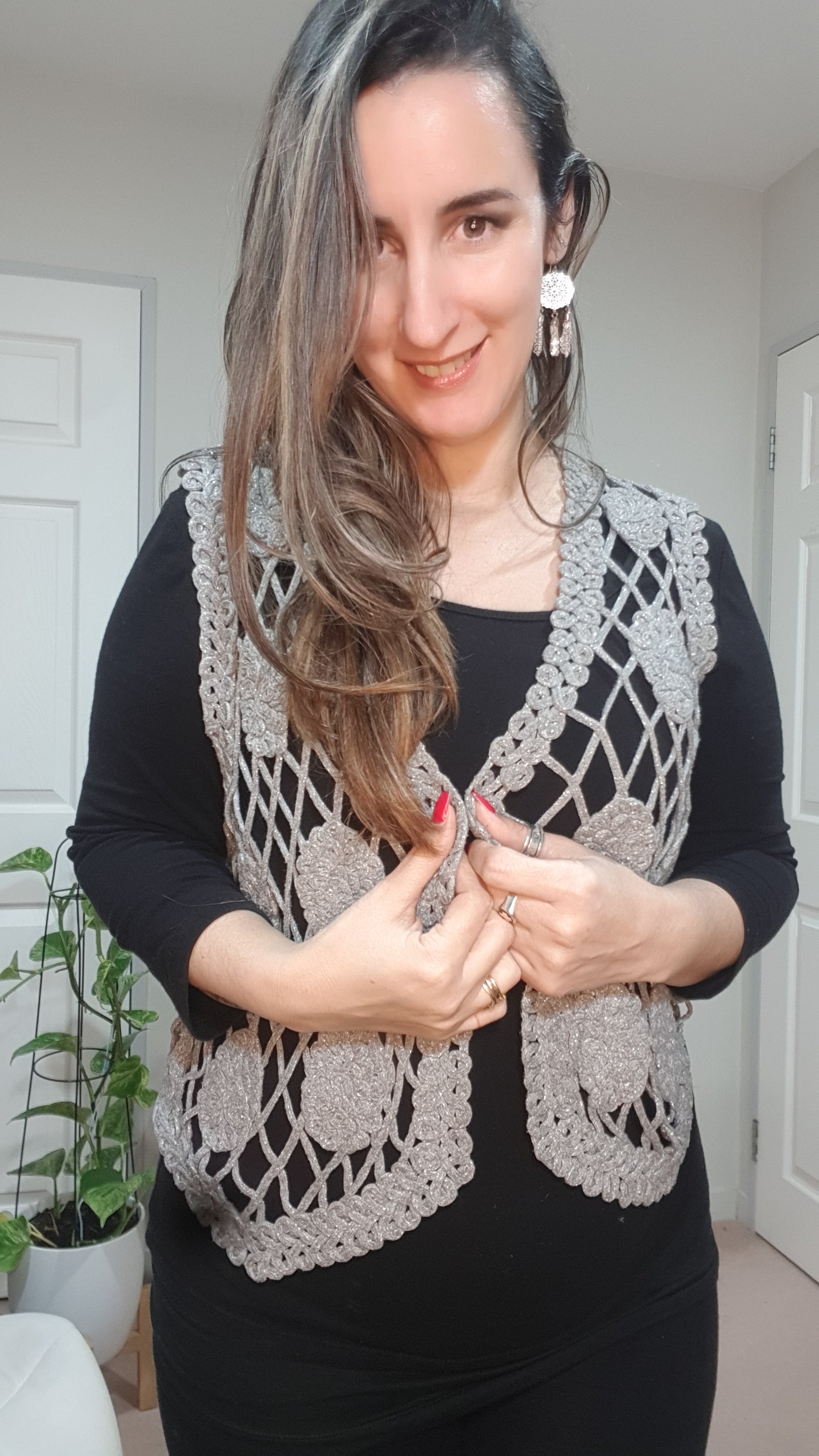 This gorgeous vest doesn't have any tags on, I assume it is a hand made piece but I an not too sure about it. The color is a delicate shiny grey. I would say it is a size medium but it depends on the look desired.