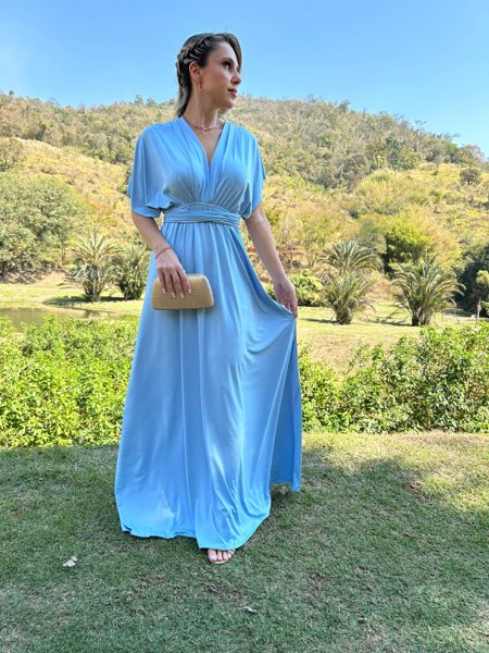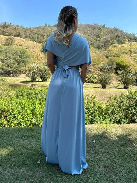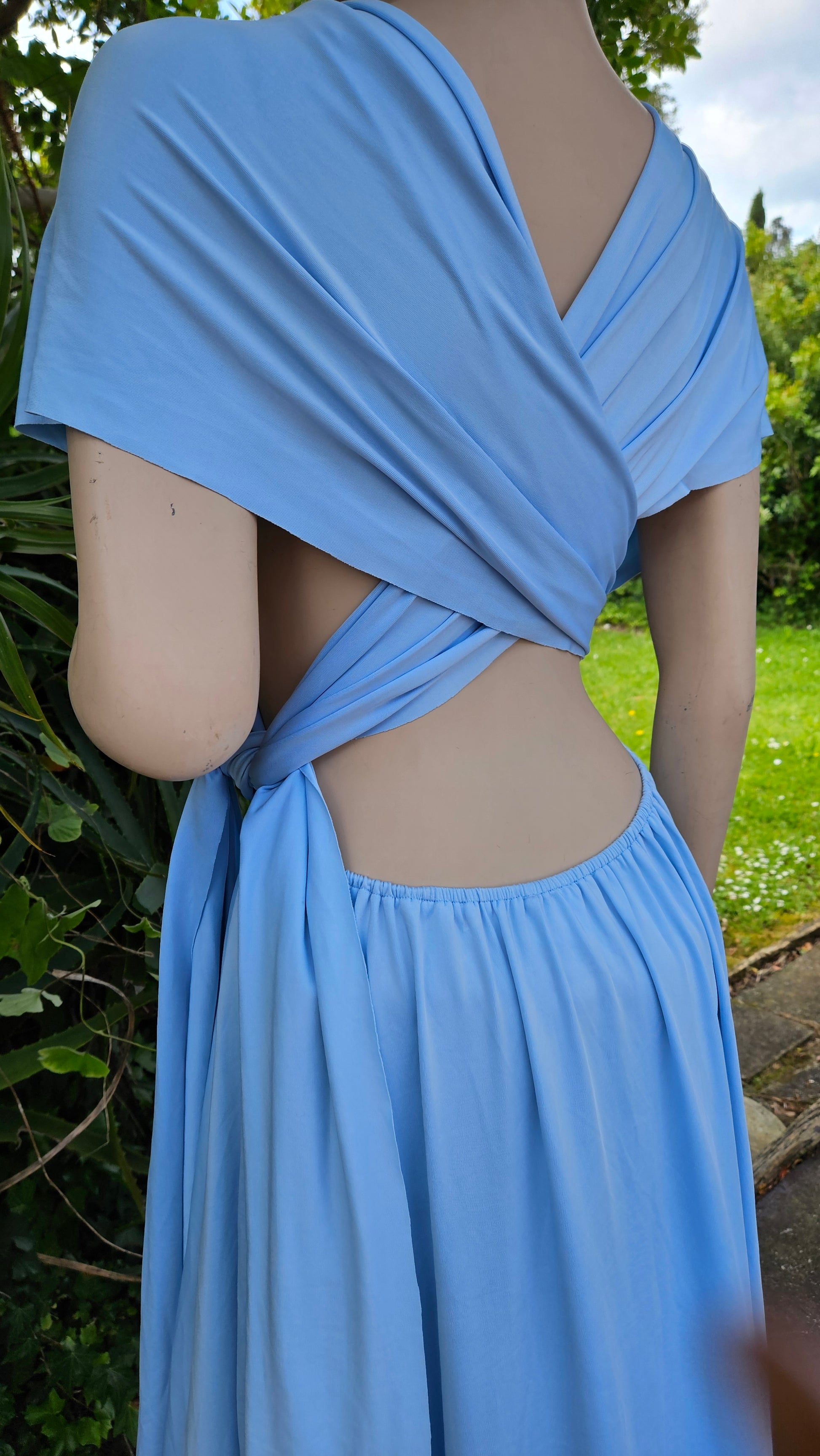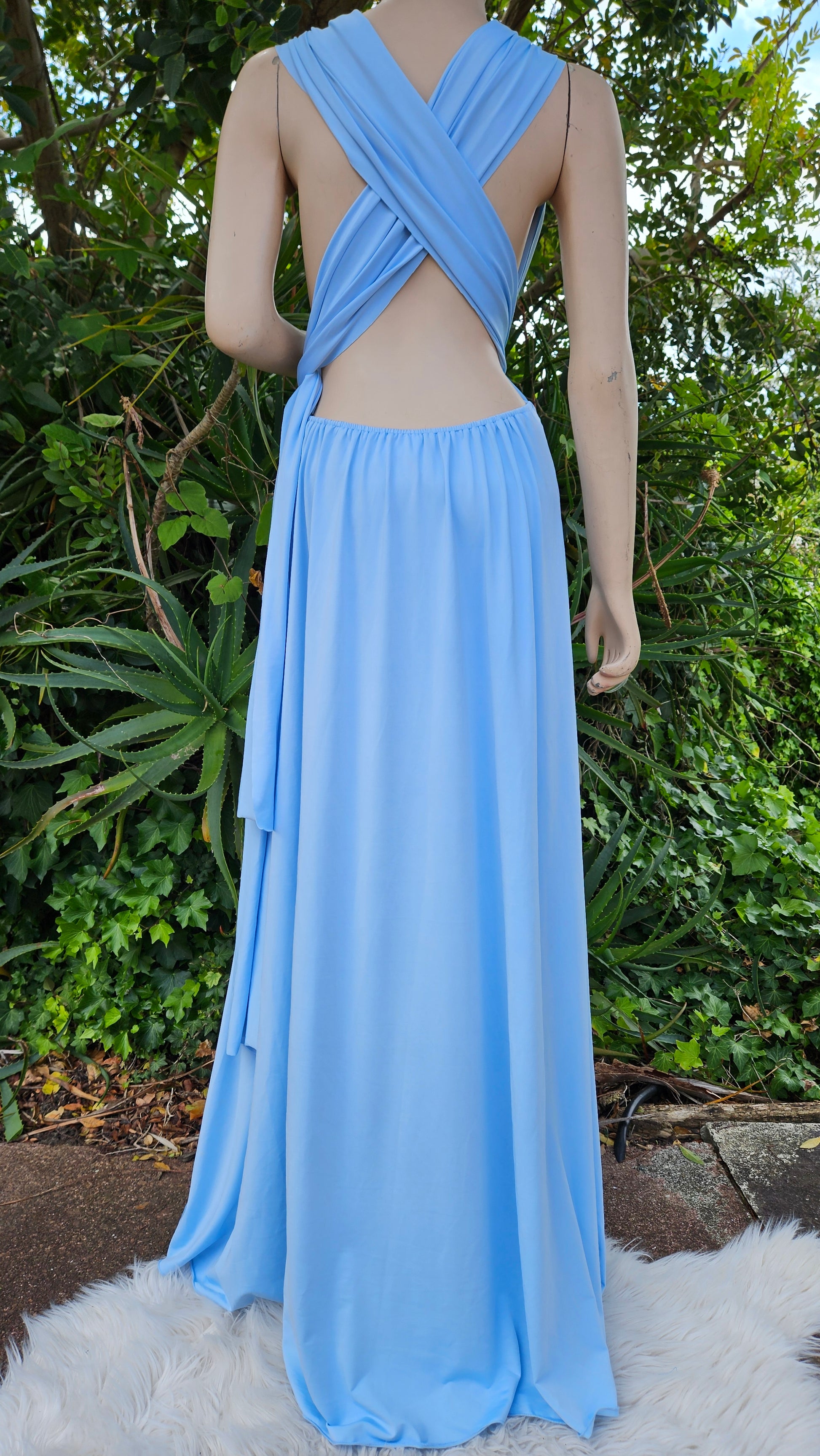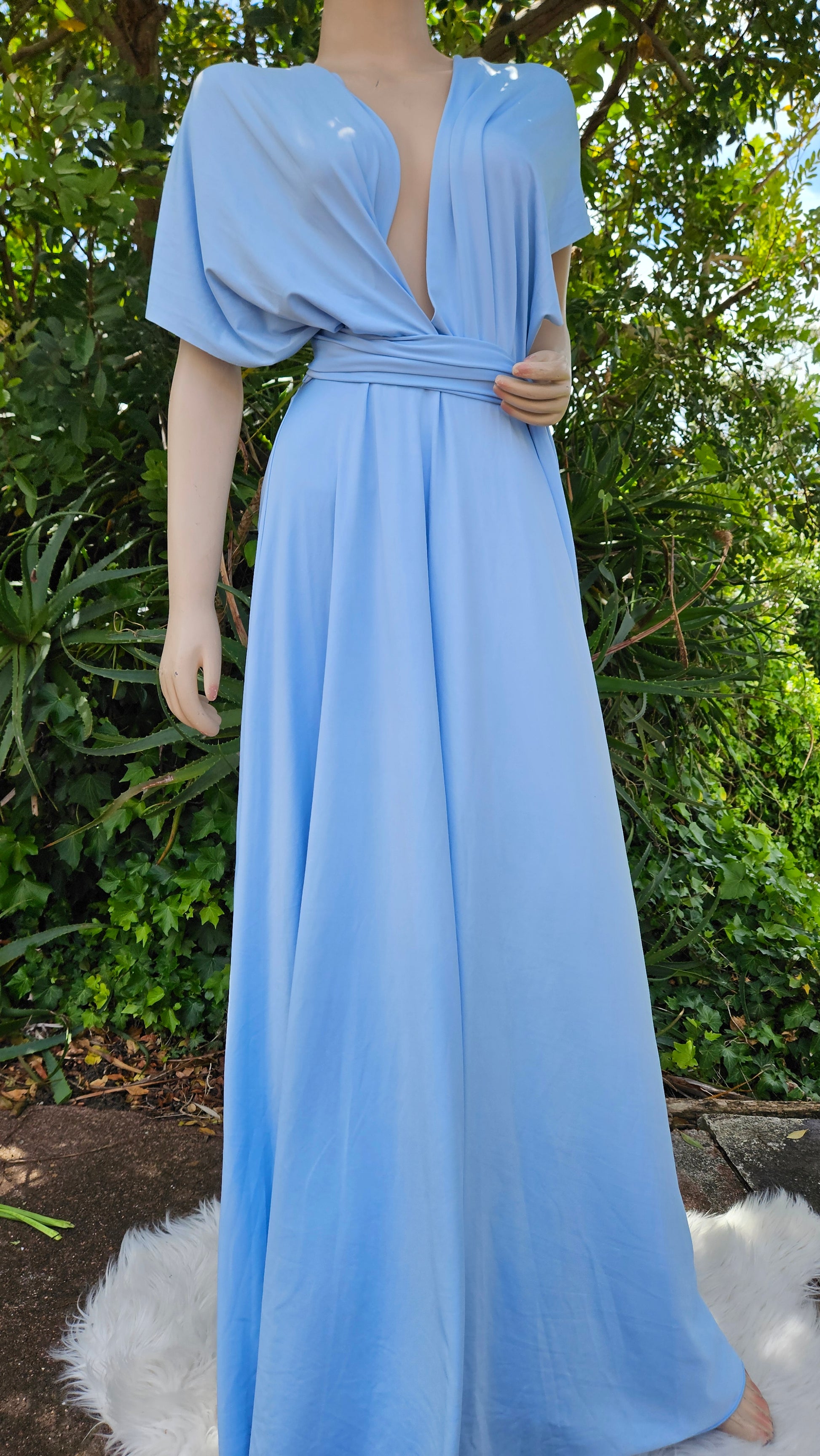 Stay in fashion always with our Full length Infinity Multi way Babysbreaths dress in Belle Blue with a split. So many ways to wear with wrap around convertible straps, with a flexible waistline and a full skirt that flatters all shapes. Extremely stretchy fabric.