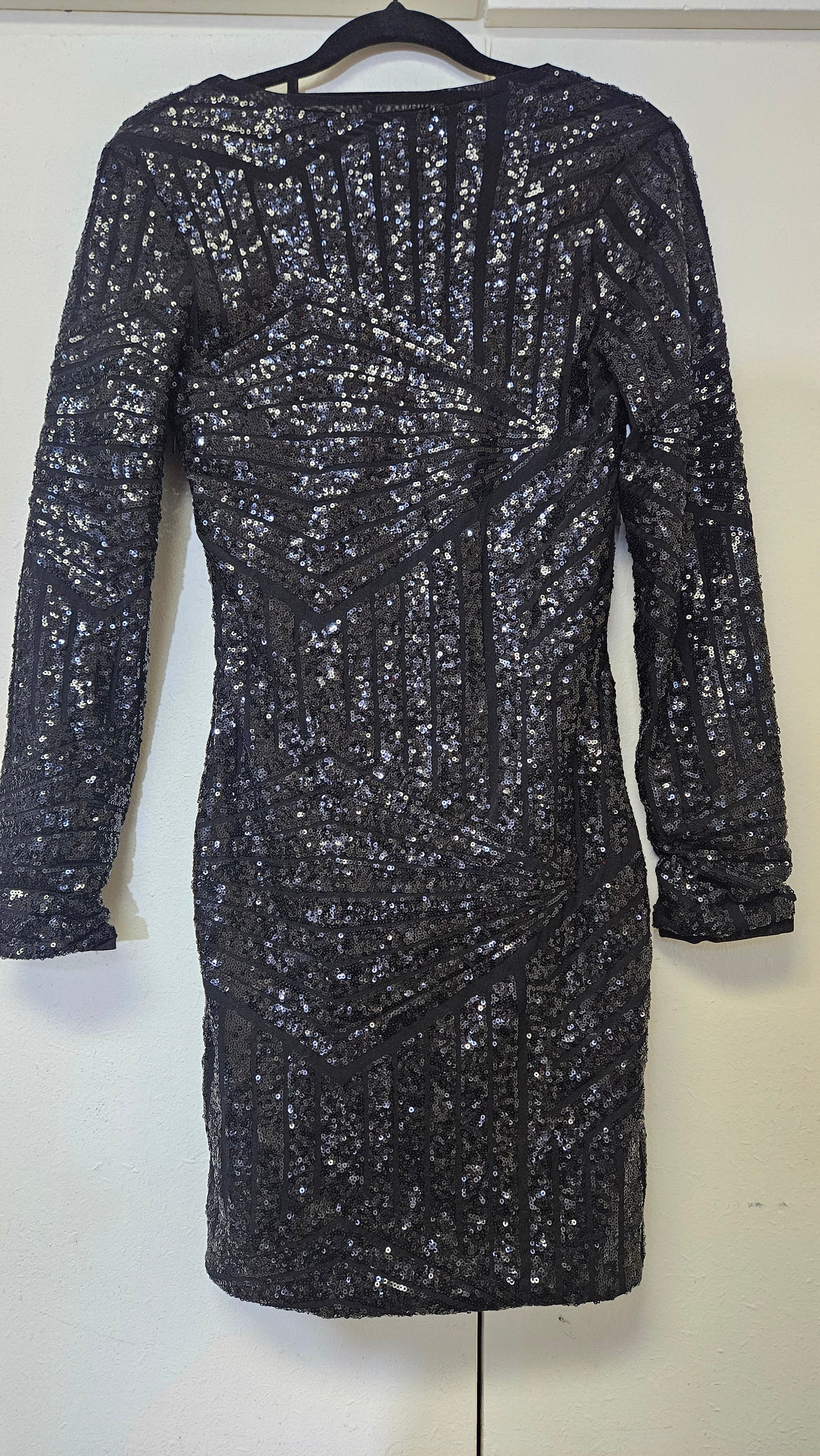 Black Sequined V Neck Long Sleeves Formal Dress MINI Dress Size S.