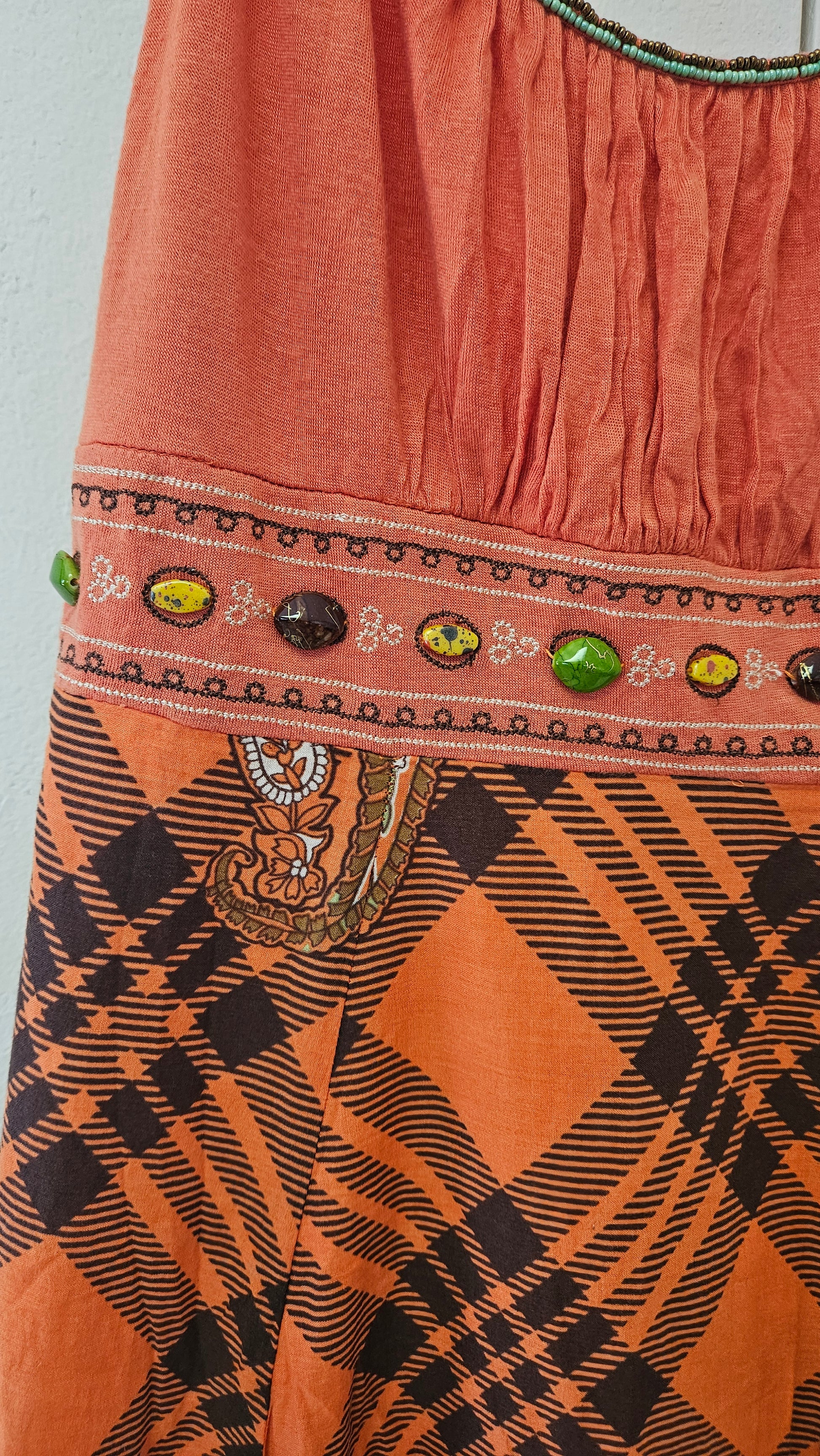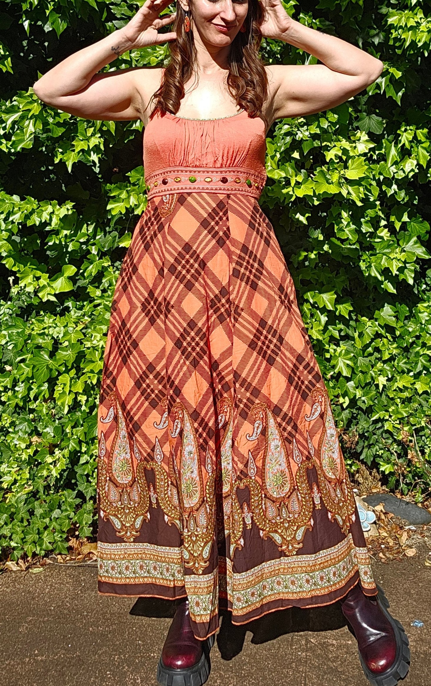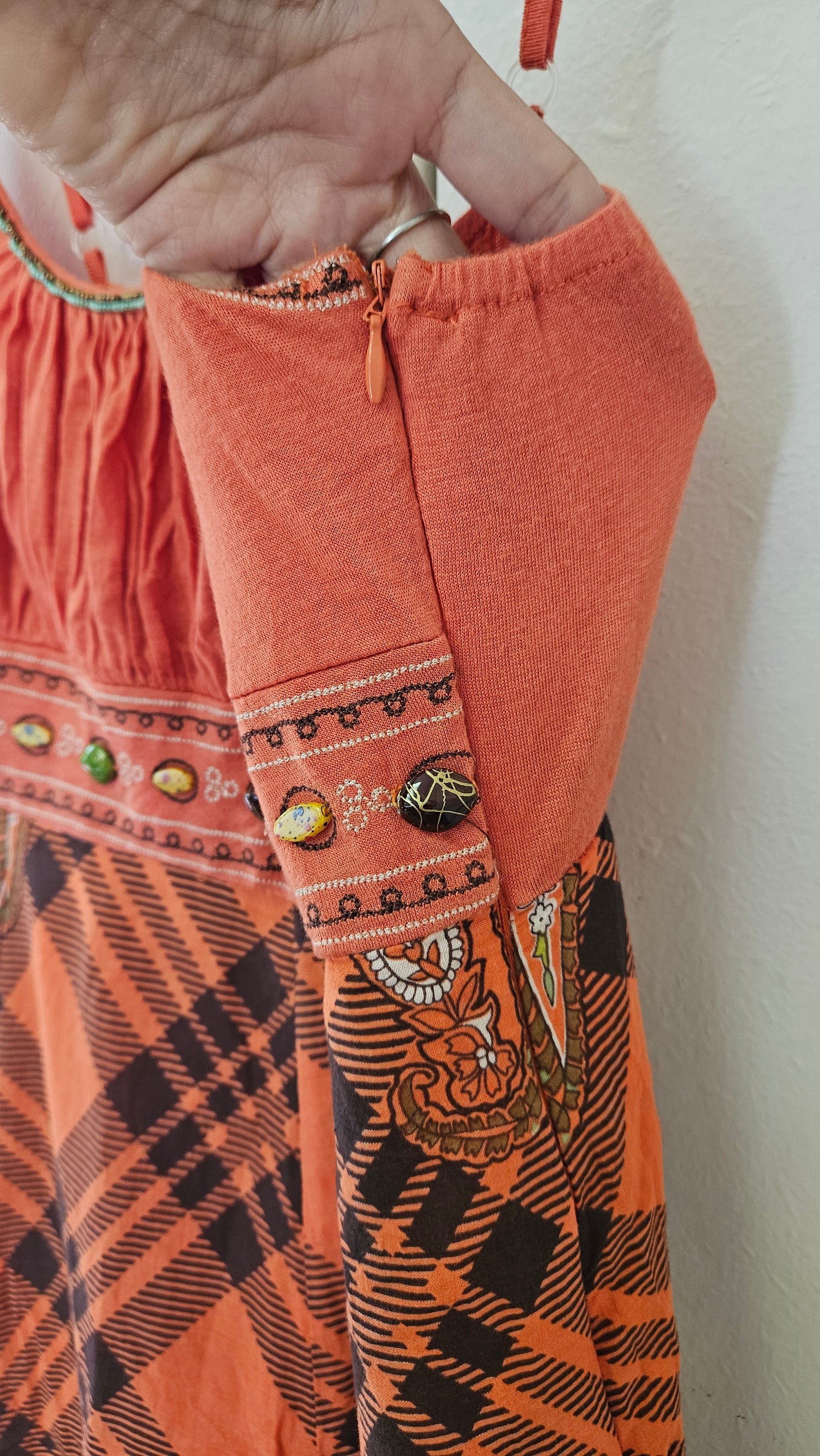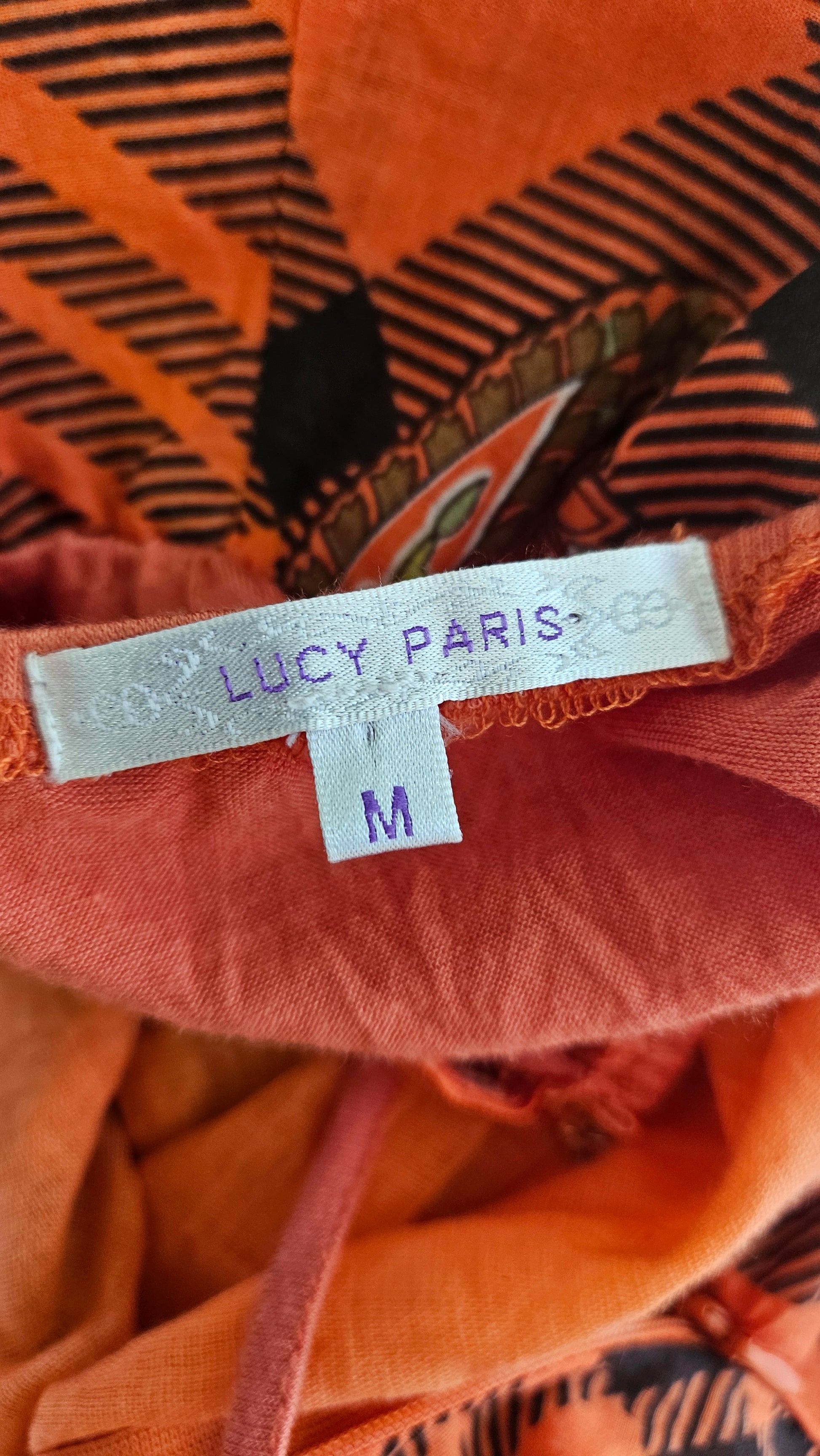 Gorgeous boho orange Dress, size M, by Lucy Paris, a unique piece that's now part of our preloved collection. This dress radiates super cute bohemian style. I am a size 10-12 , and it fits me well, it is estimated to be around a size 10-12 in my opinion. Plenty of room on the chest.