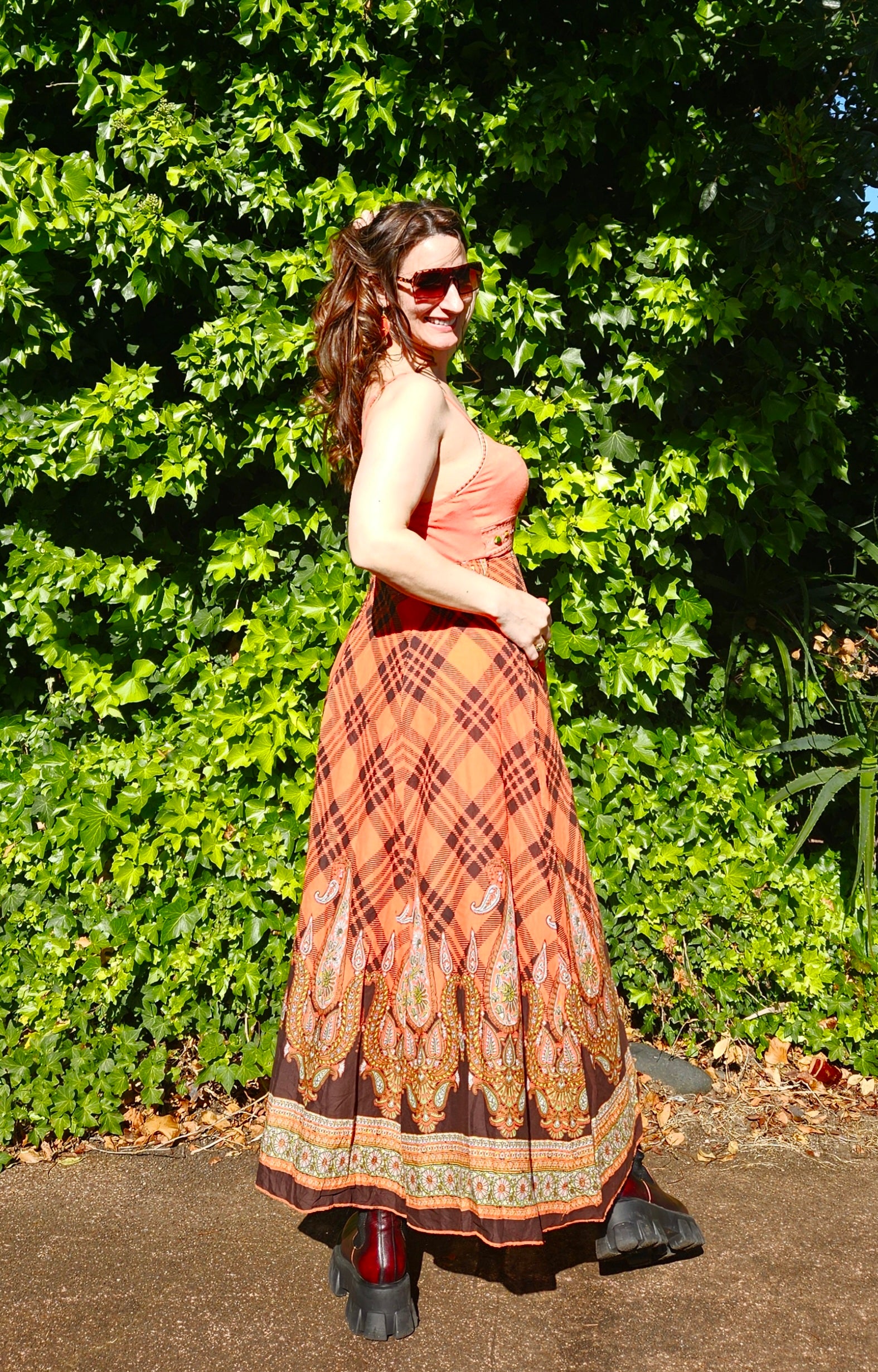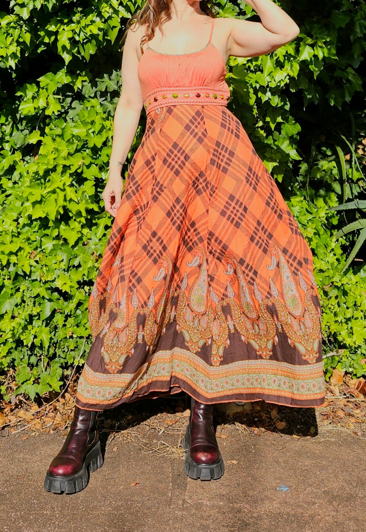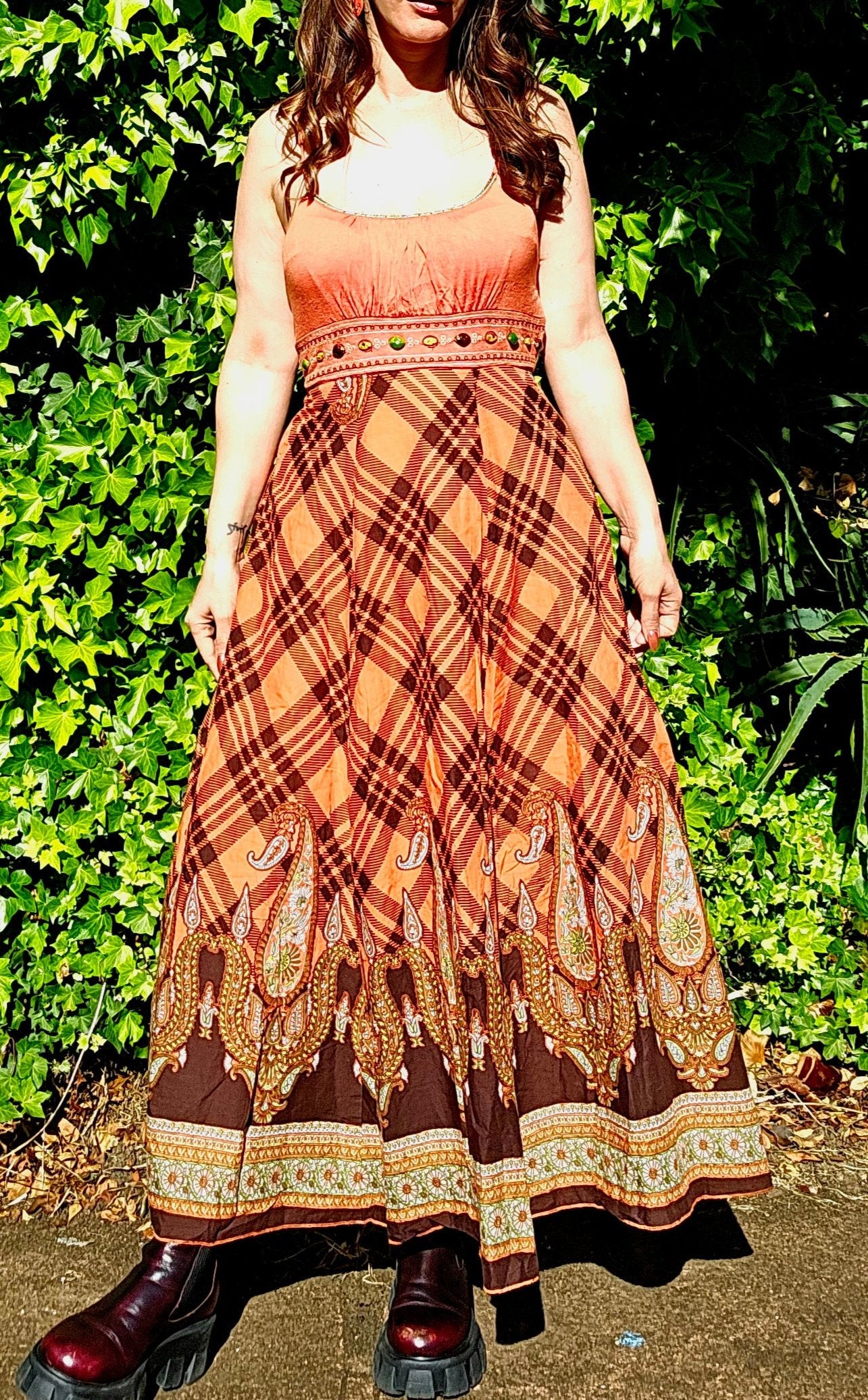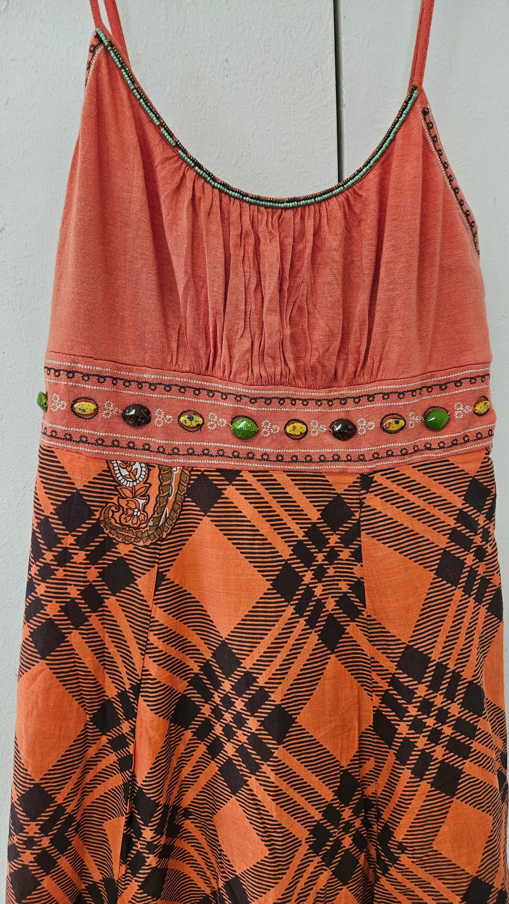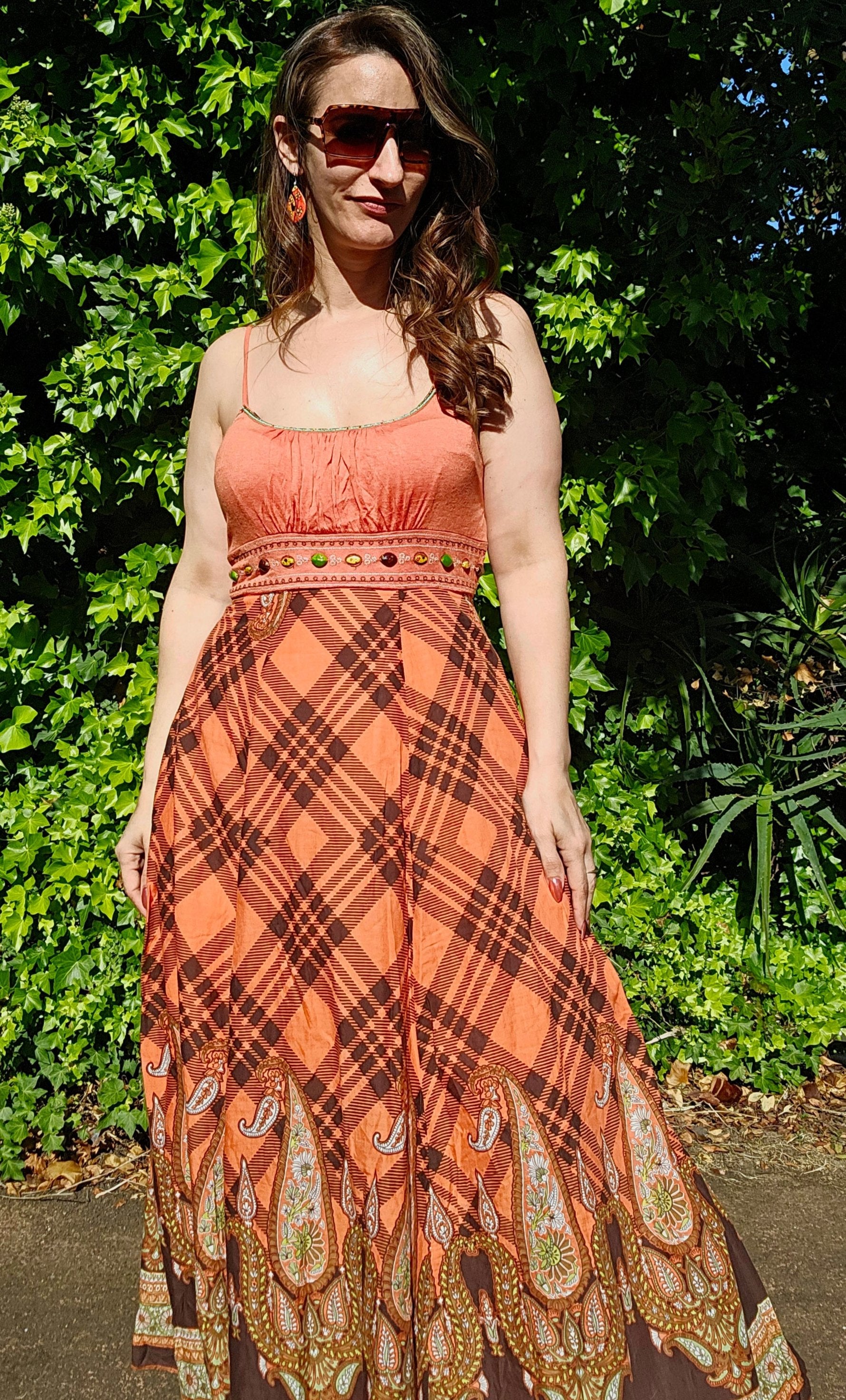 Gorgeous boho orange Dress, size M, by Lucy Paris, a unique piece that's now part of our preloved collection. This dress radiates super cute bohemian style. I am a size 10-12 , and it fits me well, it is estimated to be around a size 10-12 in my opinion. Plenty of room on the chest.