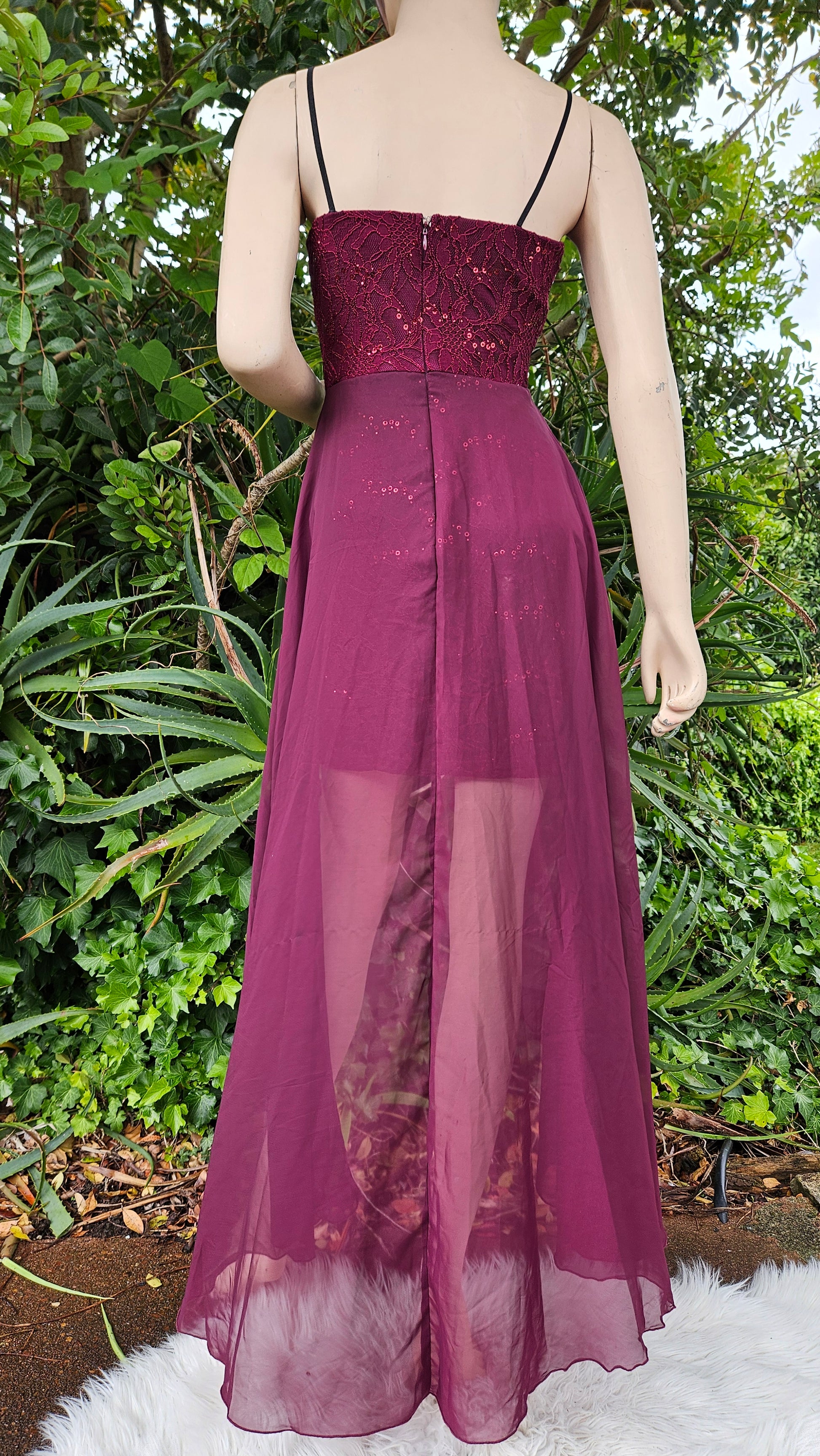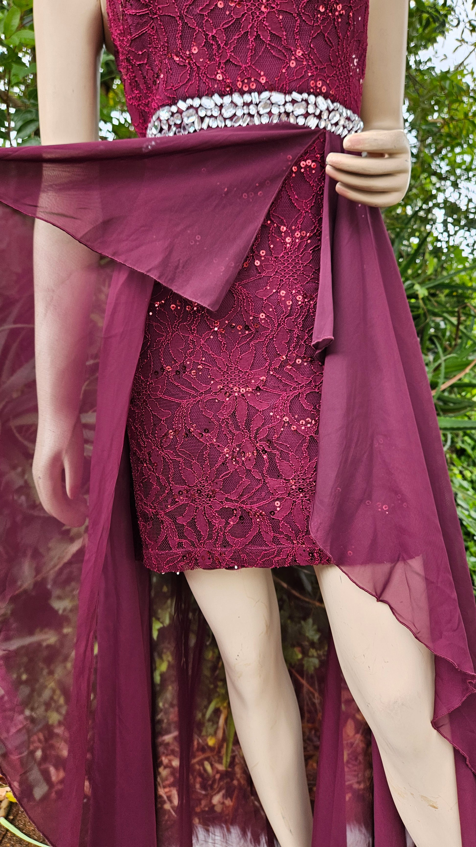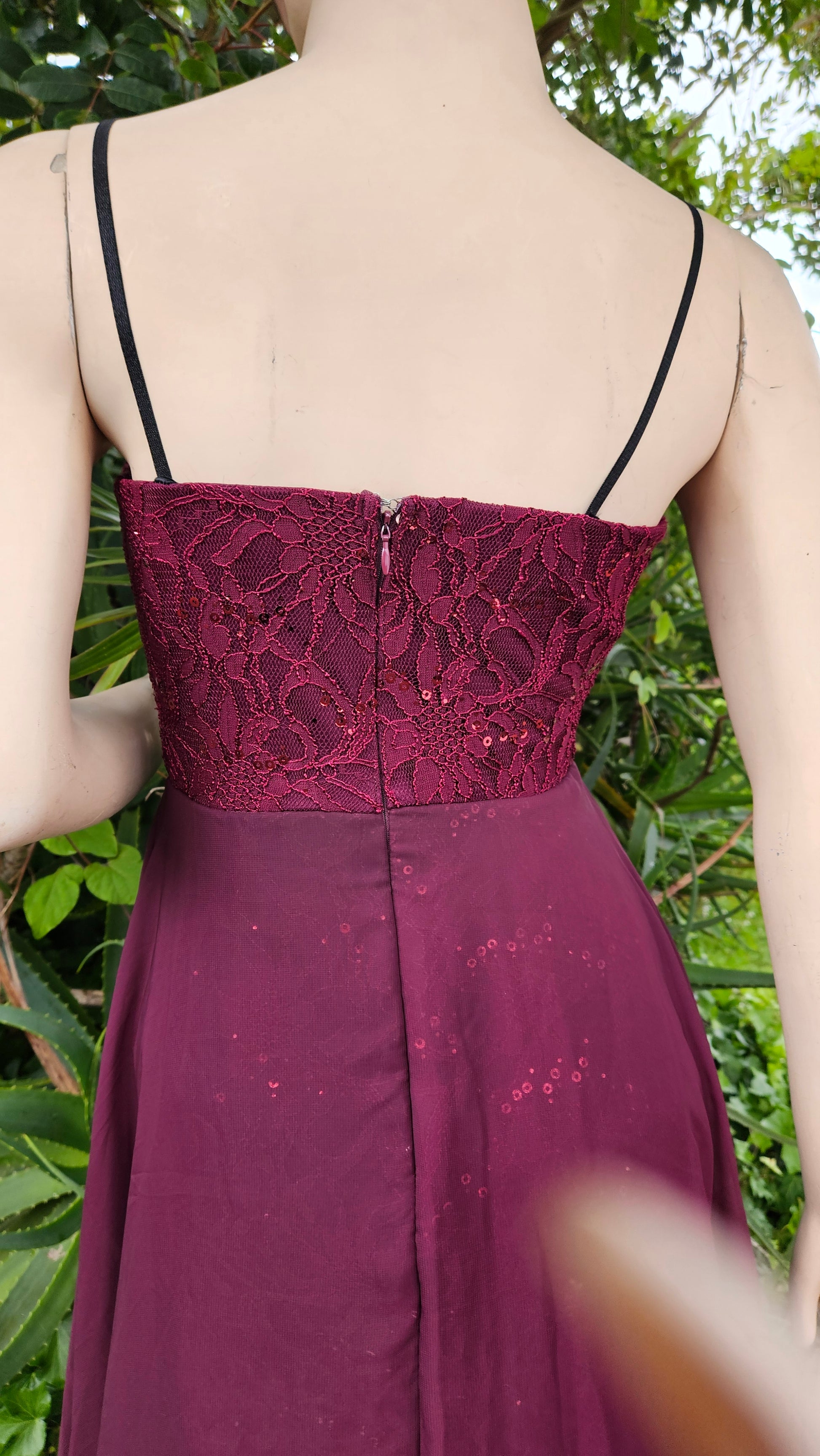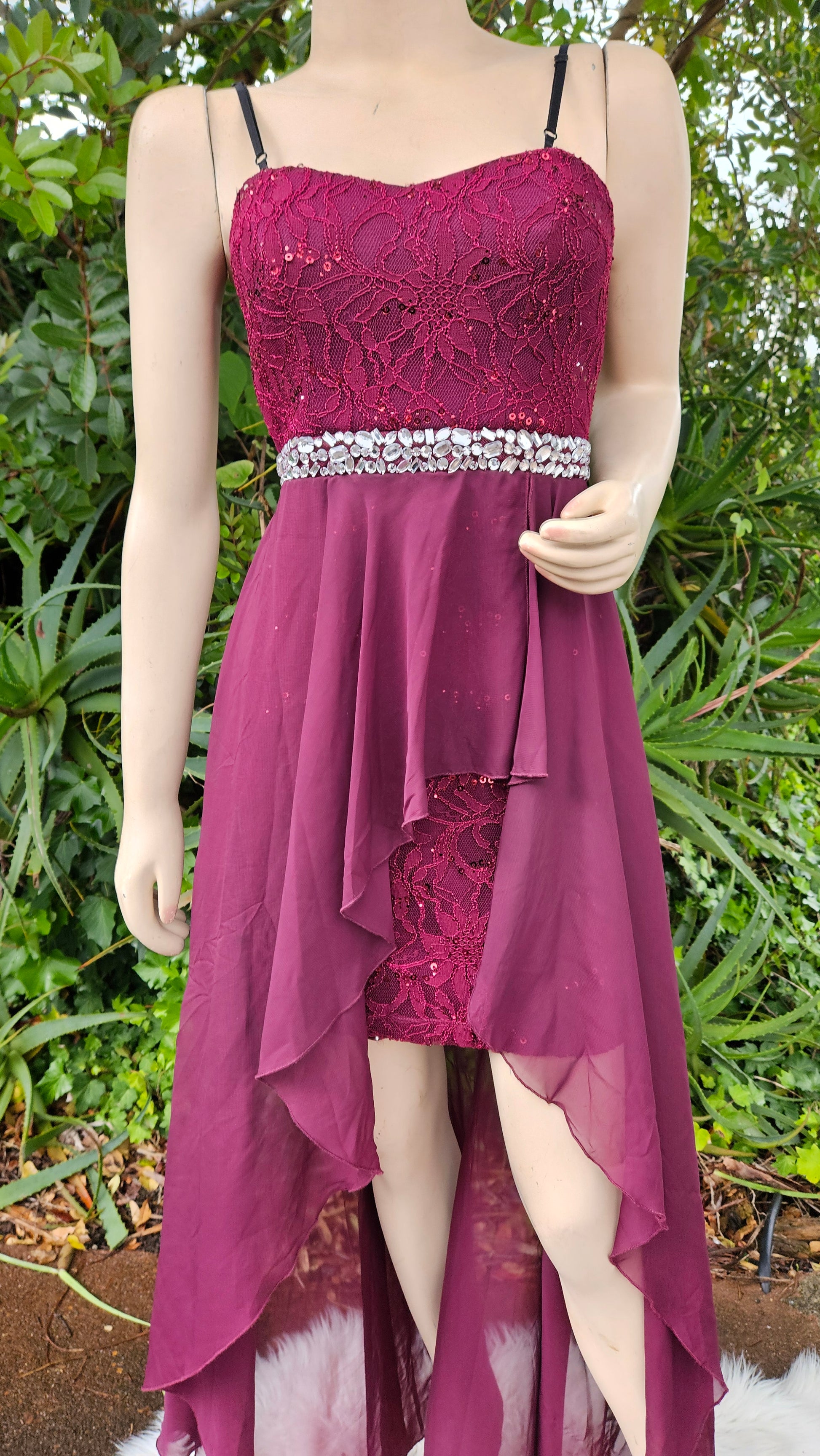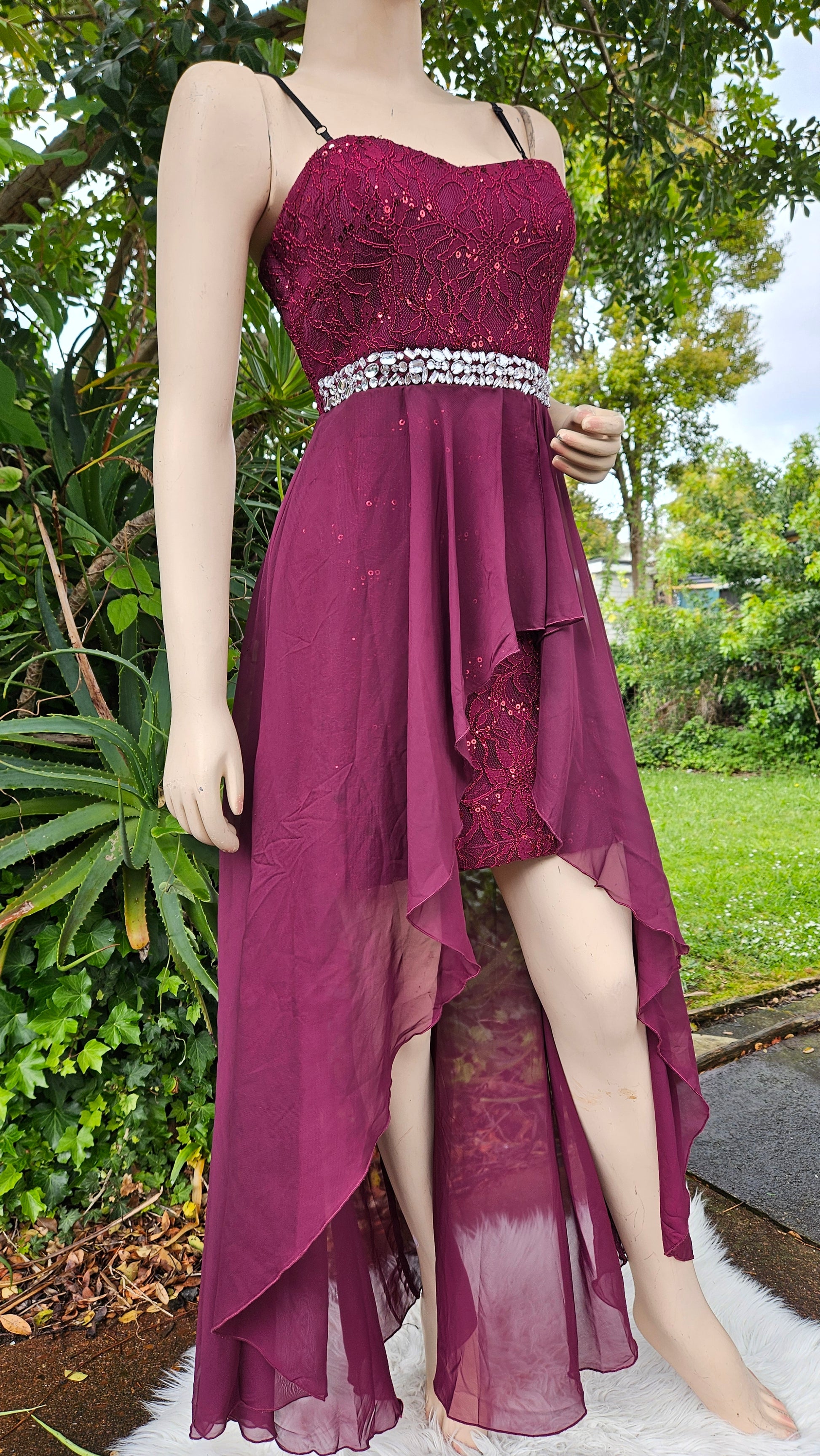 Beautiful second hand dress/ straps sweetheart short front long back hem red Burgundy dress asymmetric style, perfect for a party. Bridesmaid dresses, size 5 but it is more like a size 8-10 in my opinion. Super comfy.