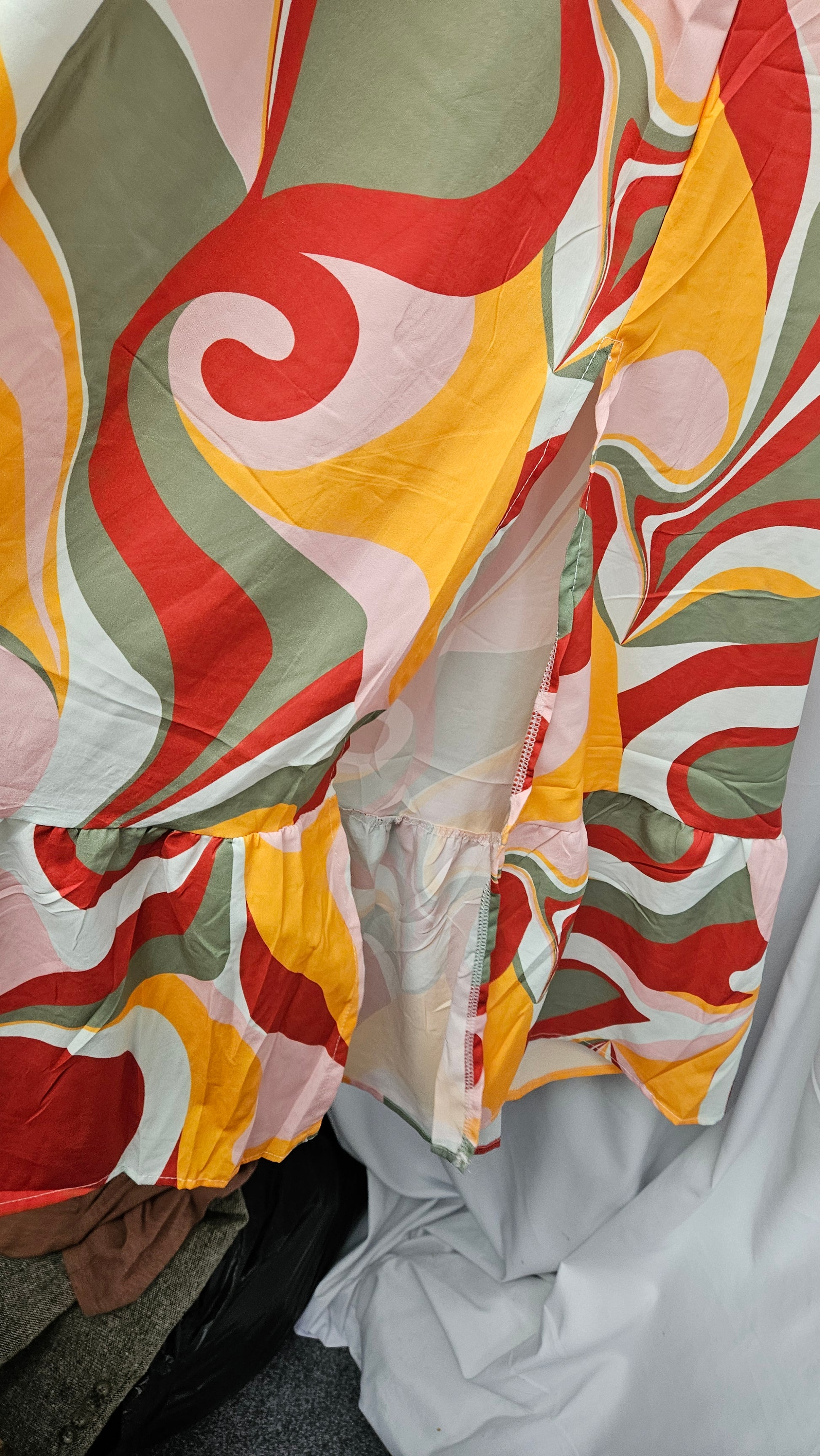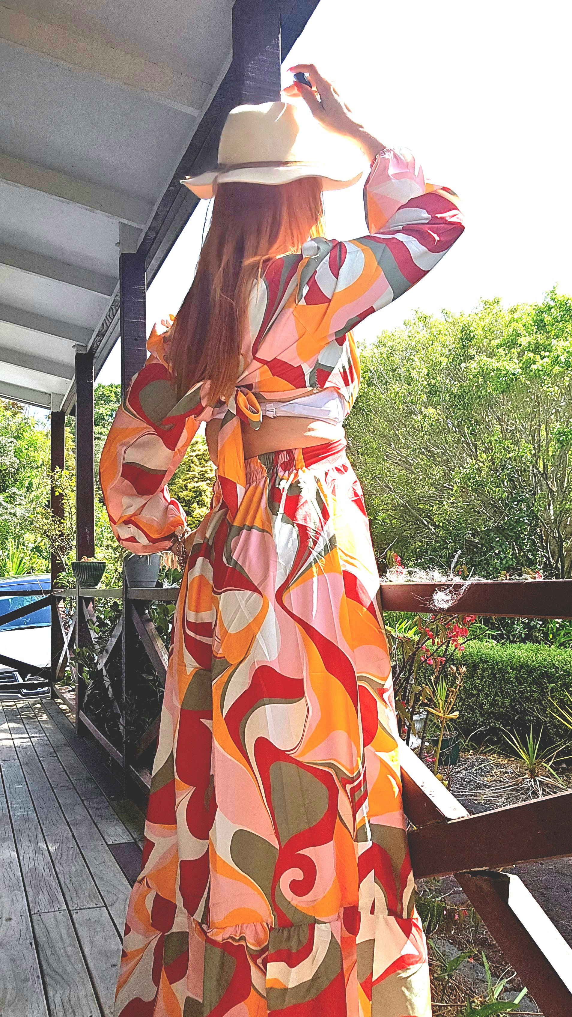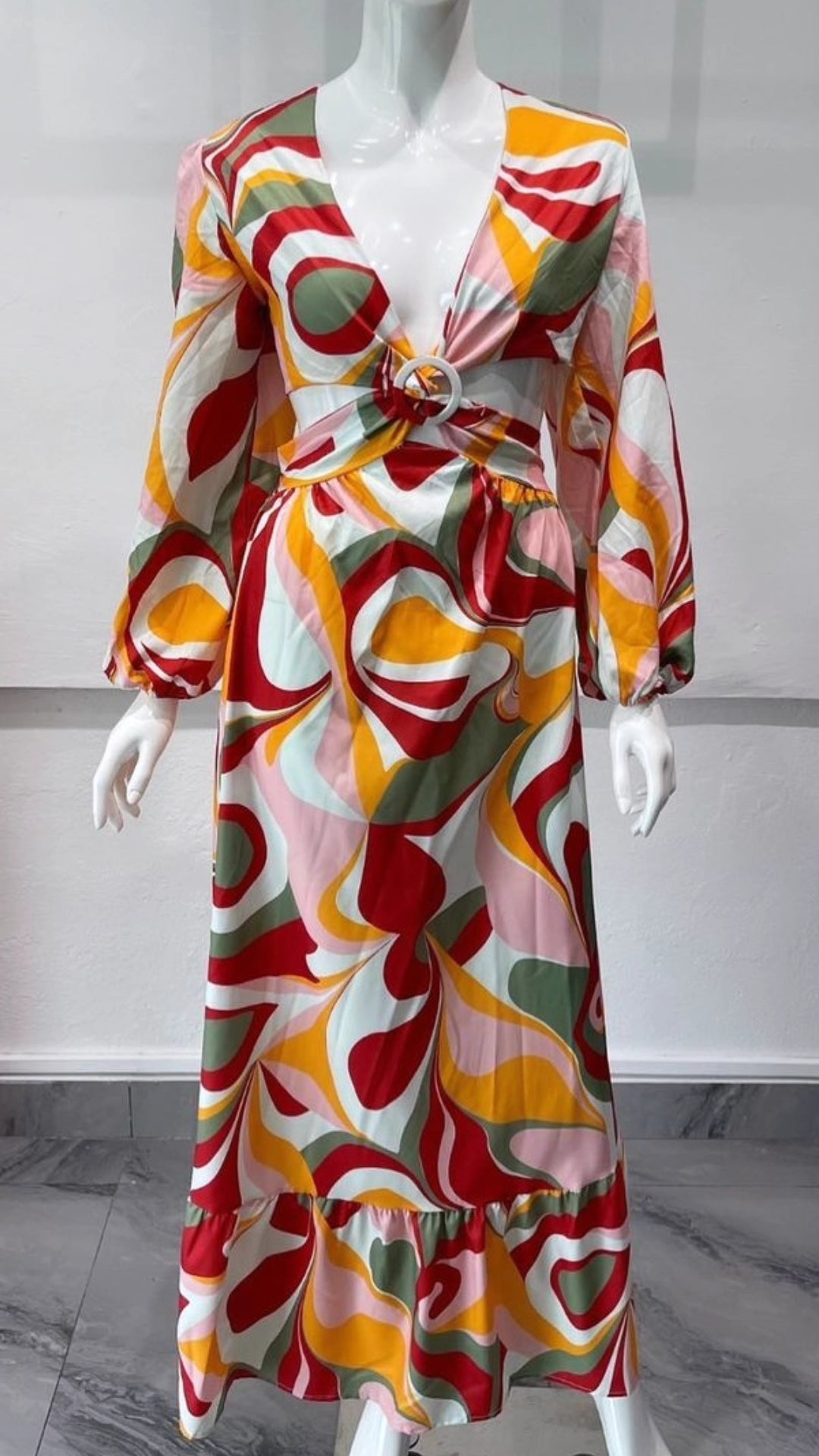 This ABSTRACT RUFFLE CUT OUT maxi dress features a fitted cropped bodice attached to a tiered skirt with long sleeves.