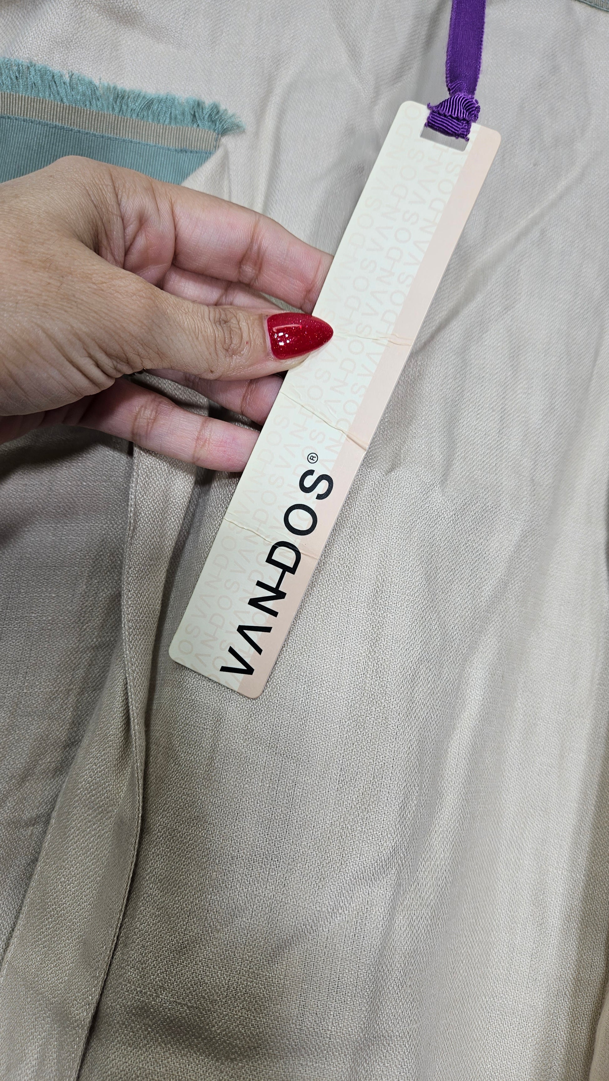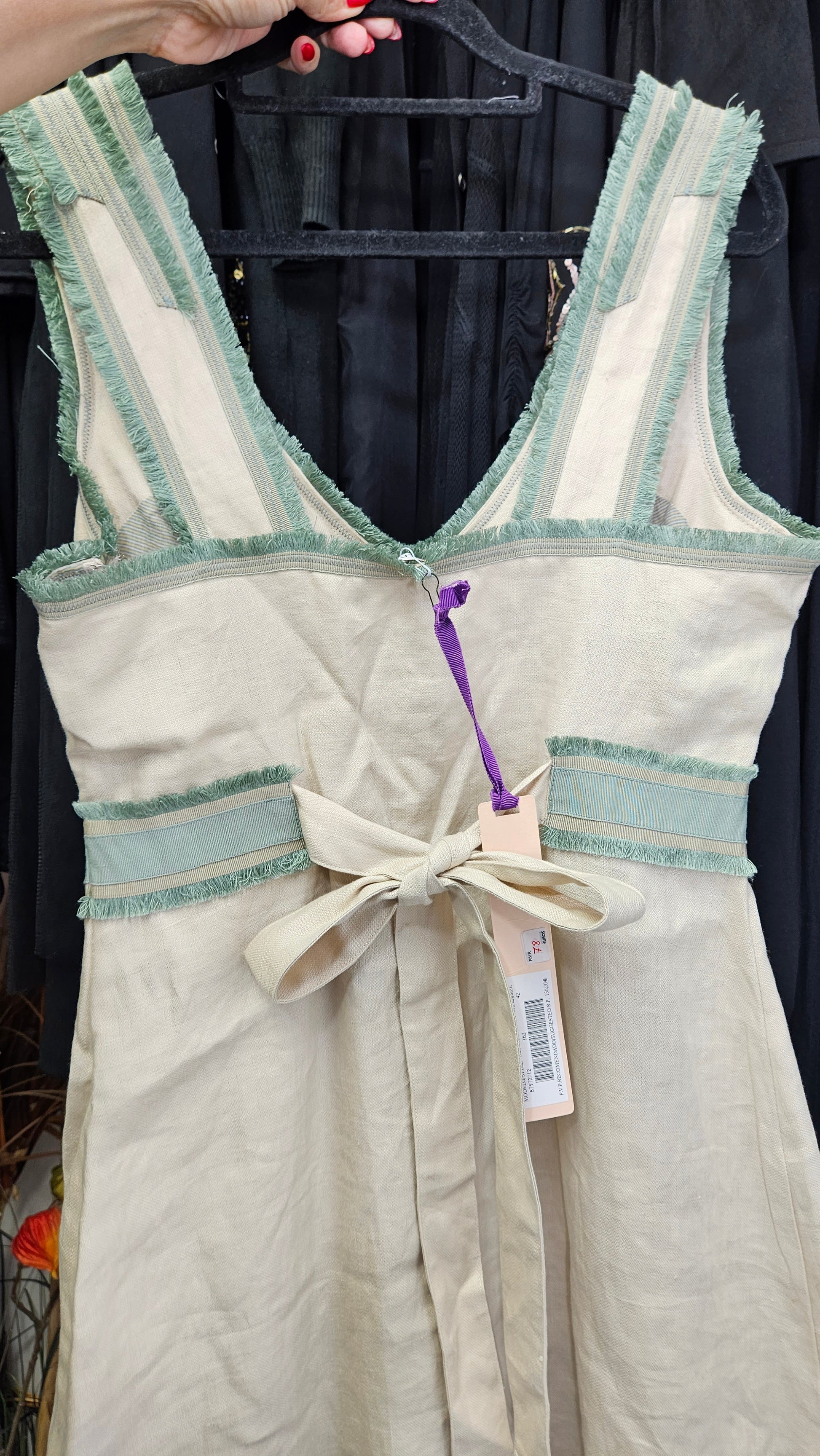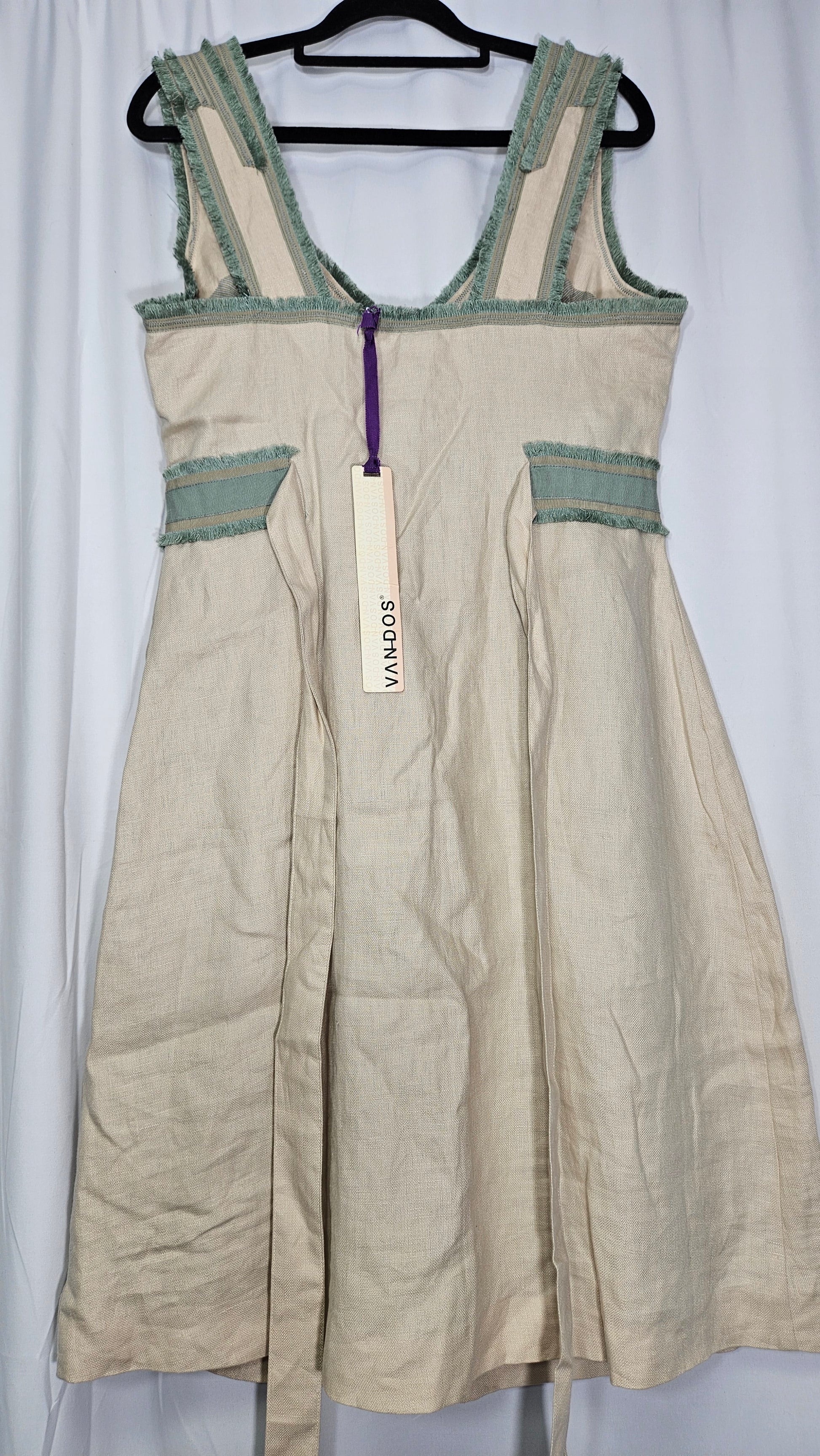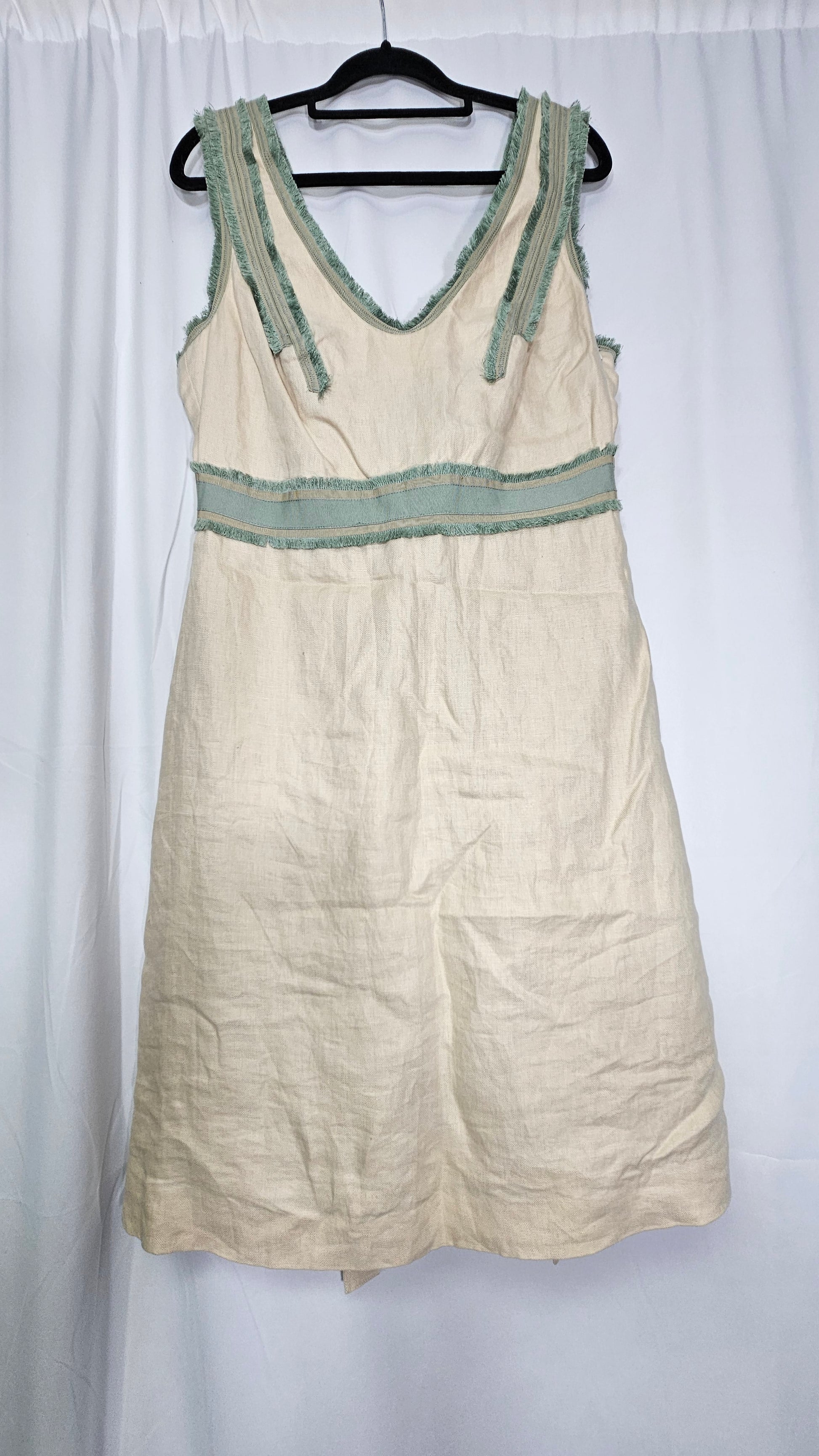 Super Cute Short Dress in beige color with beautiful green details. This dress, sized at 42. Fully lined.