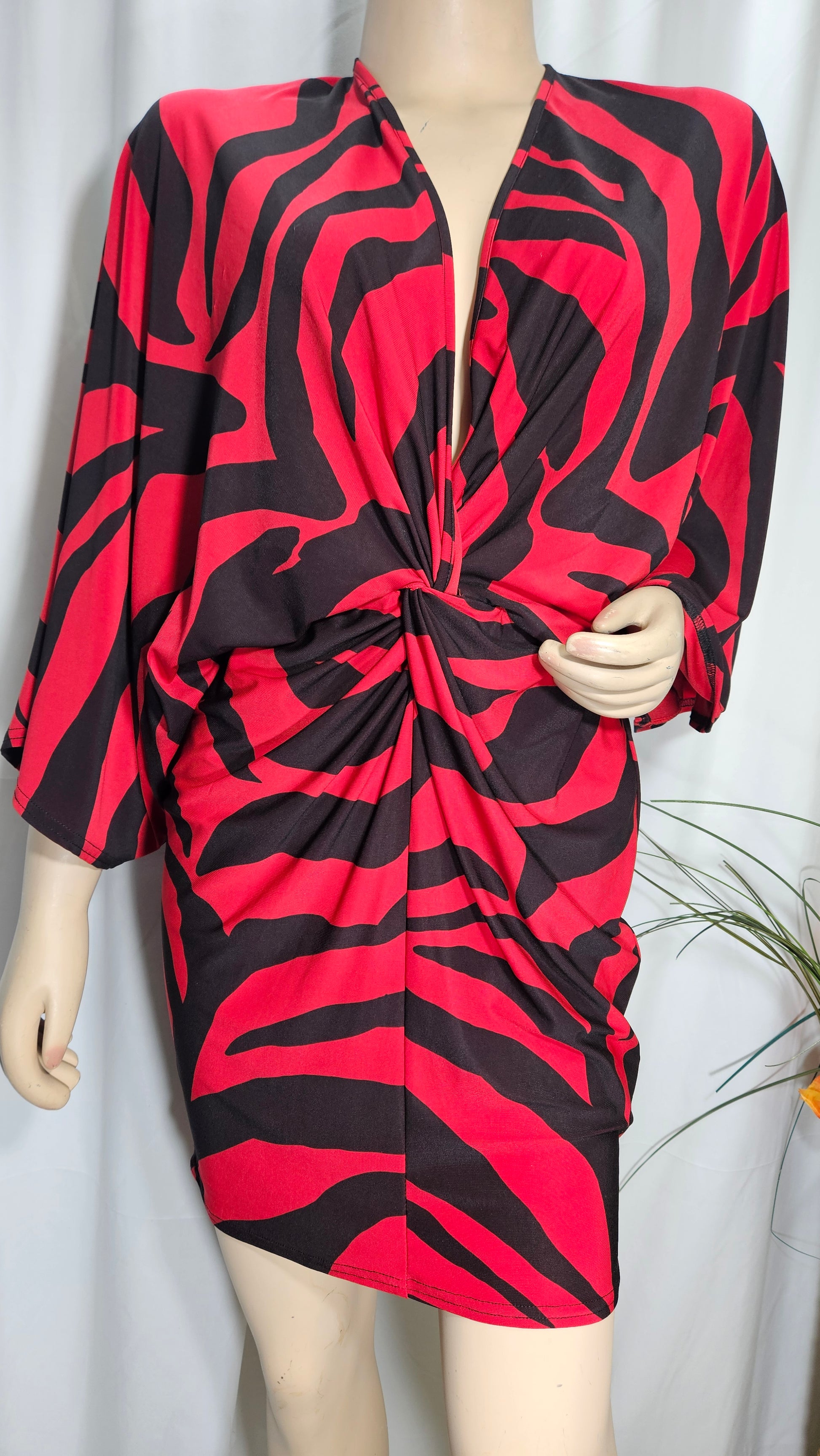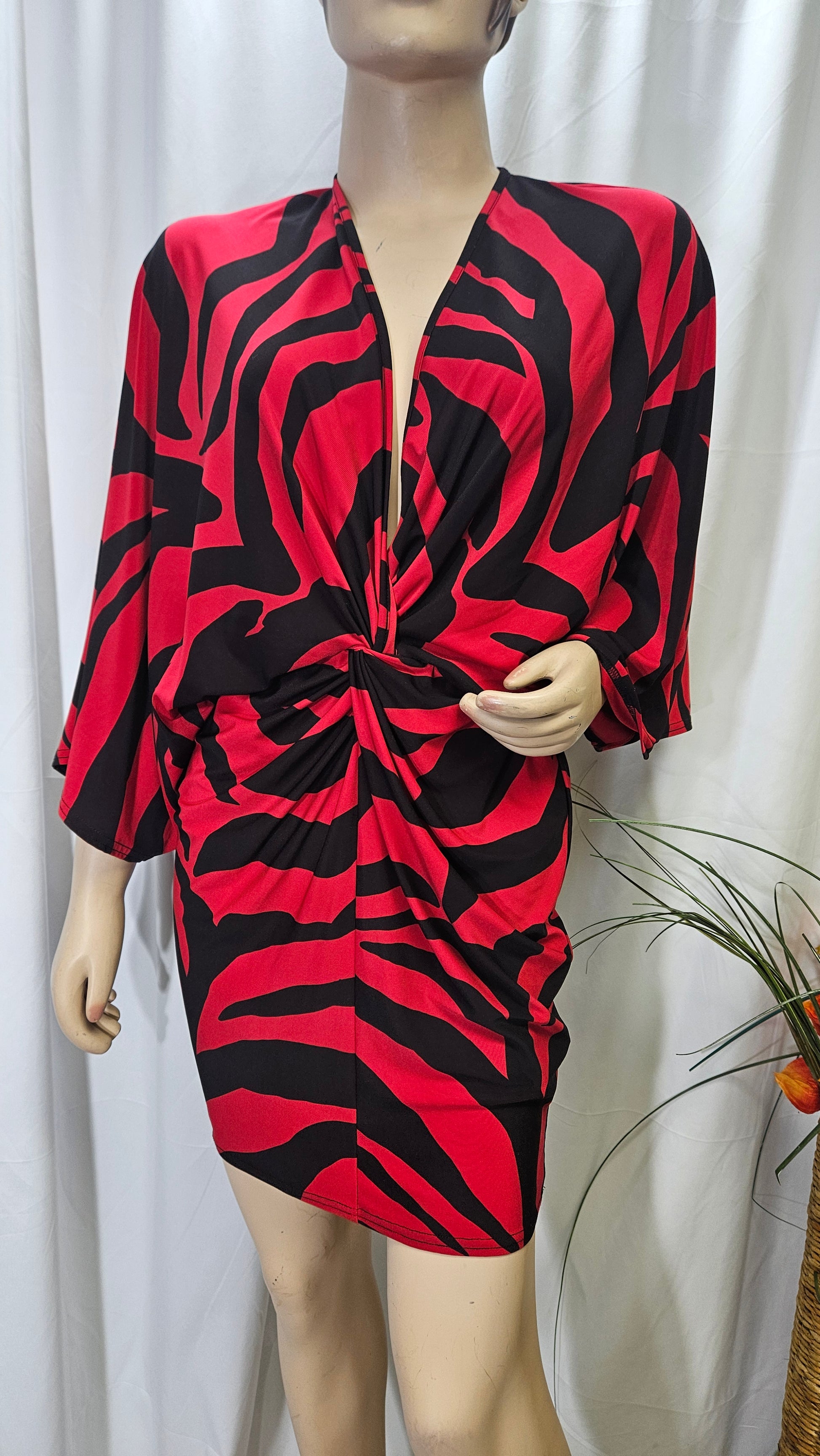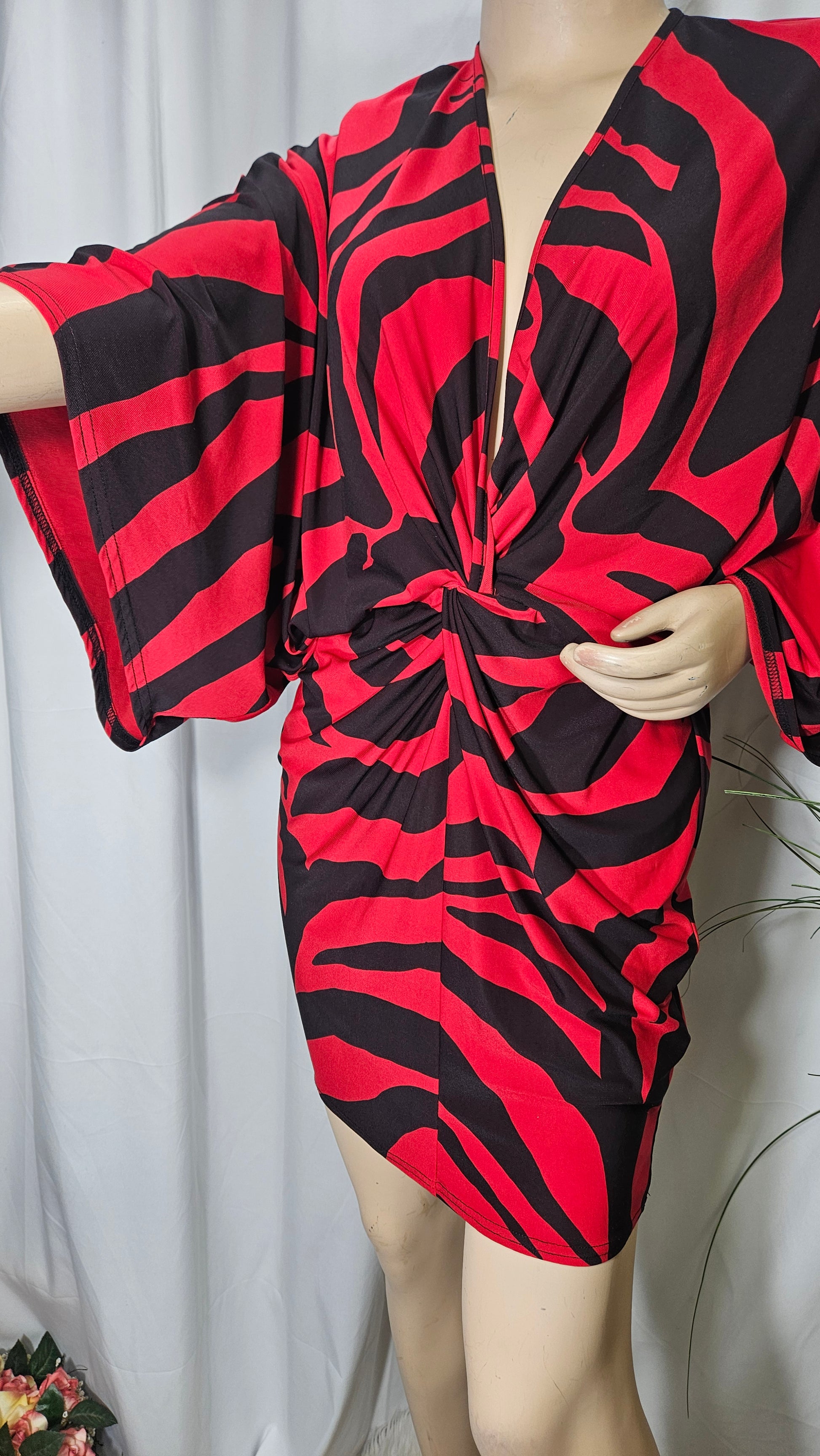Wrap front mini dress in red animal print