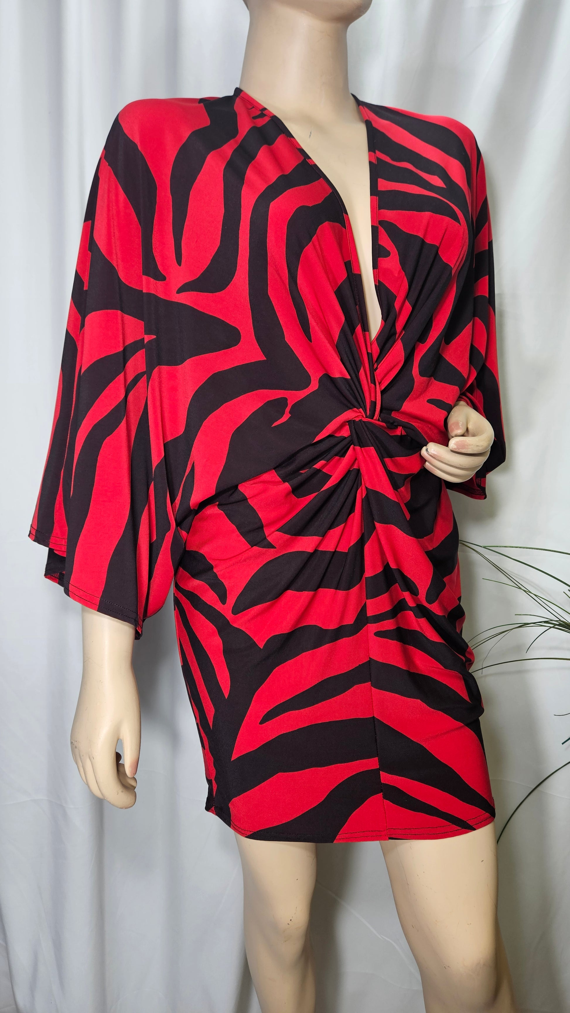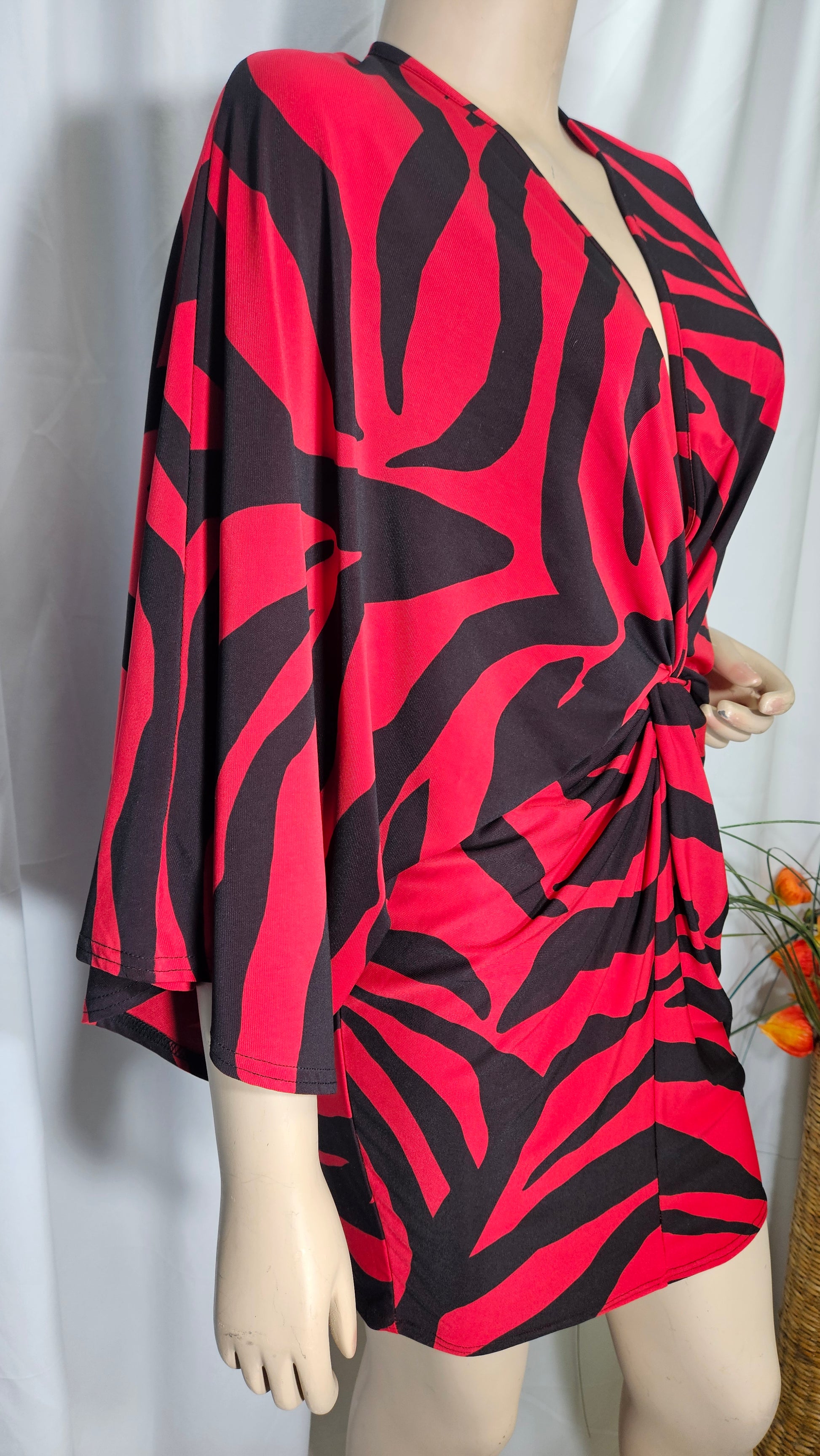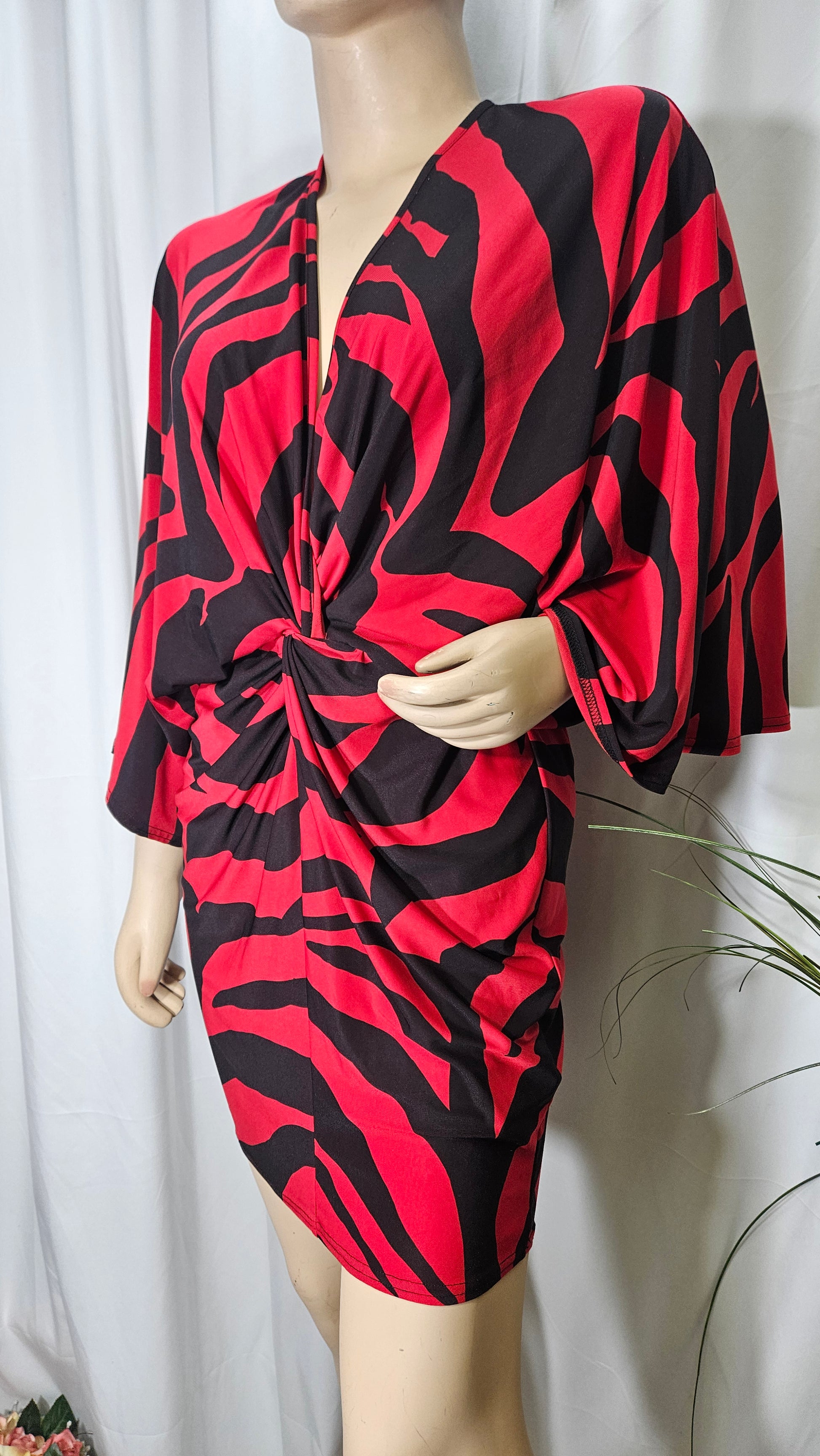 Wrap front mini dress in red animal print