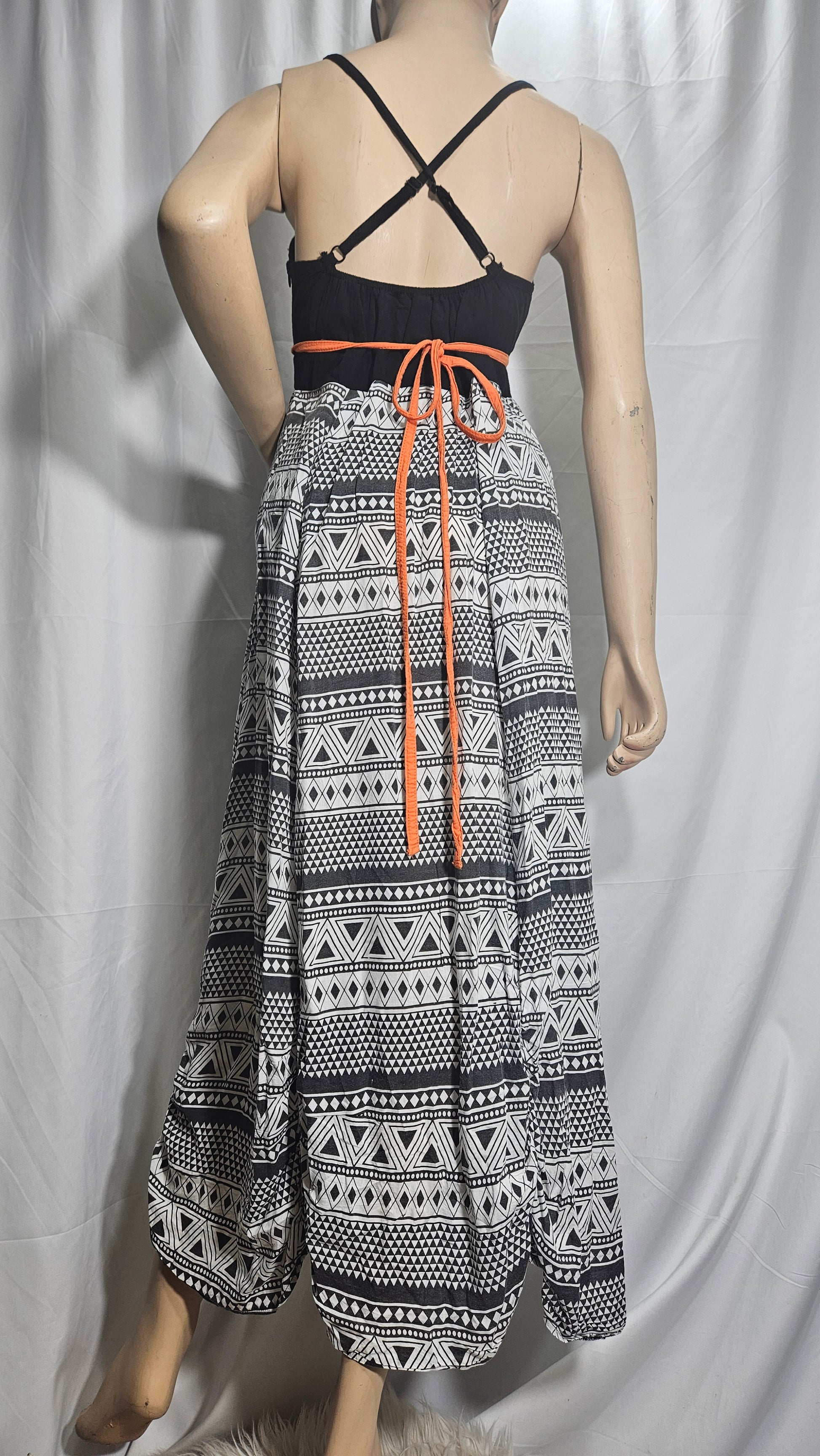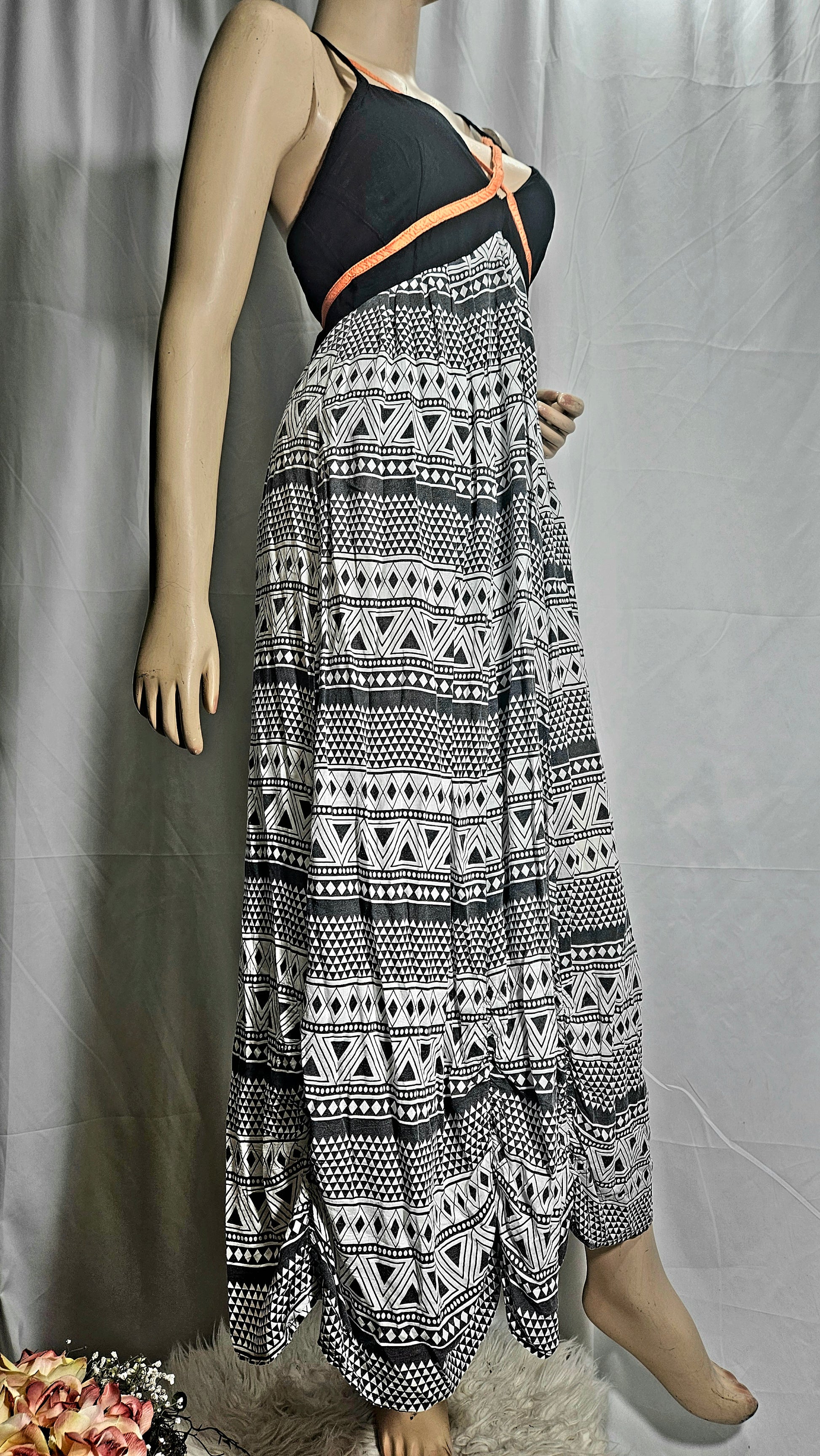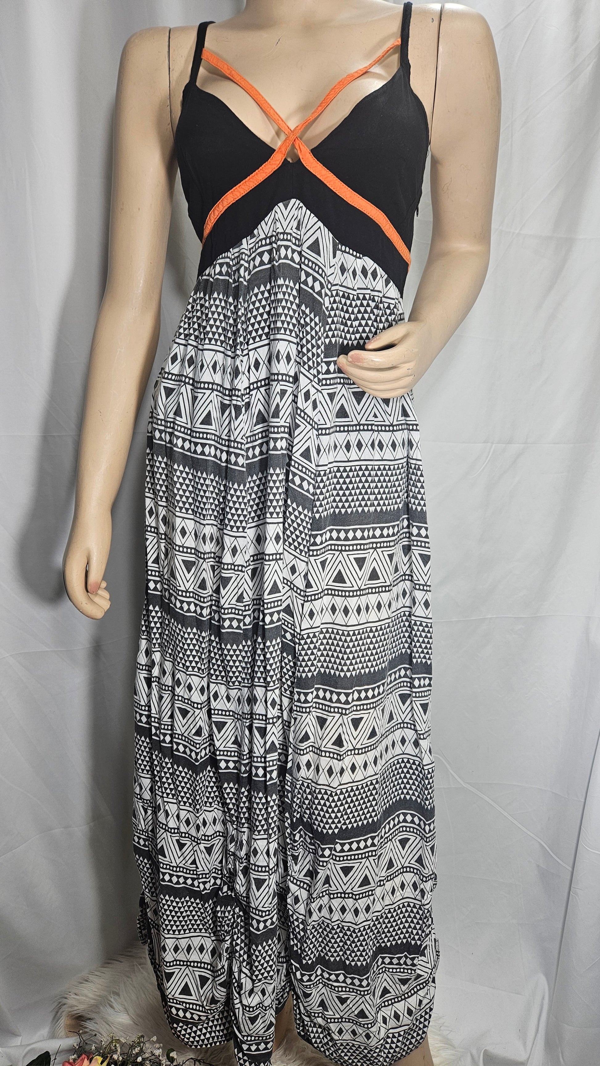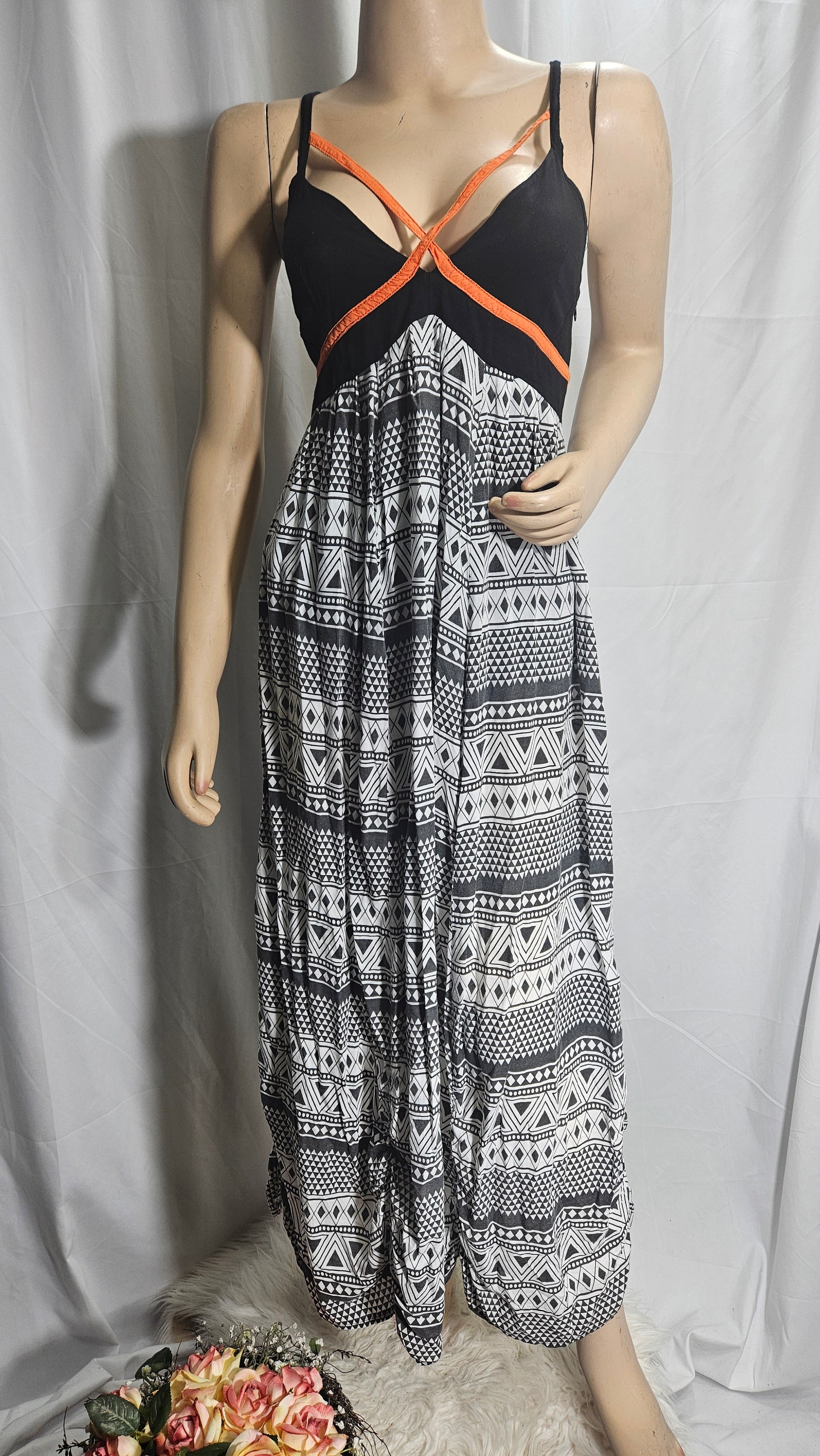 Perfect for summer, size 10. Black and white maxi dress, with orange details. V-neck cut with spaghetti straps and a side zipper. Partially lined.