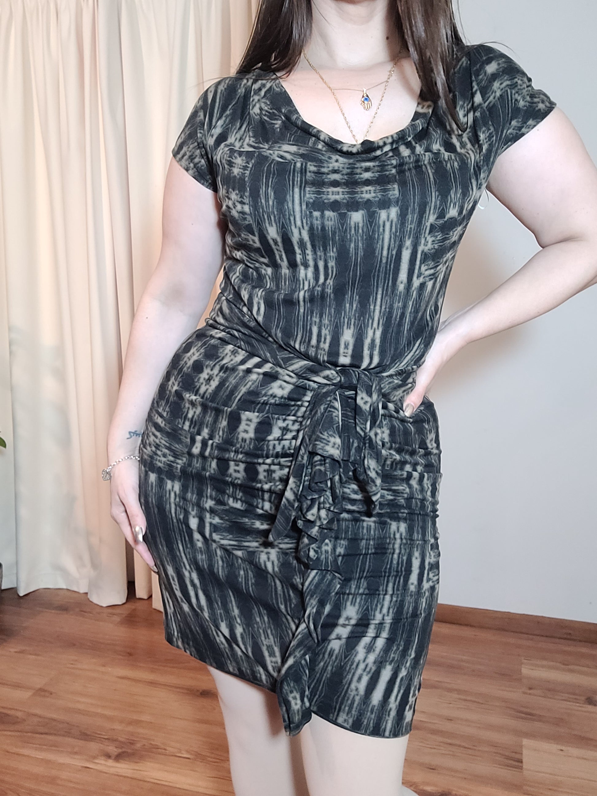 The dress features front ruching detail with a knot, cleverly disguising the tummy.