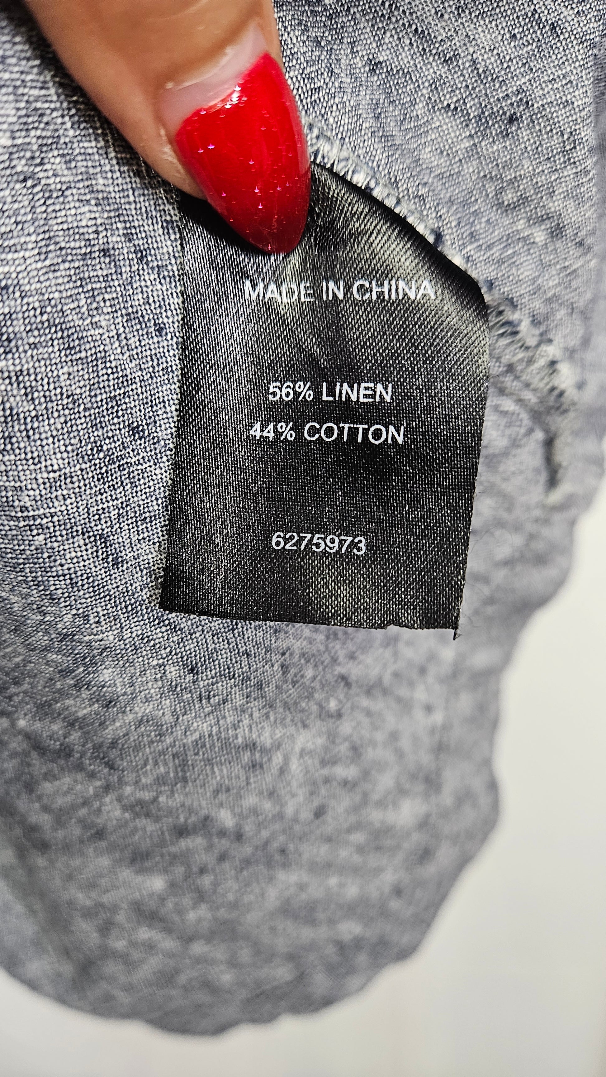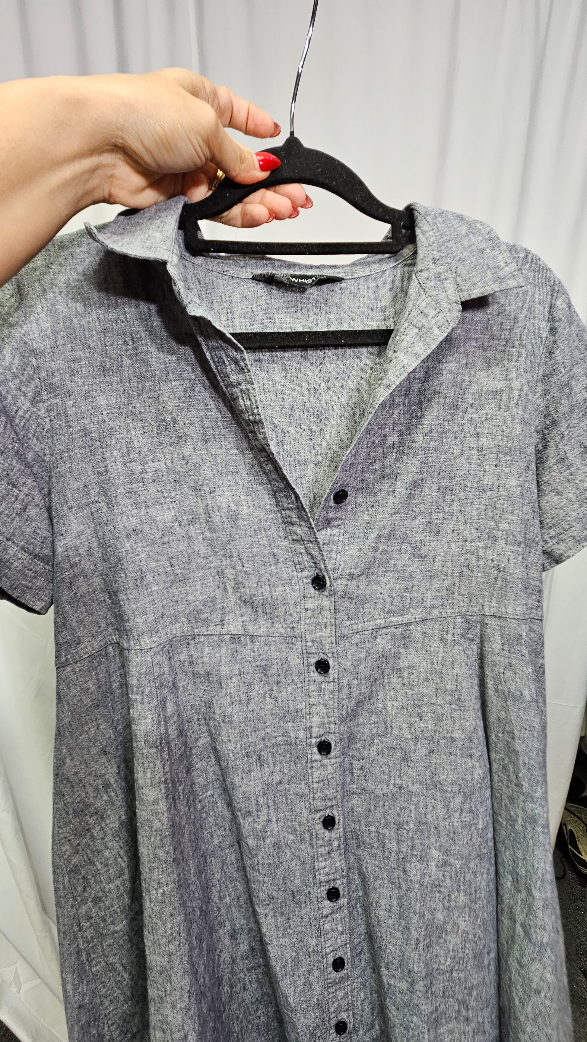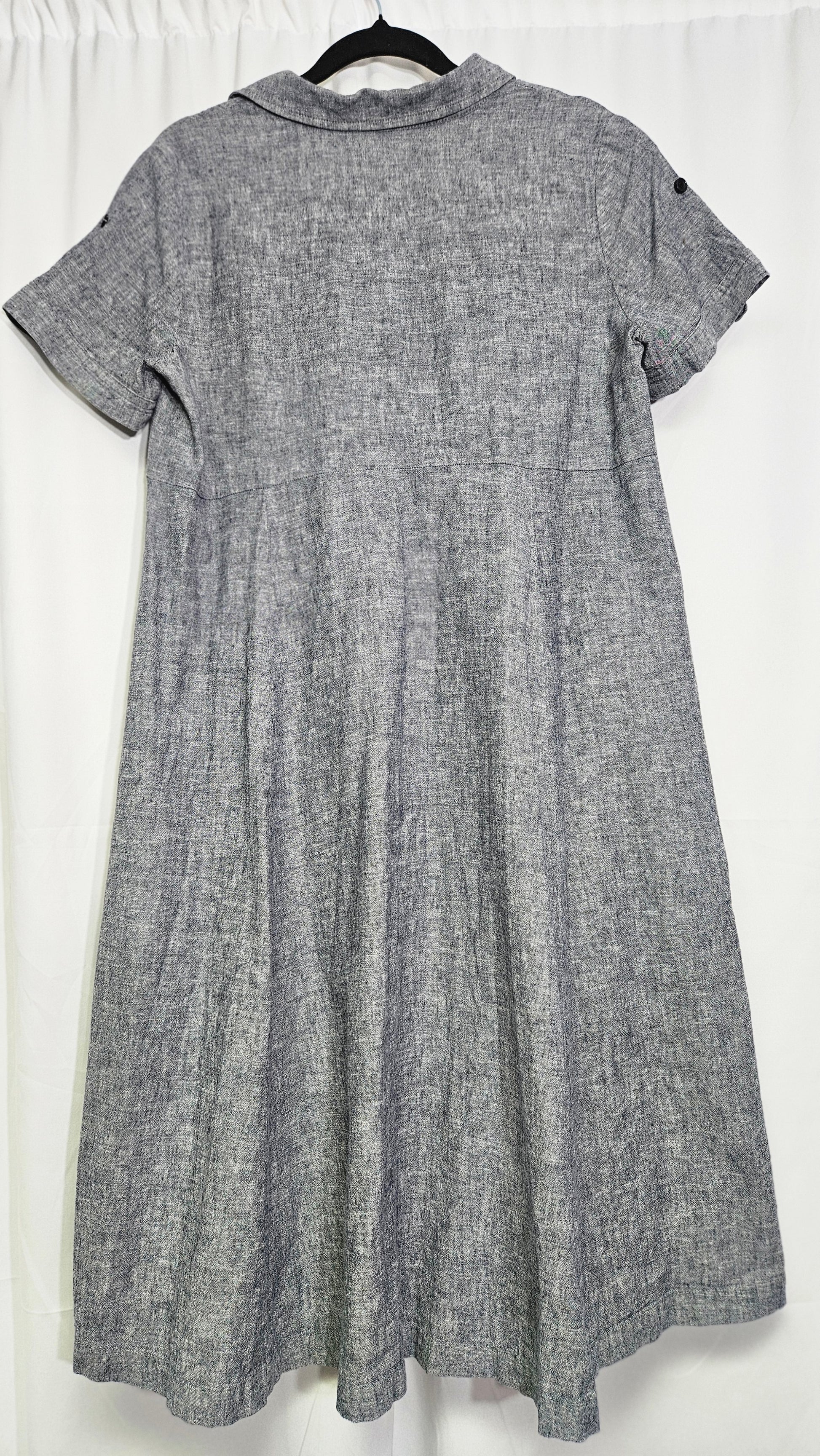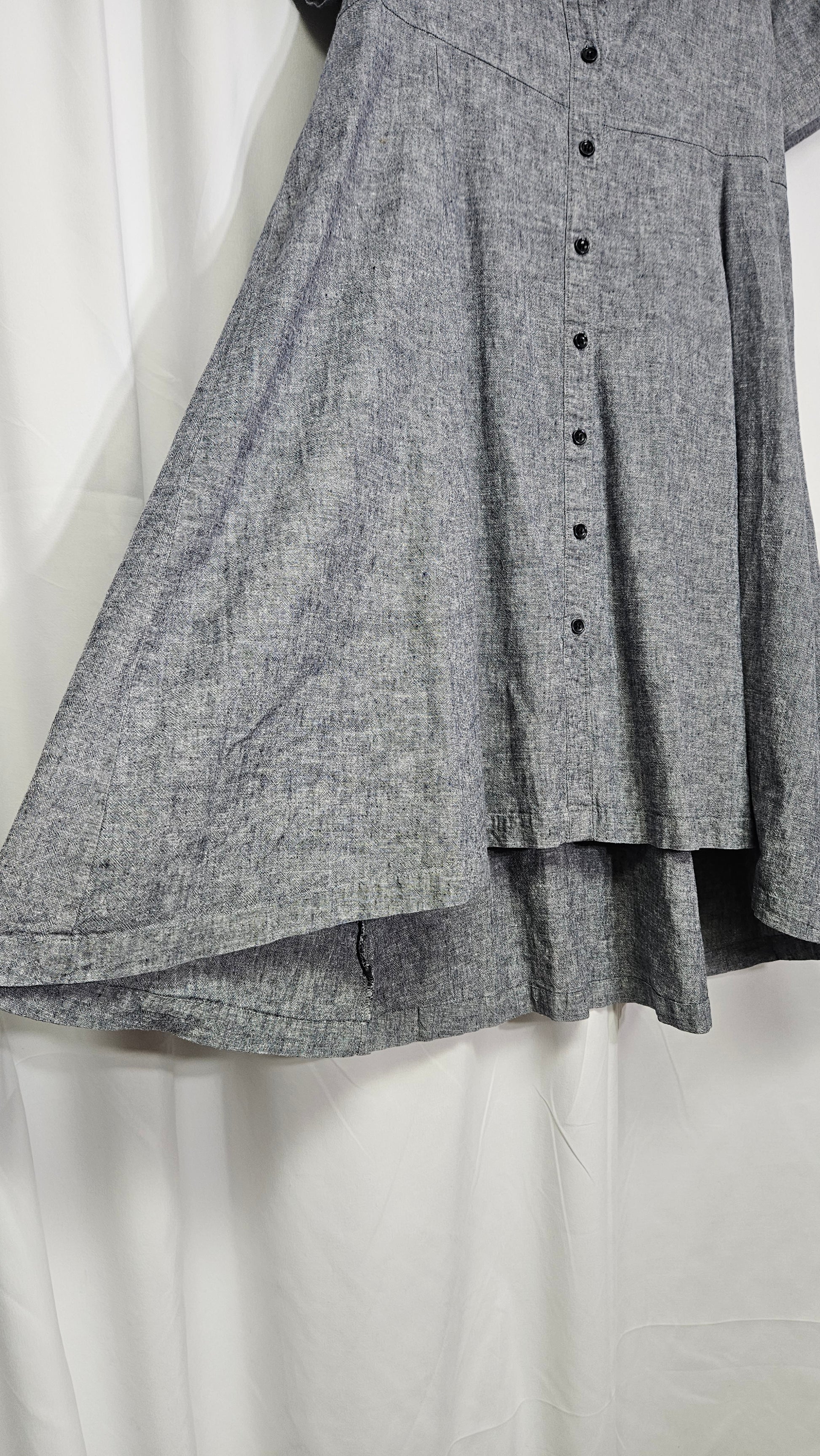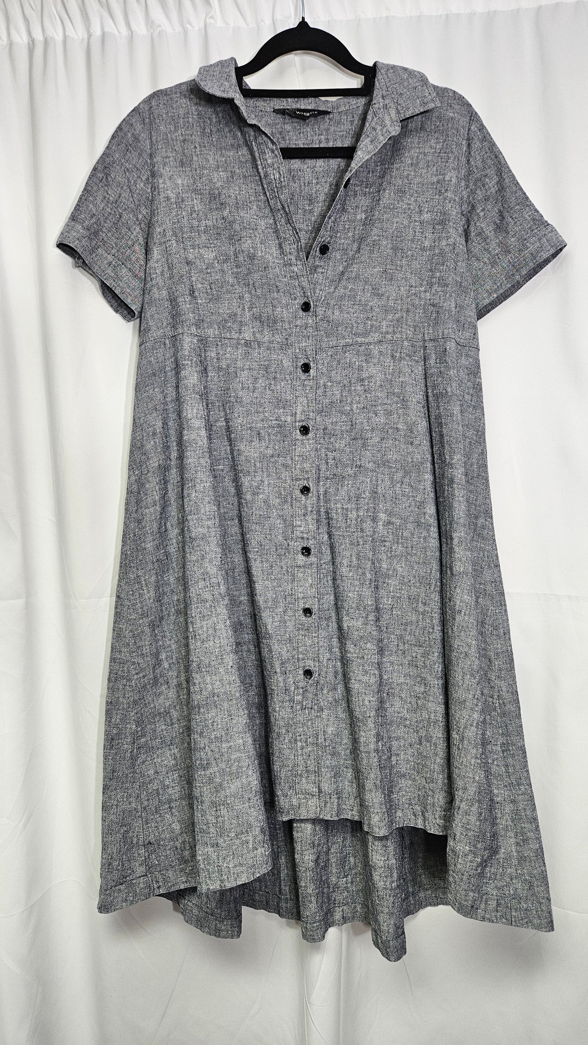 An easy linen-rich dress that's perfect for warm weather. Designed in a classic chambray shade and cut in an effortless swing silhouette with a dipped hem, this short sleeved style features a notch neckline, working button placket and longer hem at back.