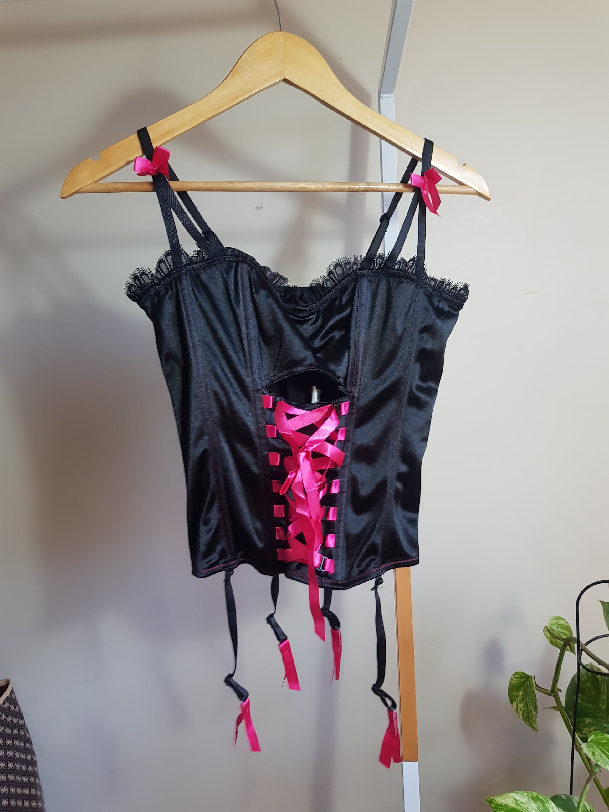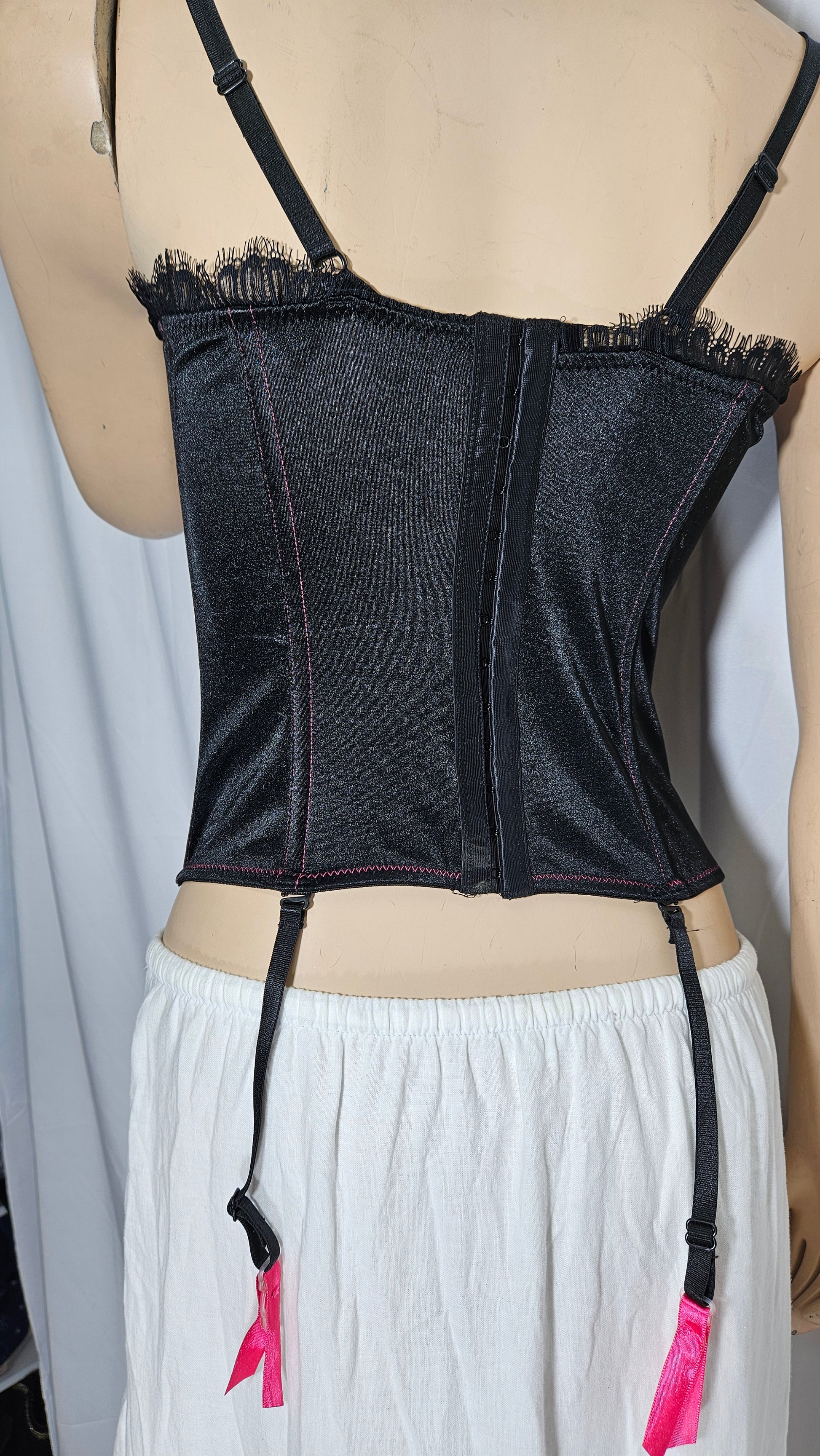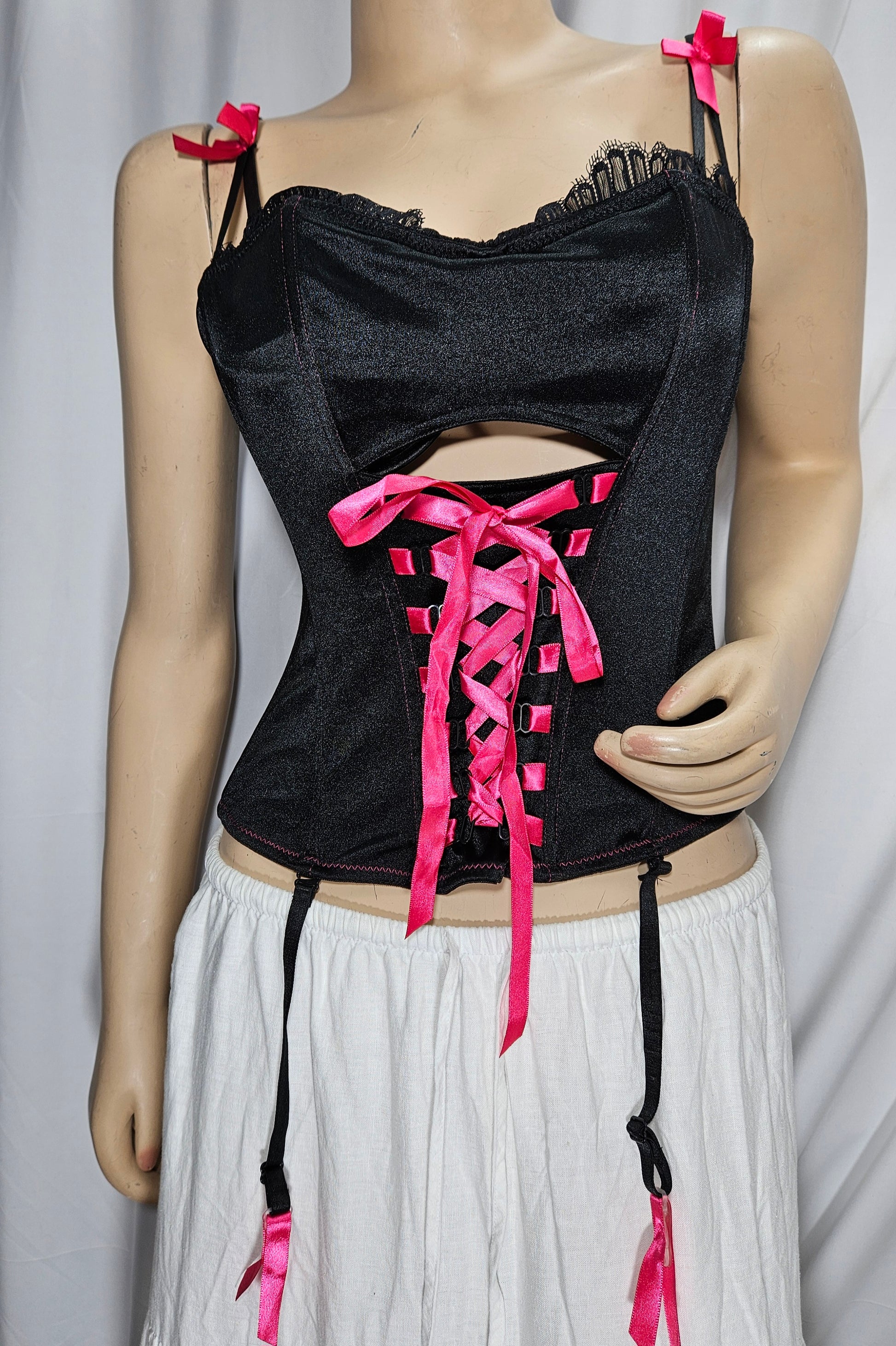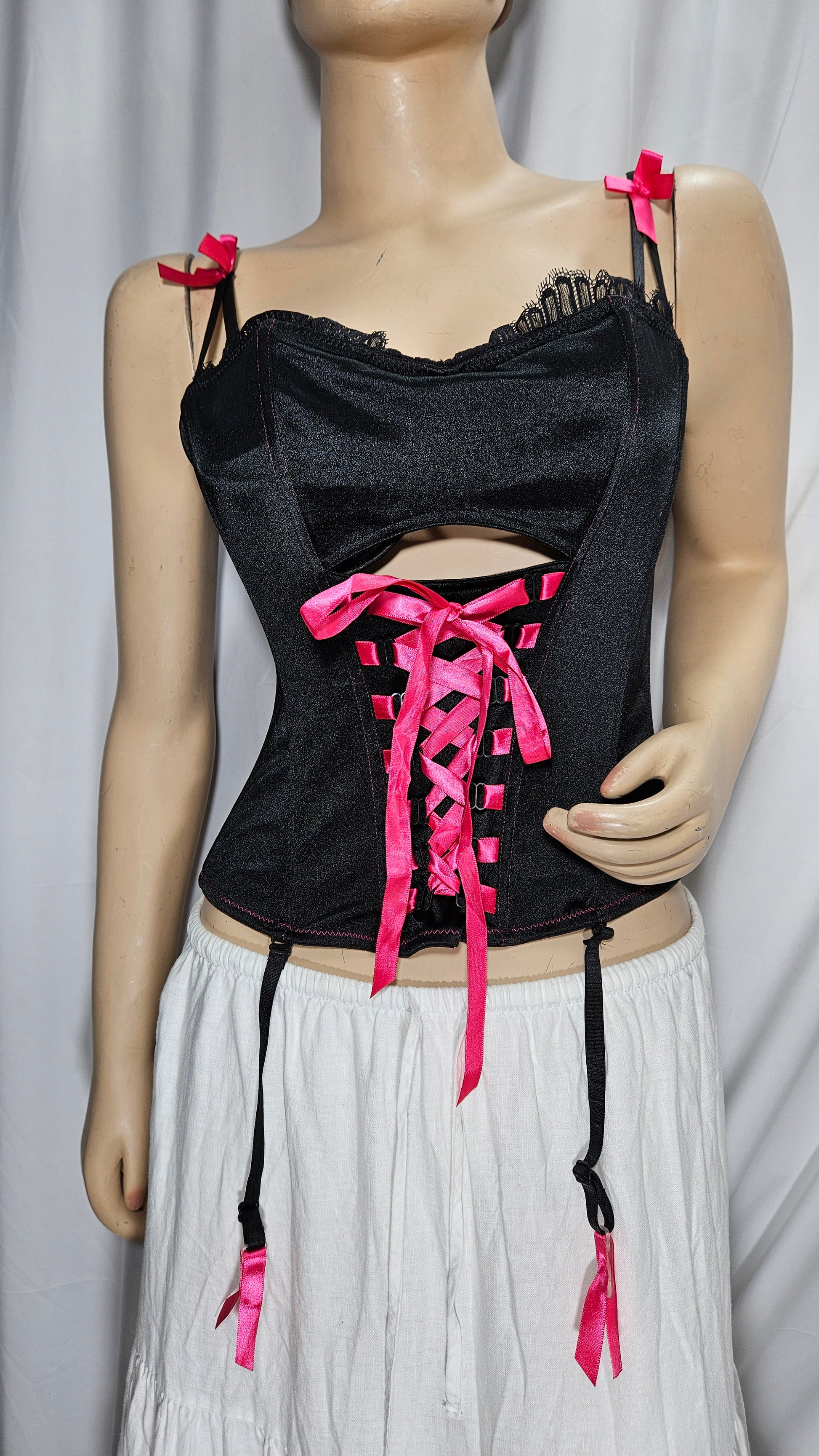 Absolutely stunning Y2K black corset with hot pink ribbon lacing & bows, omplete with boned bodice.
