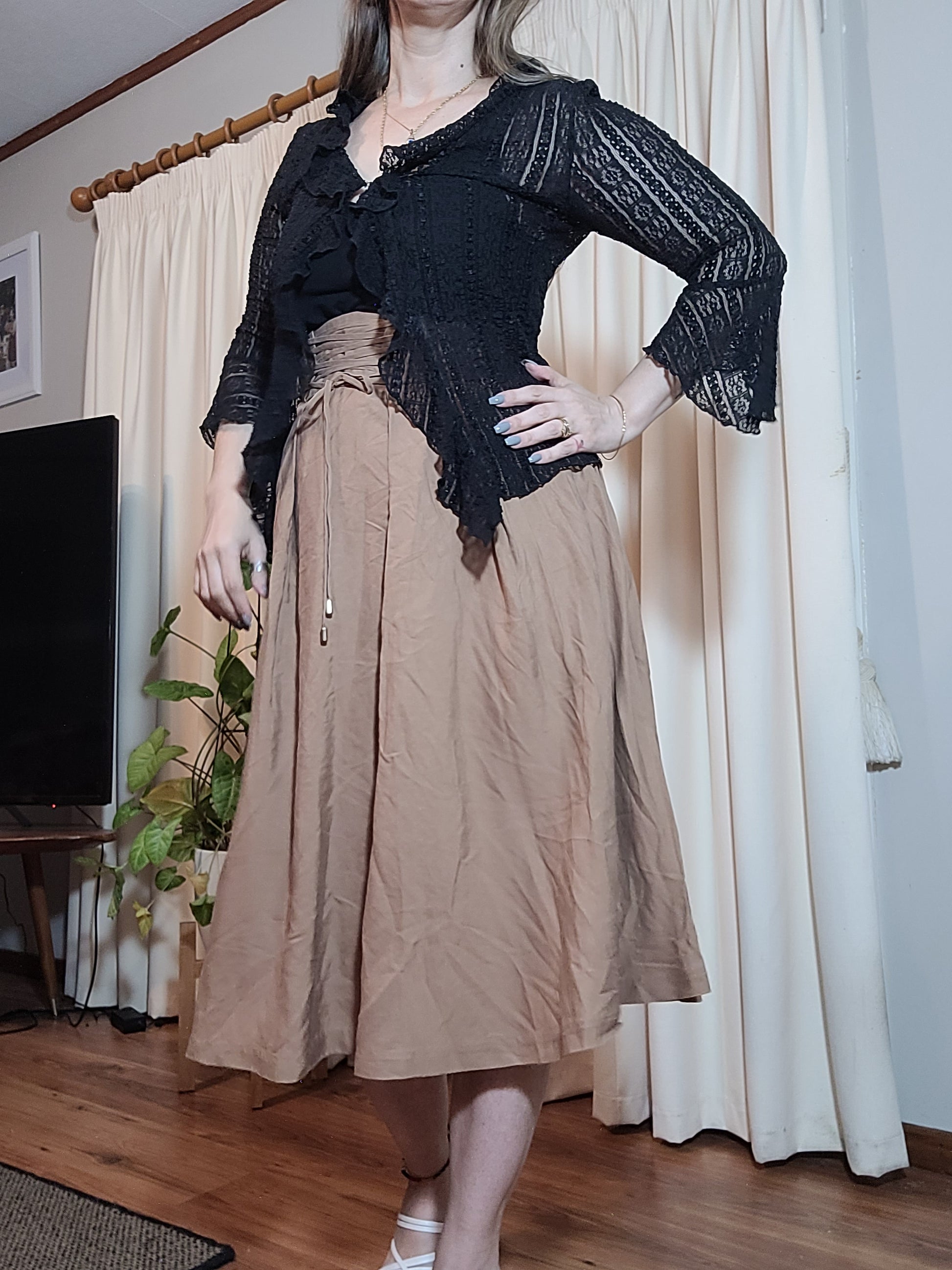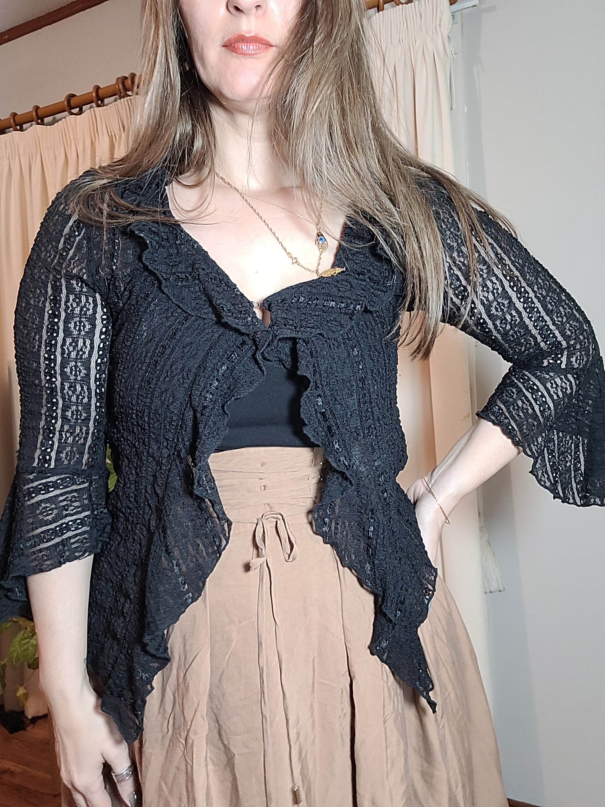 A staple that every bohemian Queen needs in her wardrobe. Spread your wings, butterfly Absolutely stunning black lace 3/4 flare sleeves Top. Ruffle collar cardi & asymmetrical sheer design. super cute! It belongs to my personal collection however I don't wear it much, last time I wore it was for photoshoot of my pregnancy (see pic)