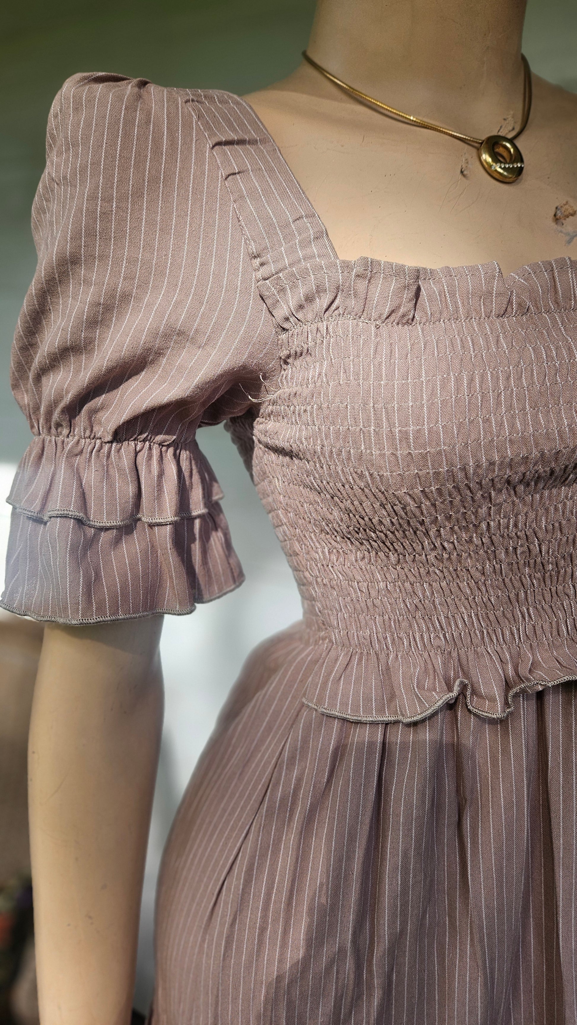 Lovely Tiered Midi Dress in Brown with beautiful romantic puff sleeves design.