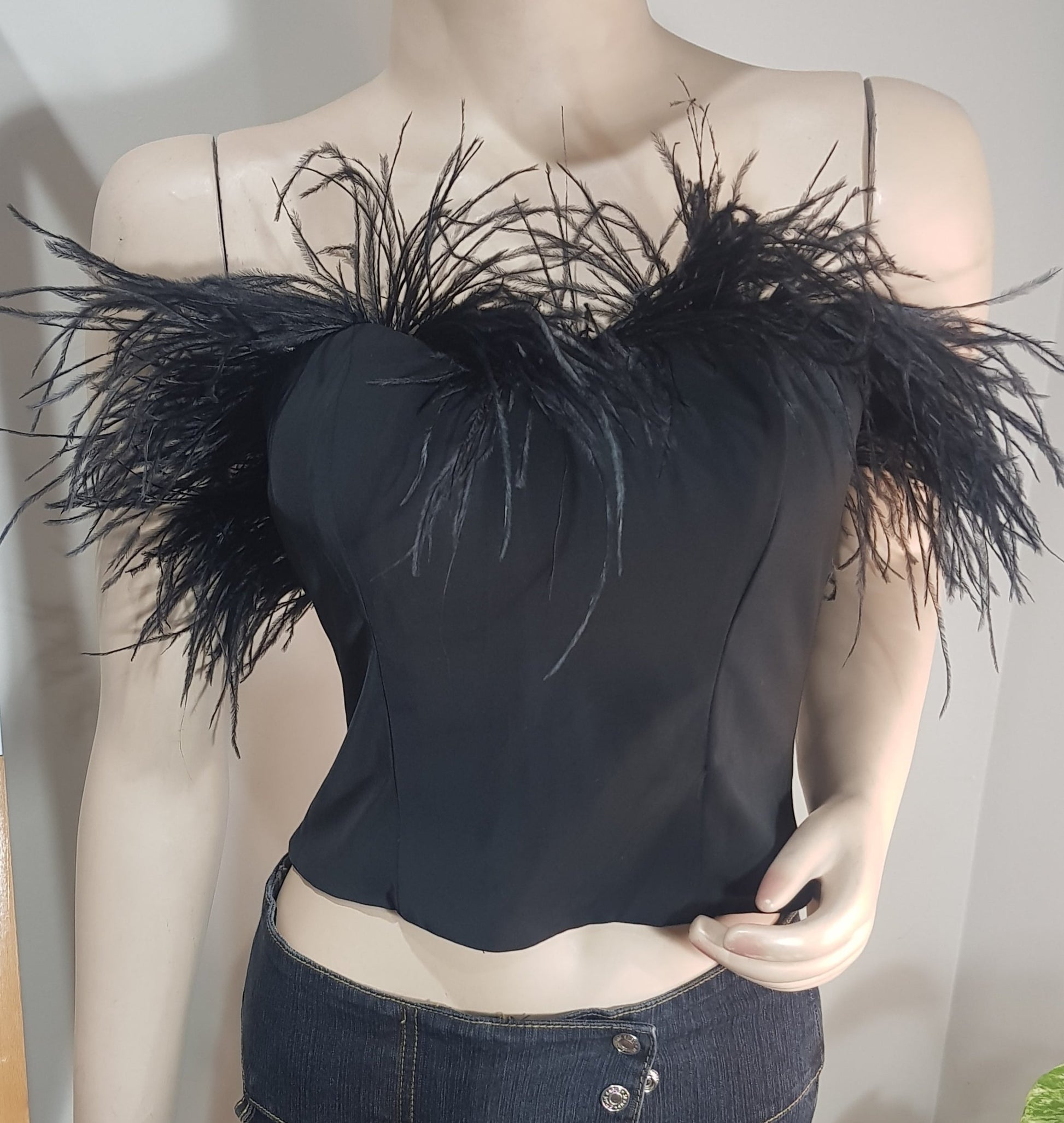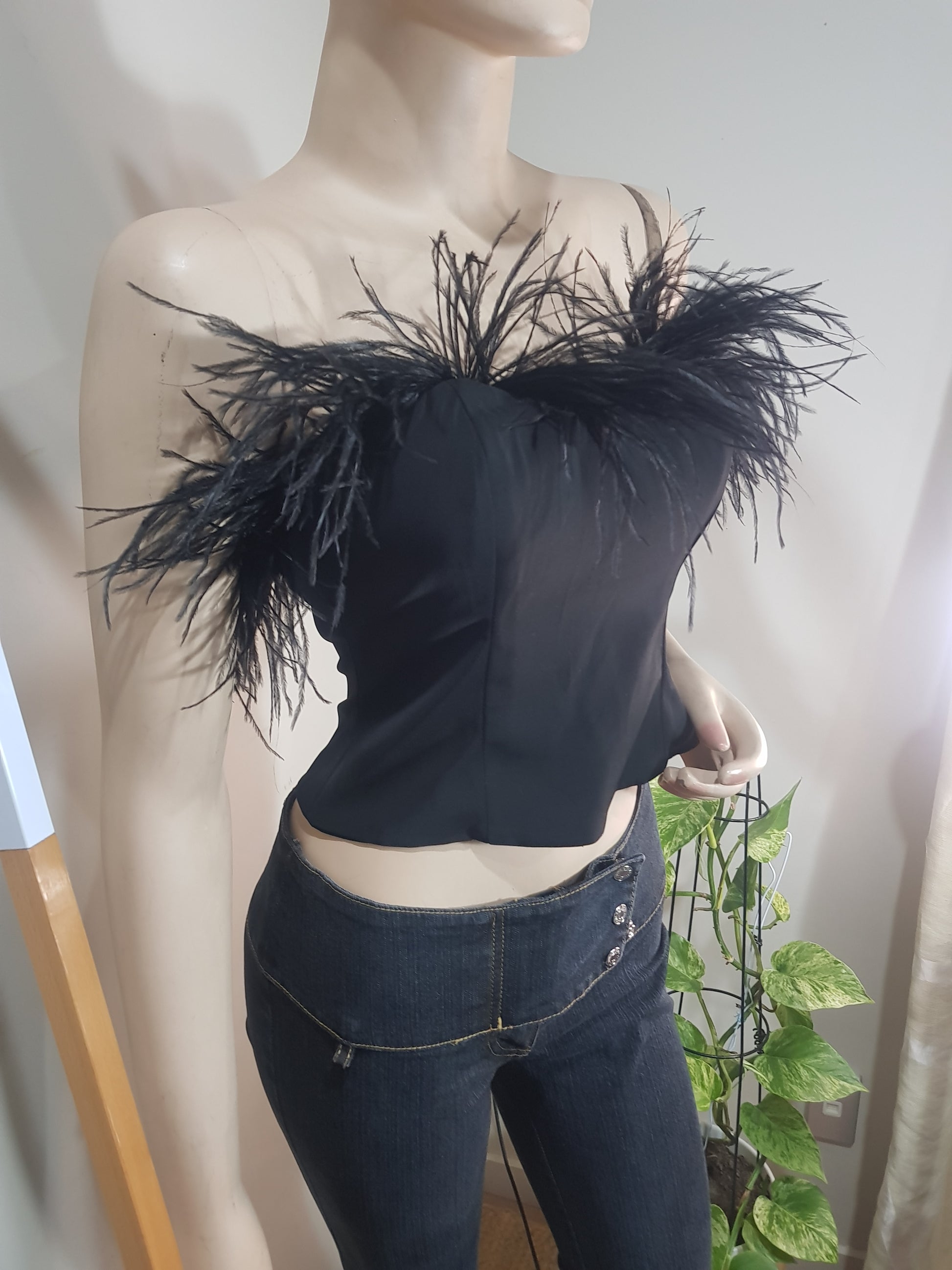 Lovely Aida feather Crop Top. Size XS. Felt applique and feather trim accents. Boned bodice. Hidden back zipper closure. 100% poly. Lining: 97% poly, 3% spandex. Hand wash cold.
