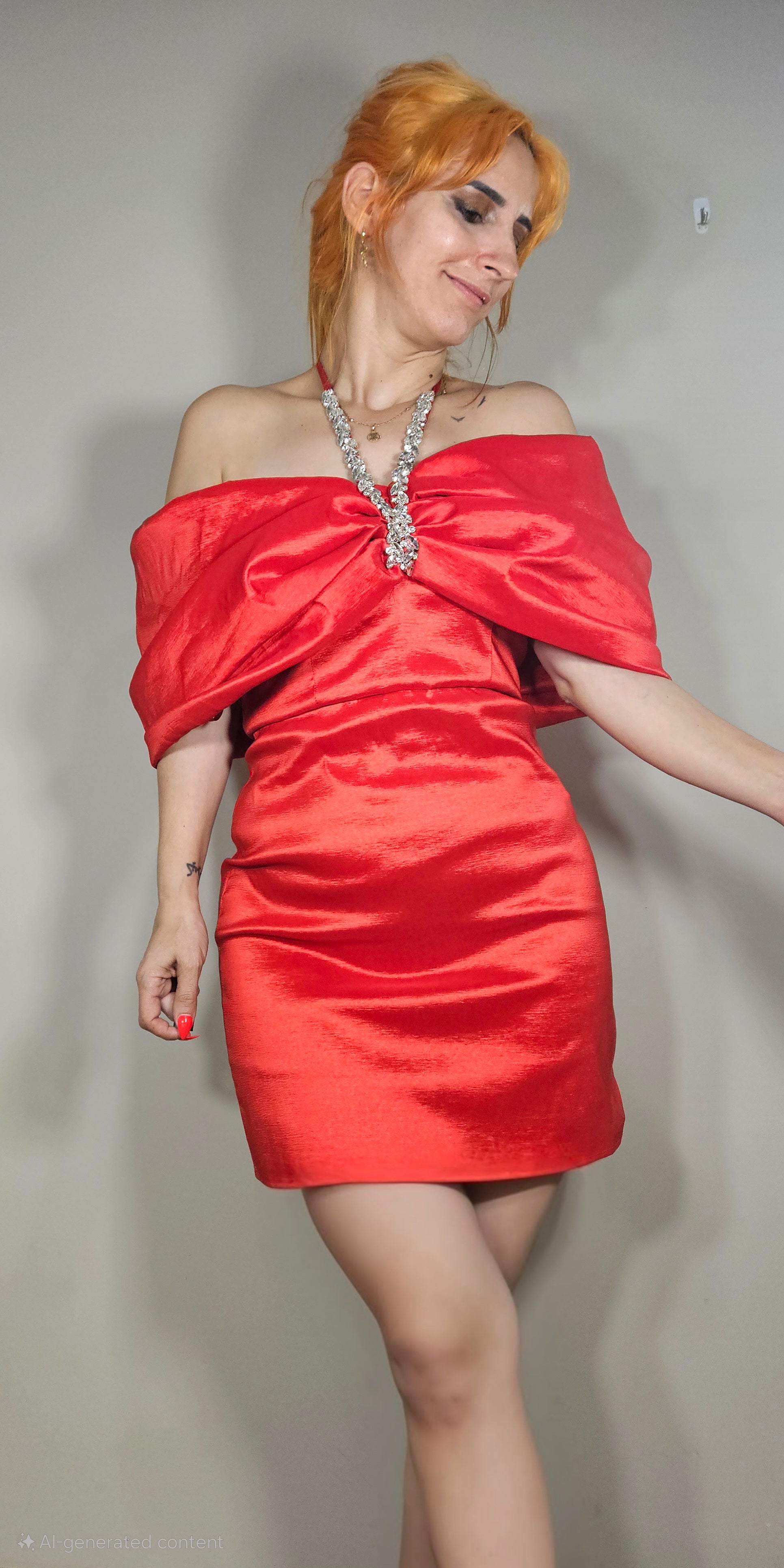 This off-the-shoulder masterpiece exudes a passion for fashion that's out of this world! This dress is a true work of art, featuring draped details, a bow-inspired silhouette, and a sleek back zipper closure. Plus, it has a stunning tie-neck bow adorned with sparkling embellishments and is made from stretch fabric for a comfortable and flattering fit.