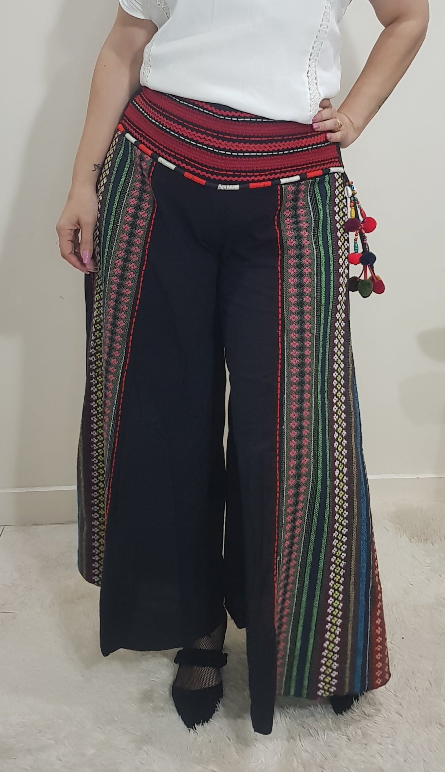 Extremely gorgeous wide palazzo pants now available at our thrift store. With some gorgeous embroidery details and artisanal pendants.