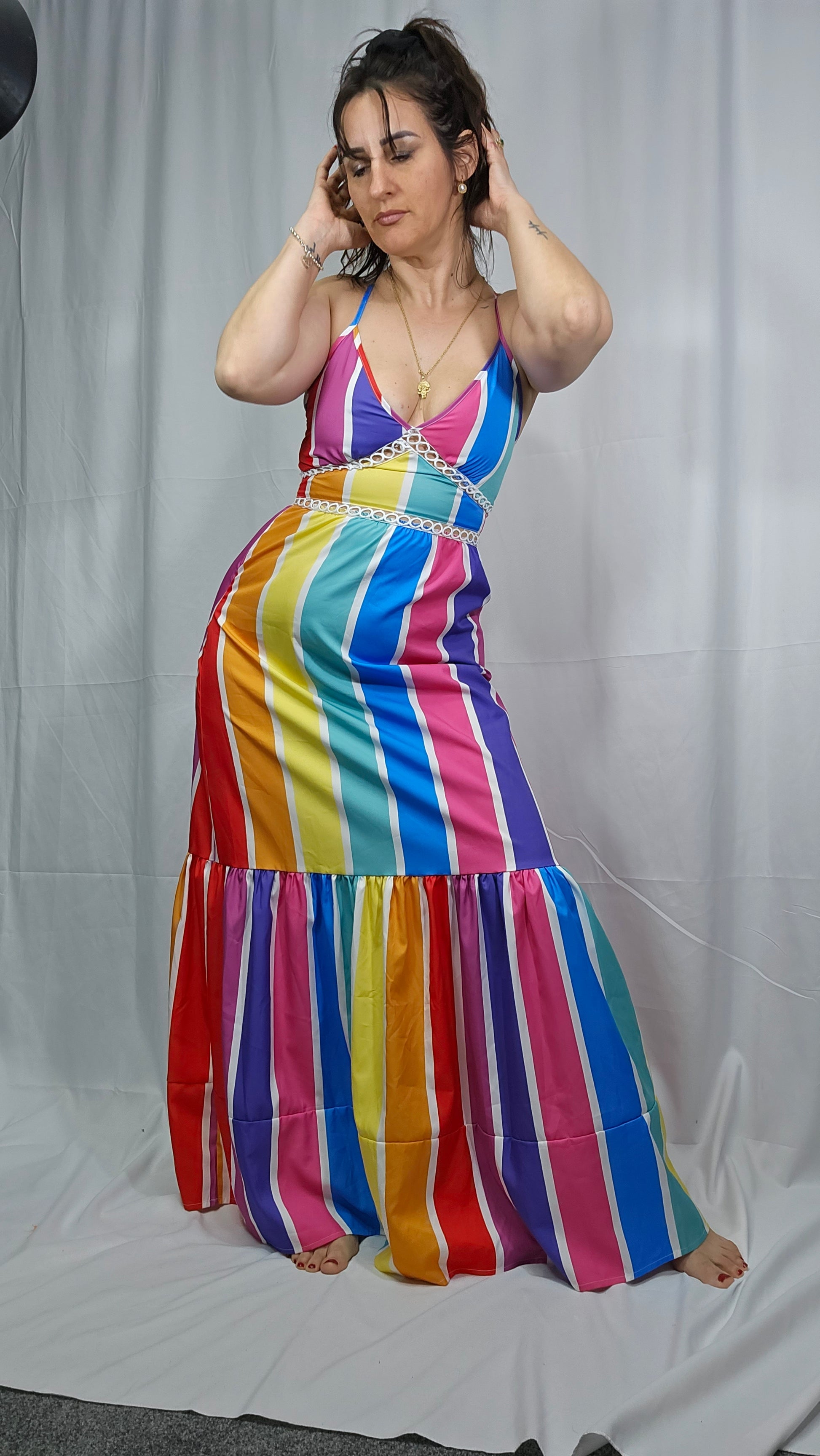 Refresh your style this summer with this multi color spaghetti strap maxi dress is perfect for many summer occasions.