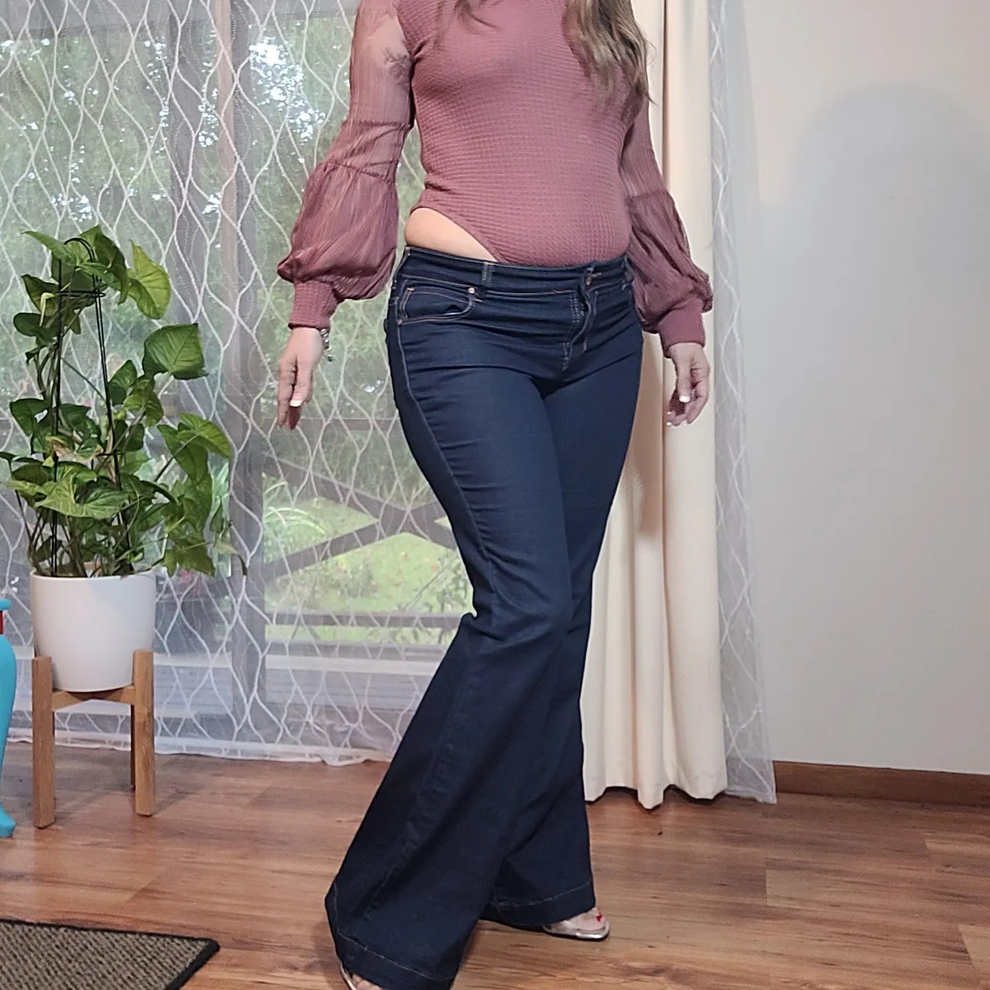 Authentic Saltan pepa Oxford flared jean, size 32, made in Argentina, stretch fabric, super cool retro style with low waist.