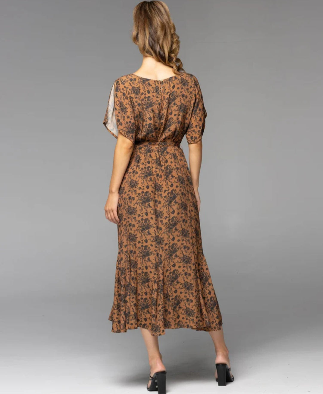 Features a soft V-neck, short flutter sleeves adorned with a delicate split detail, and falls gracefully to a midi length.