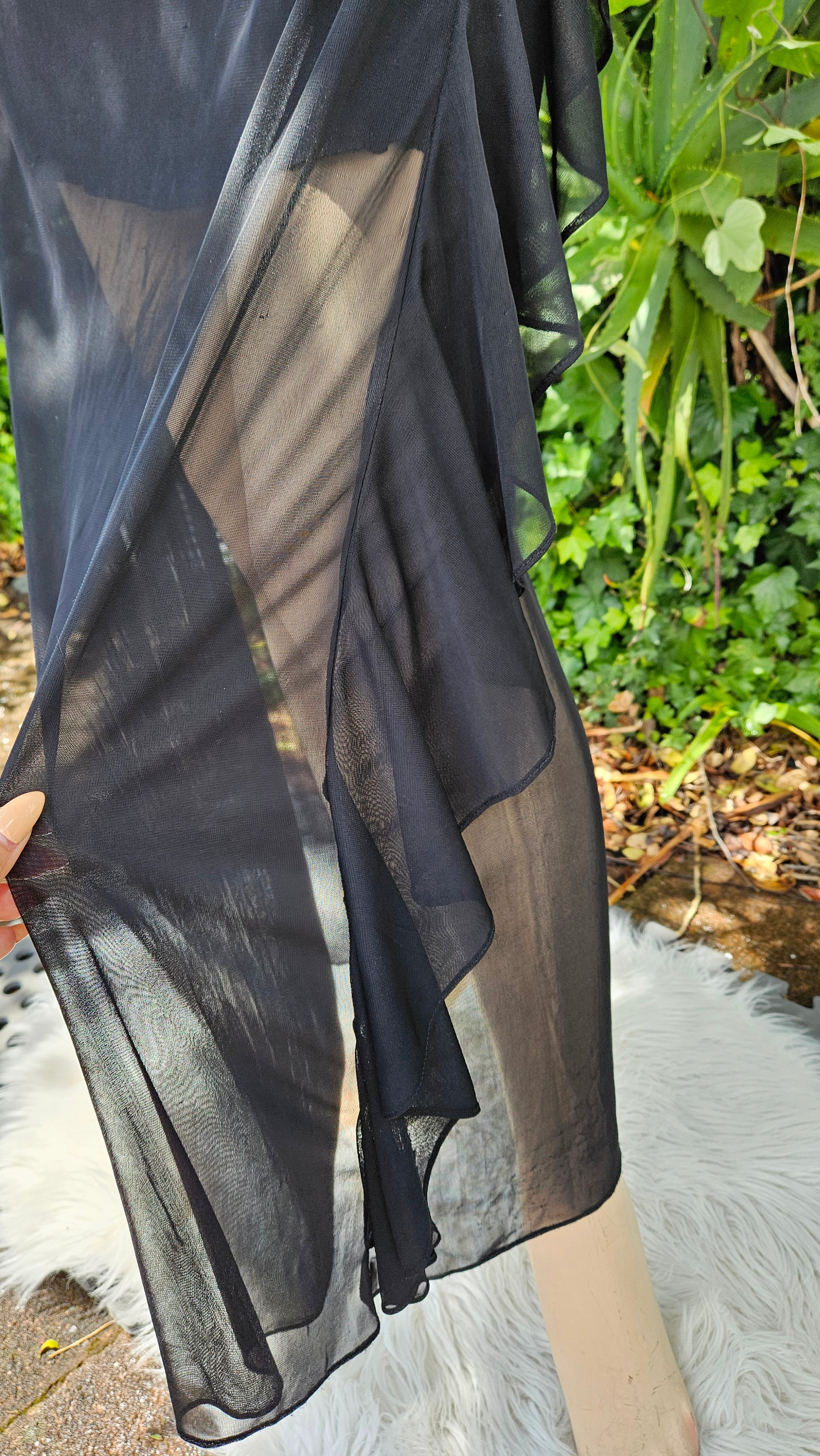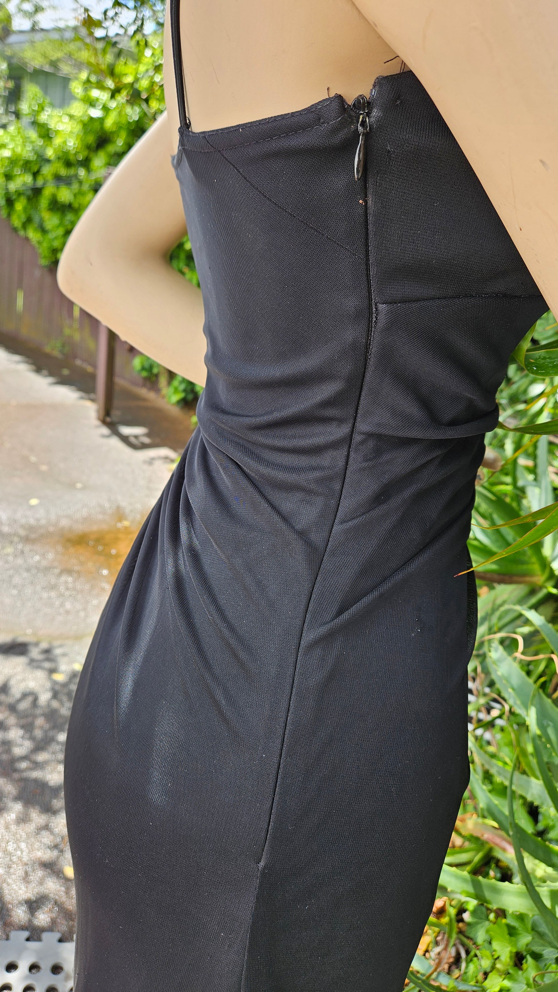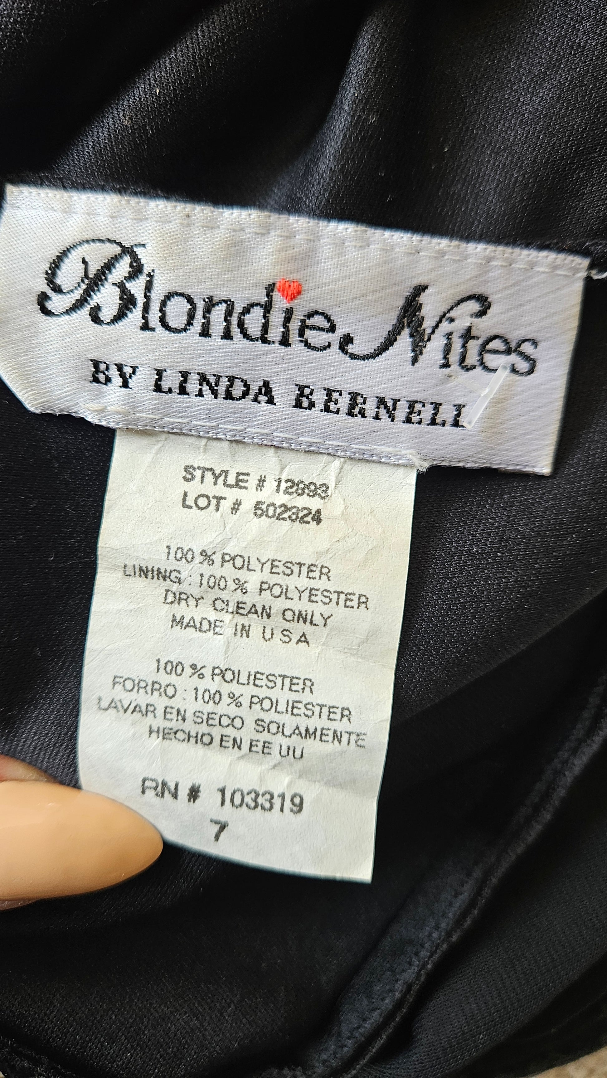 Stunning Vintage dress in a split style and a ruffled side with a gorgeous diamonds brochure in front for your evening elegance. It is crafted from medium-stretch fabric and a see-through fabric on top, has a slim cut in an ultra-flattering slim fit. This Blondies Nites brand by Linda Bernell piece is made in USA and comes in a vintage size 7 (8-10 woman). While preloved, it's still in good condition, with some pull and signs of wear but still some life left. The inner was cut to make the dress shorter.