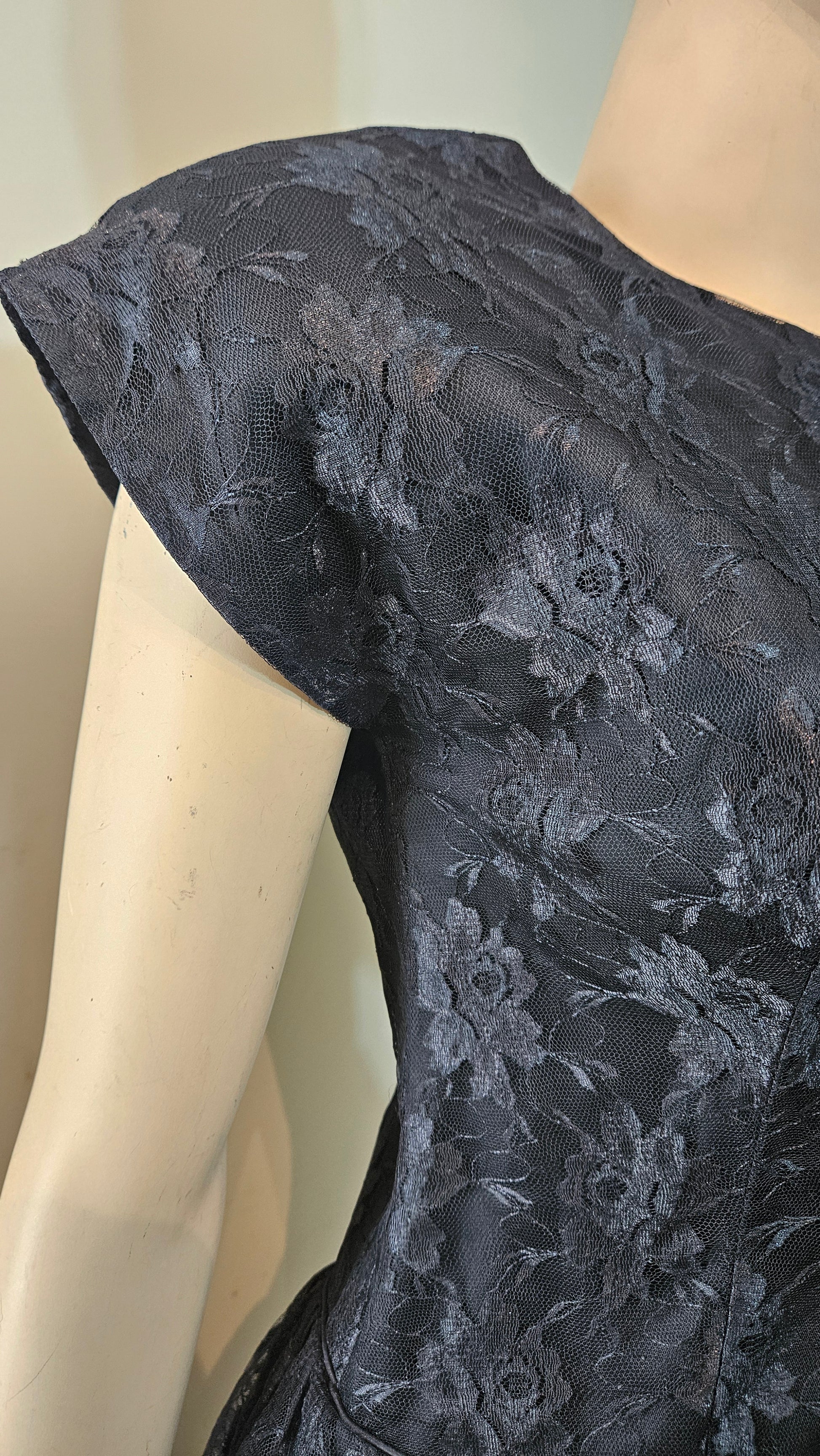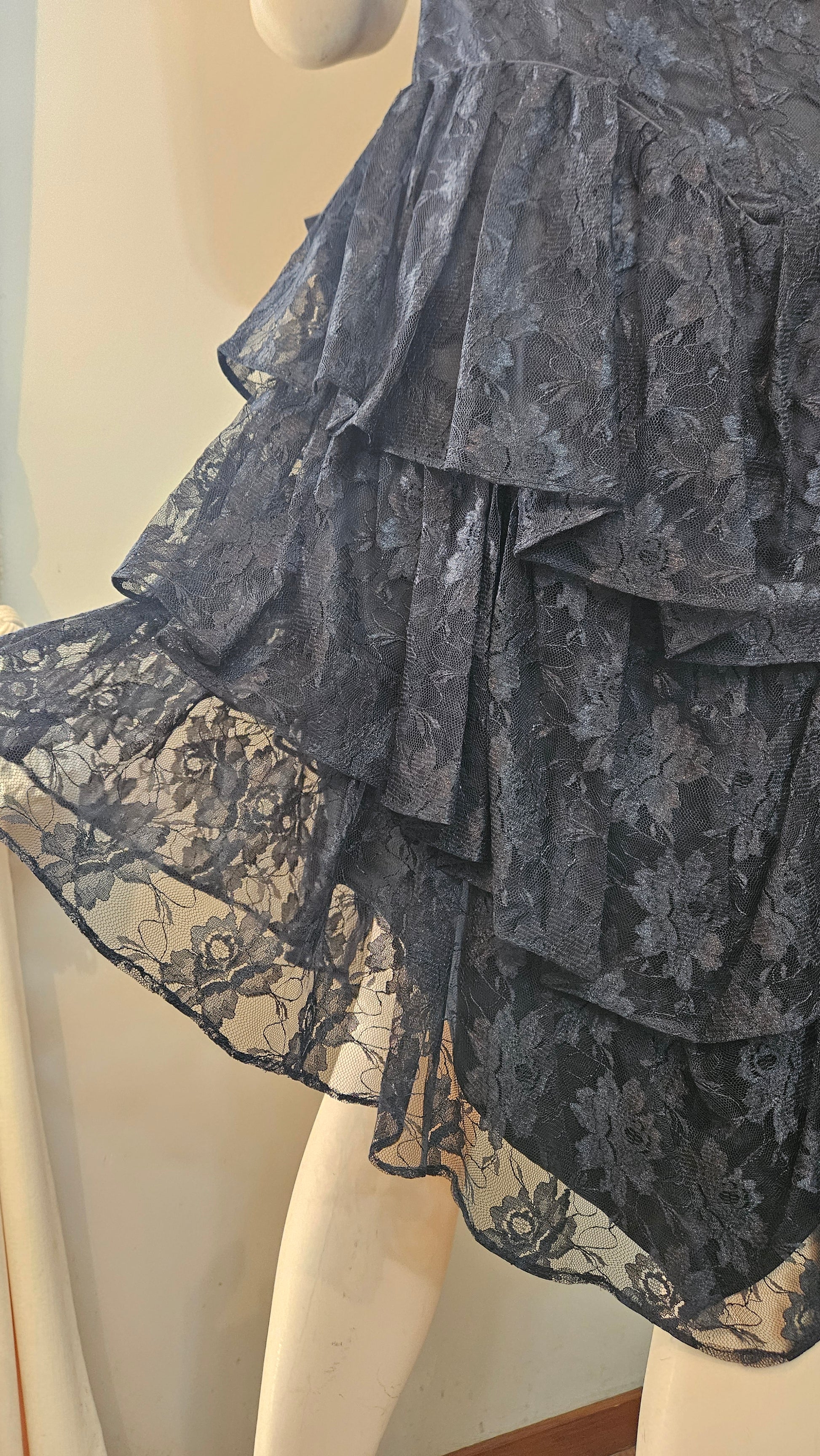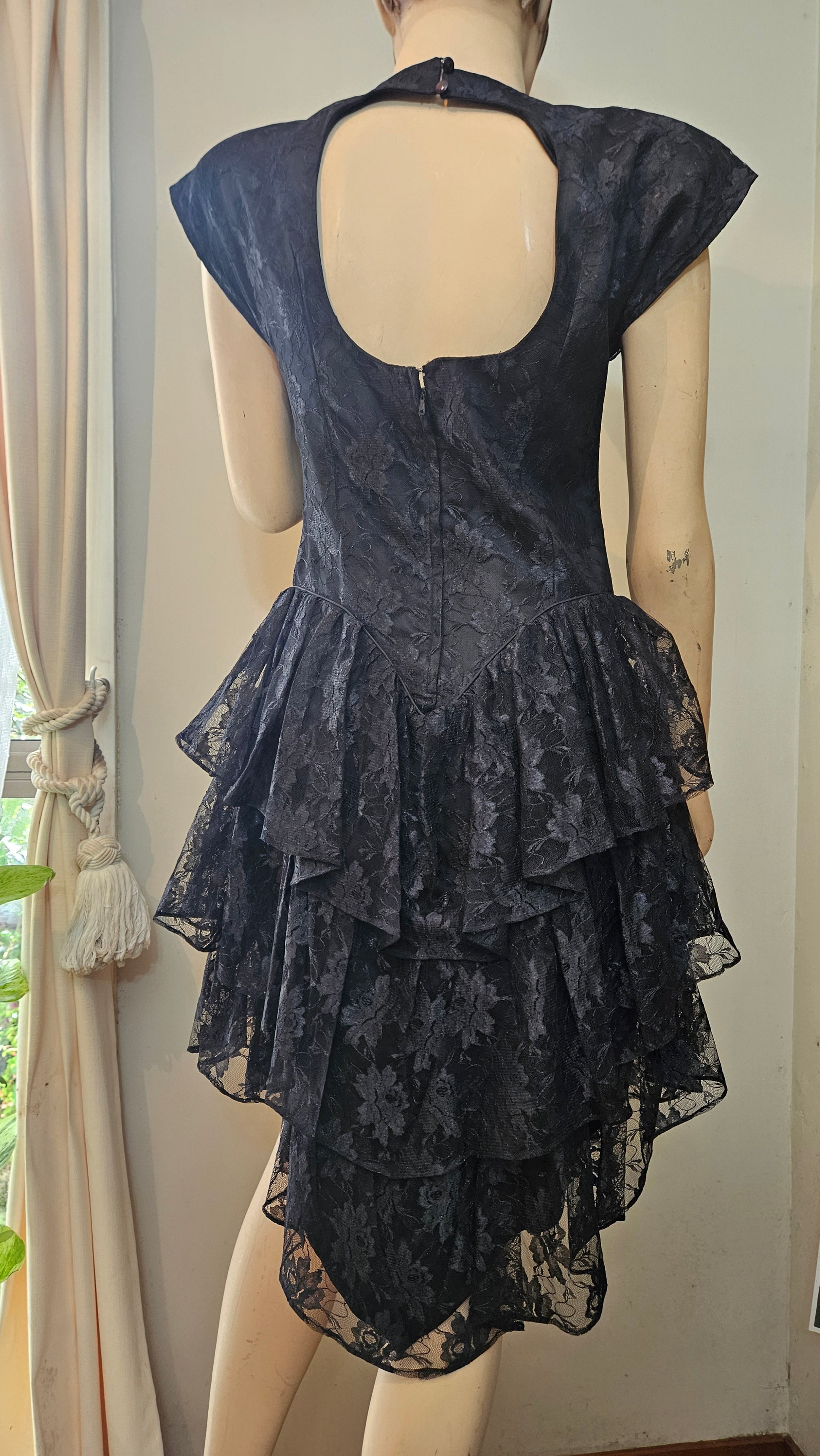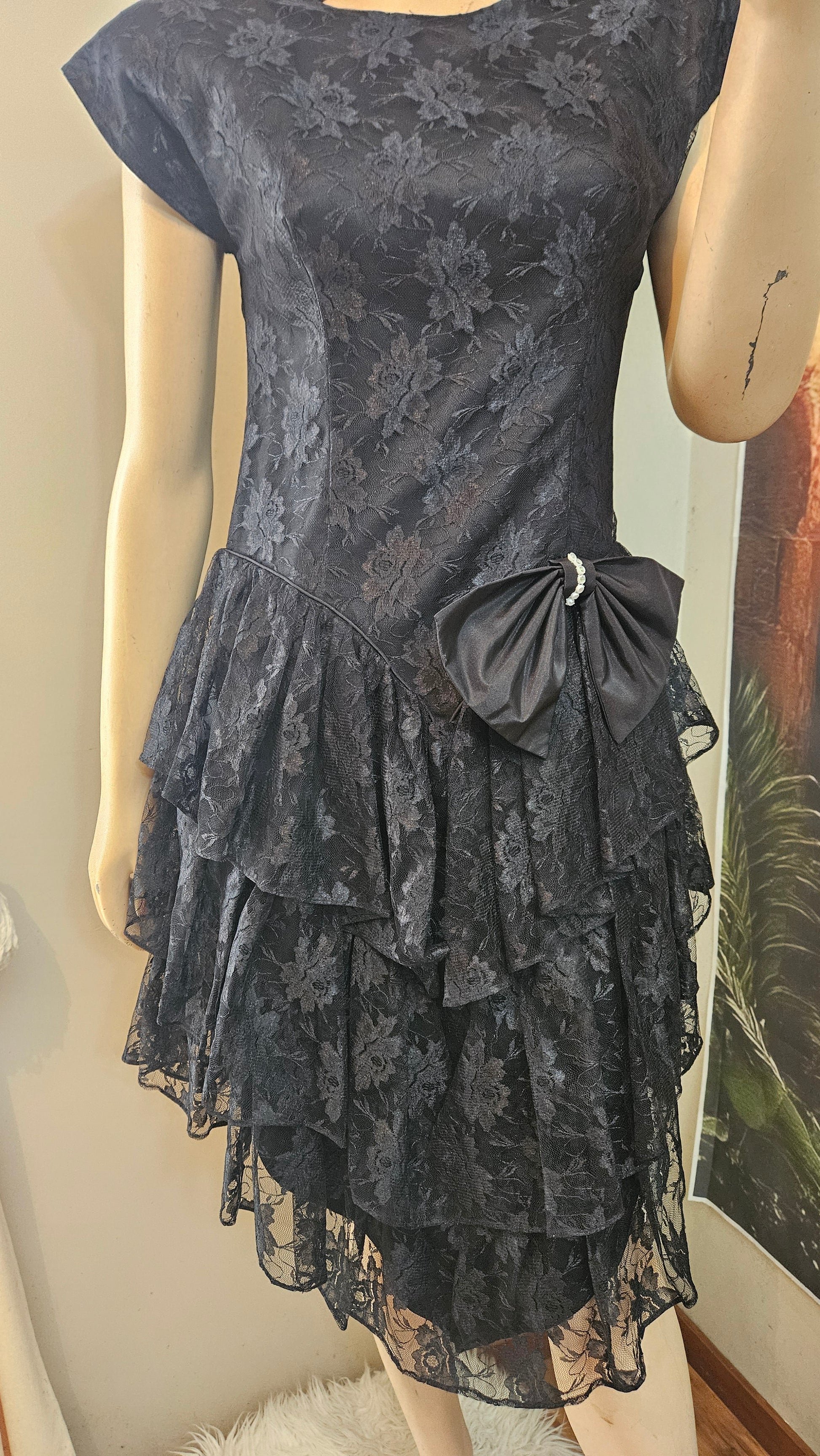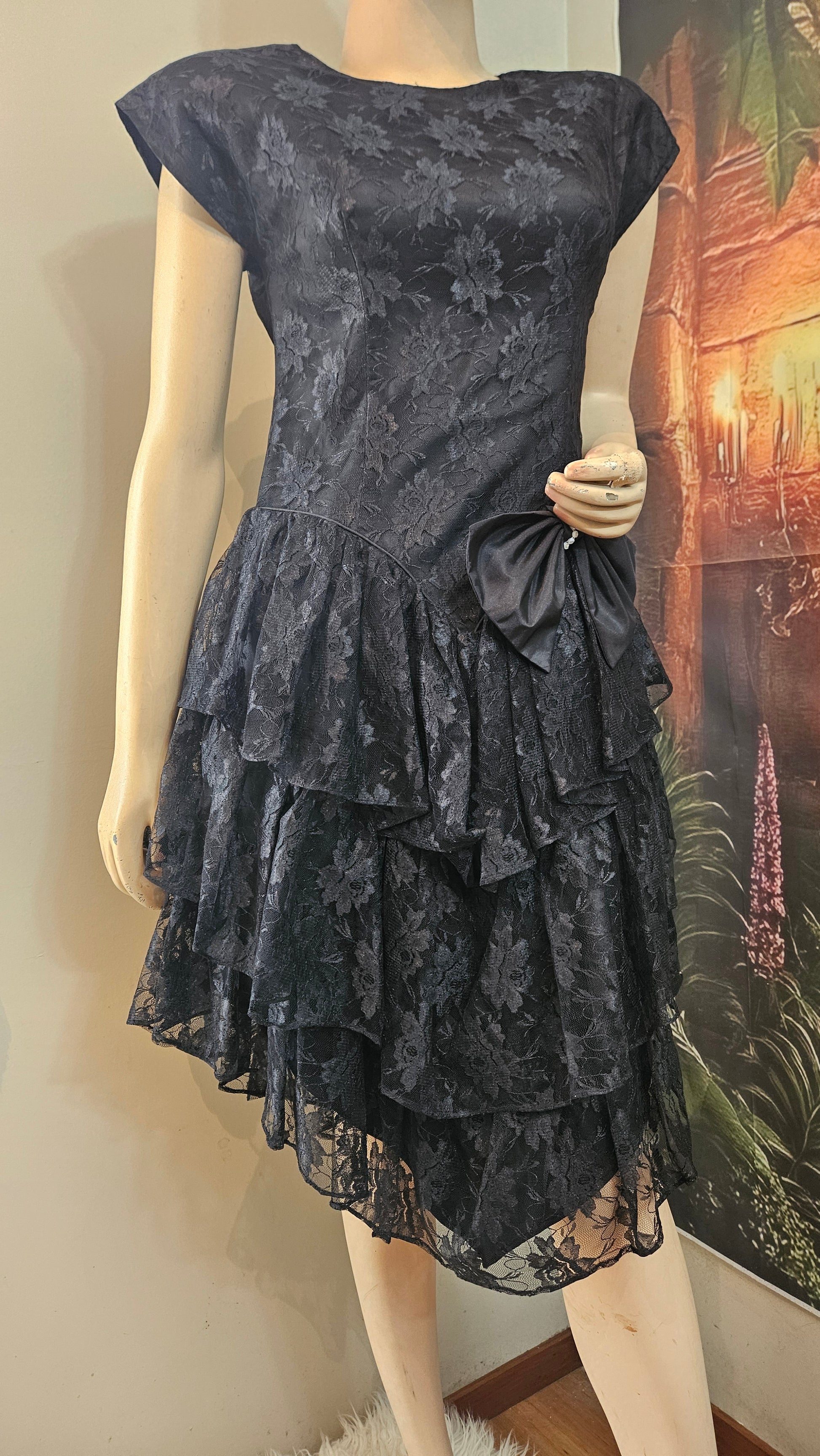 Stunning vintage black lace dress from the 80s, featuring elegant ruffles, bold shoulder pads, and a chic side bow. Short, stylish, and the perfect mix of elegant and sexy. During the 1980s, dresses like this were worn for glamorous parties, cocktail nights, and special events where women embraced bold silhouettes and statement fashion. Made in Mexico, size 14 (vintage so in my opinion it is smaller than a size 14.....More like a size 12) and still in beautiful vintage condition — a timeless piece that truly defined the era of confidence and sophistication.
