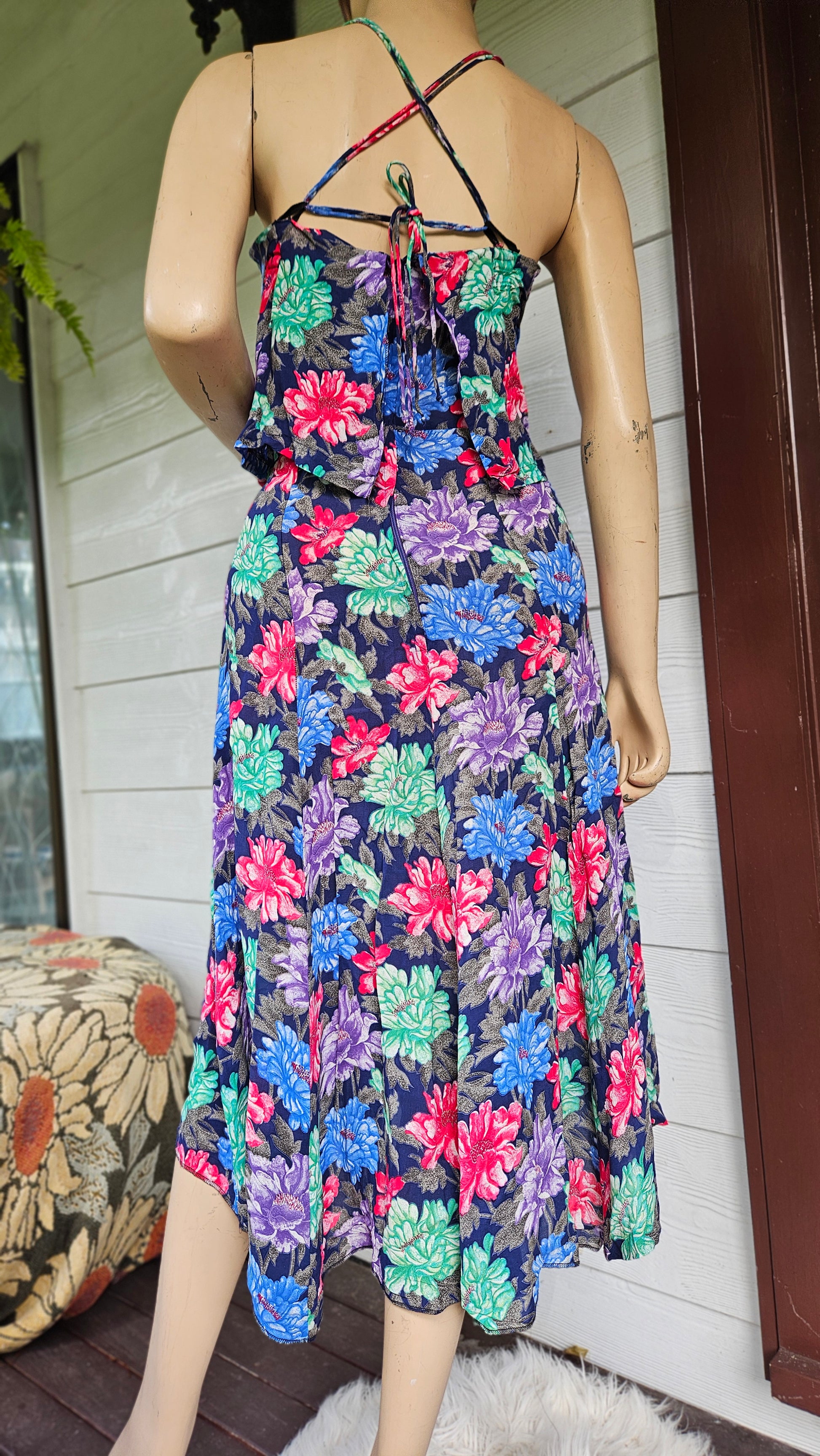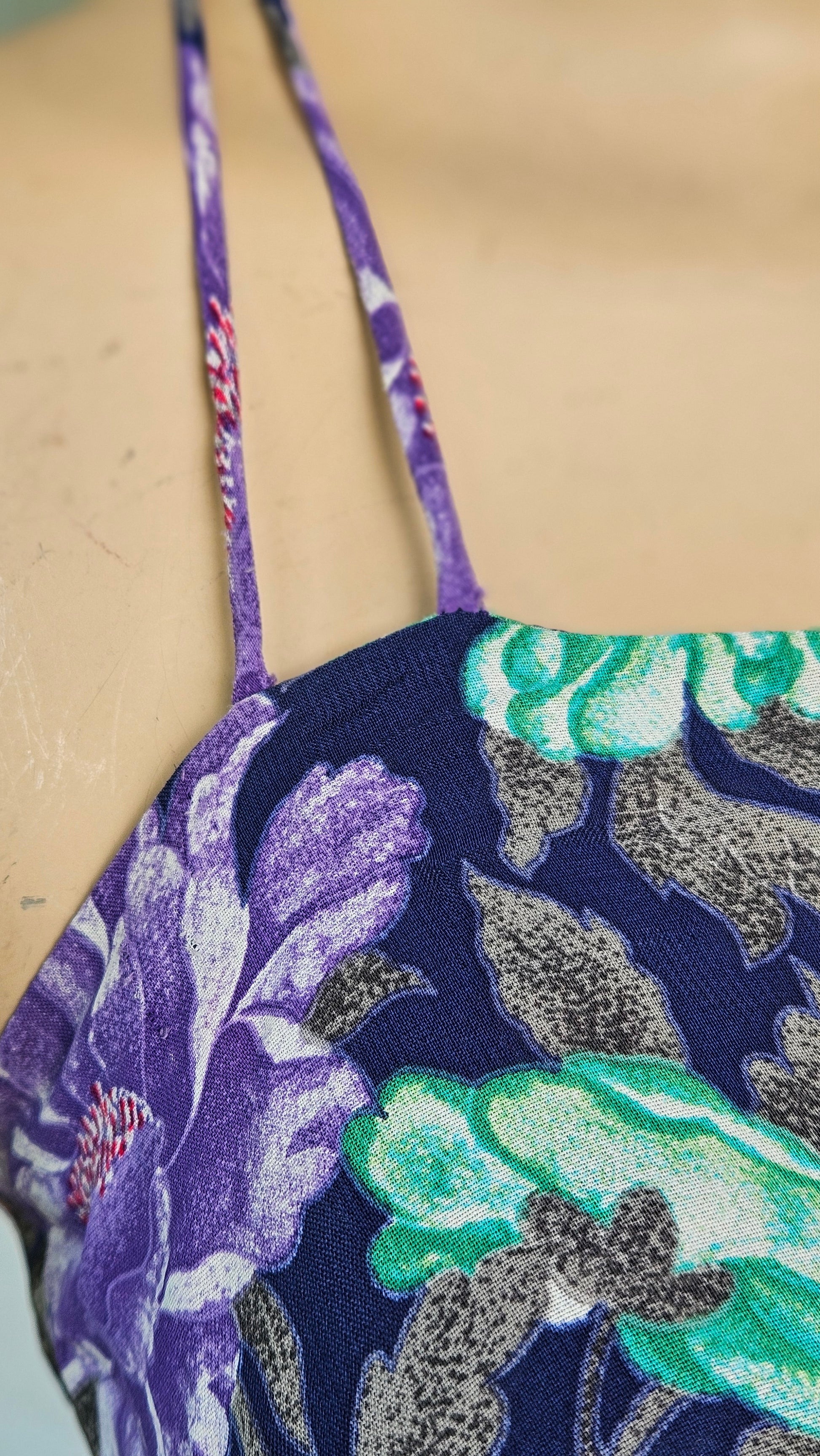 This wonderful example of a colorful era, with its delicate floral pattern and double spaghetti straps. Soft in texture and swish extreme. I belive this is silk but I can't guarantee it.