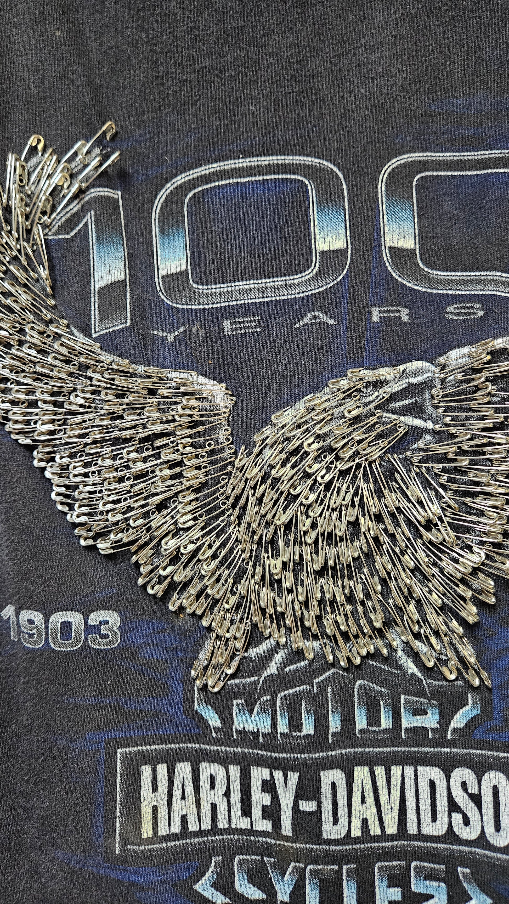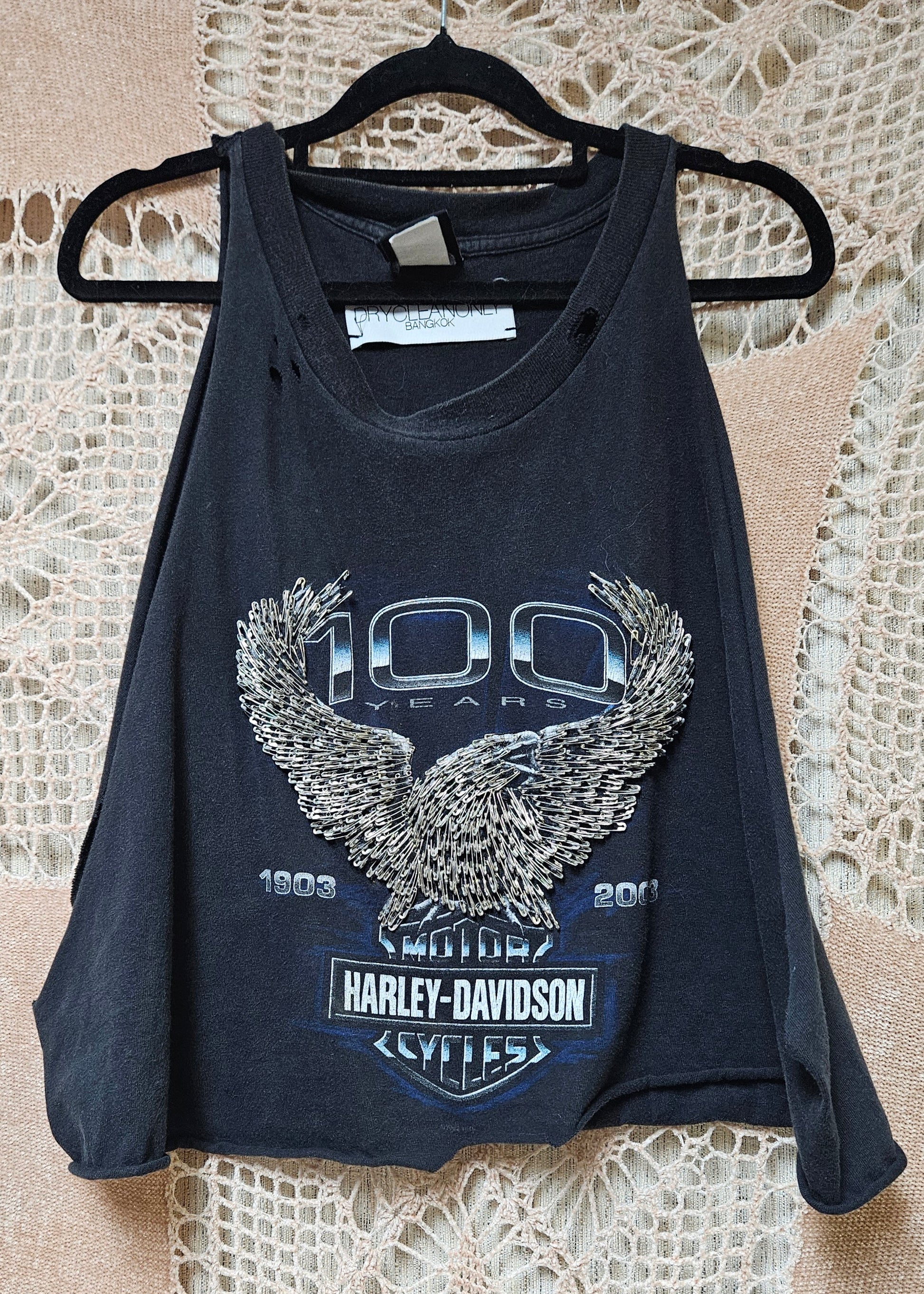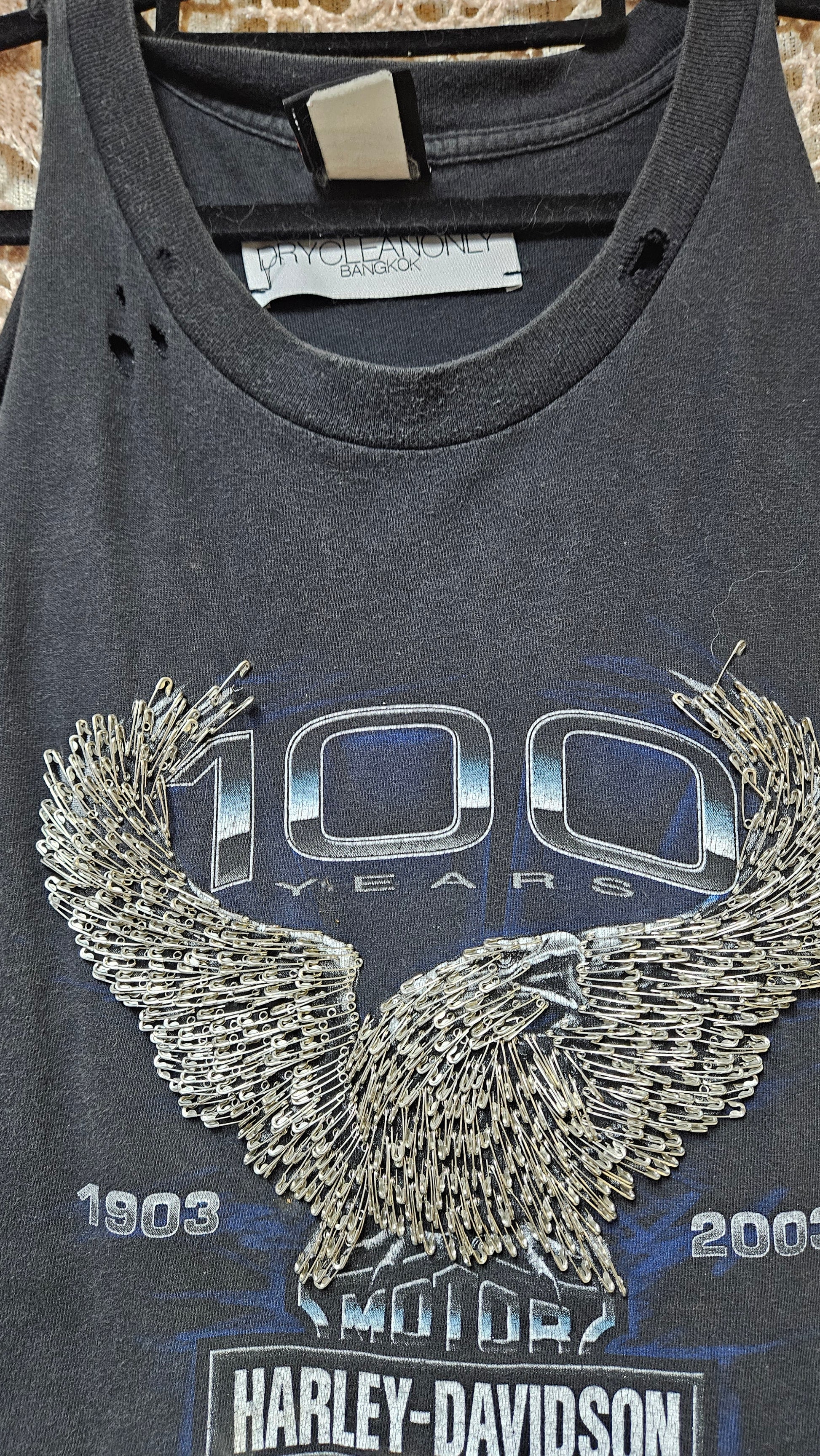 Absolutely stunning vintage Harley Davidson tank top. Vintage Harley Davidson USA Made Size XL 100 Years with metal safety pins on the eagle, a unique gem!