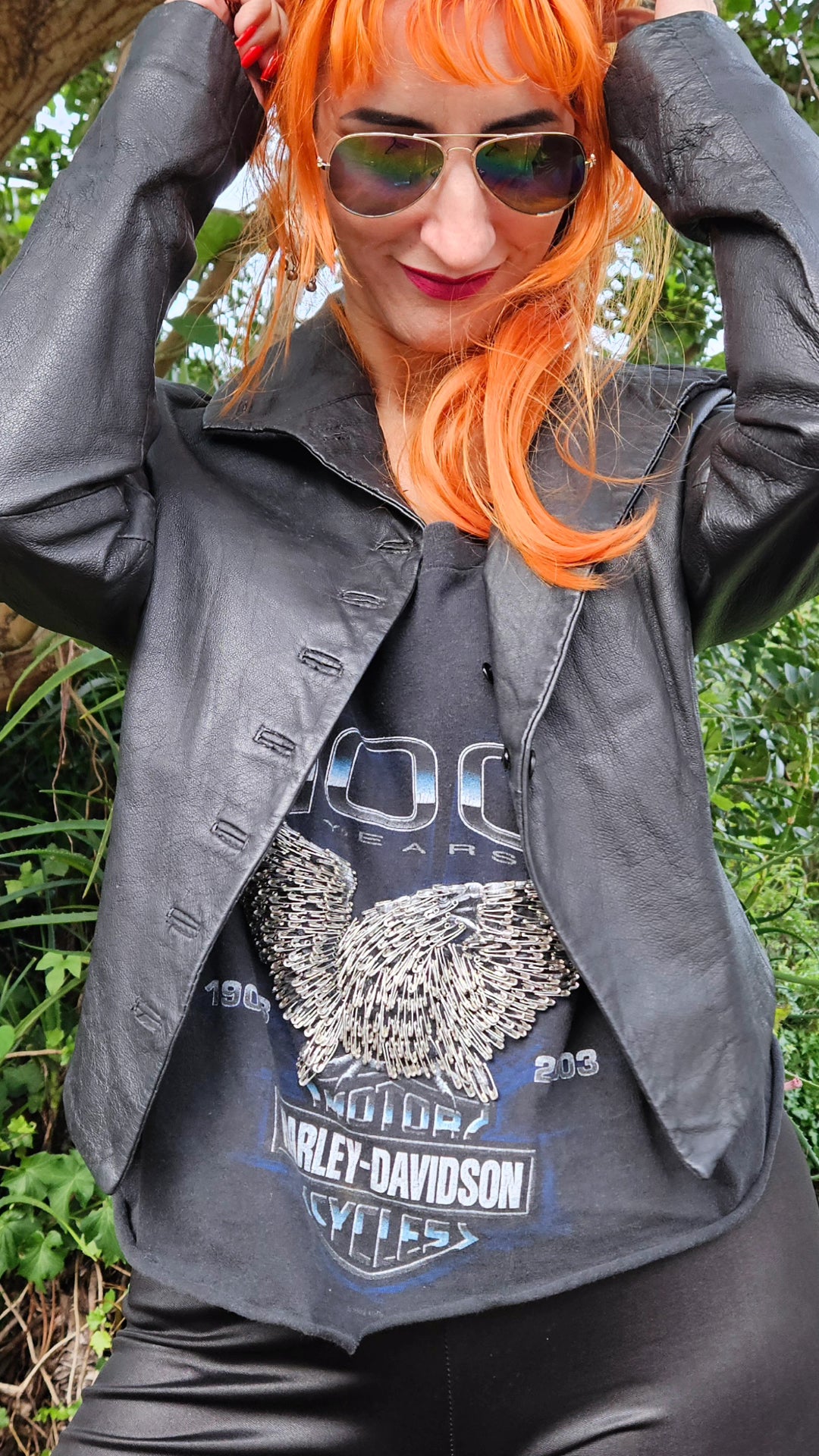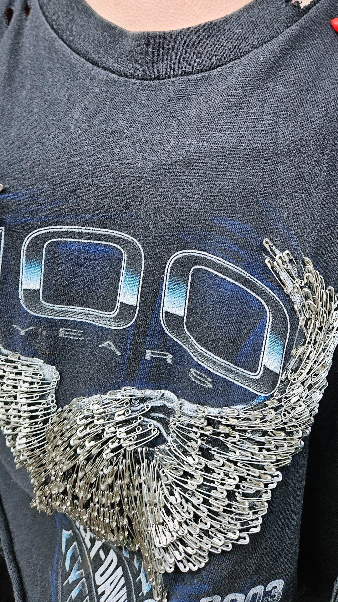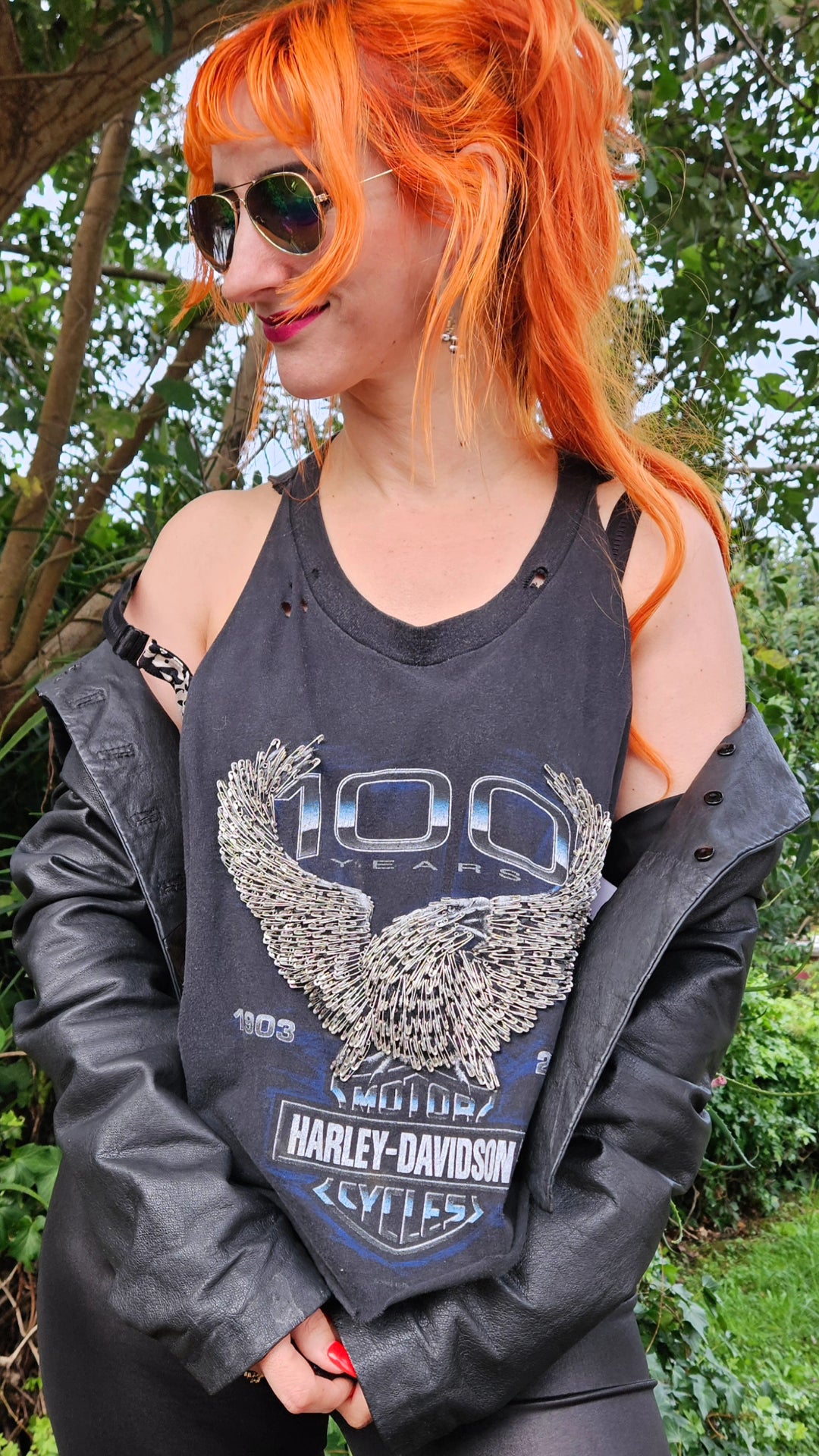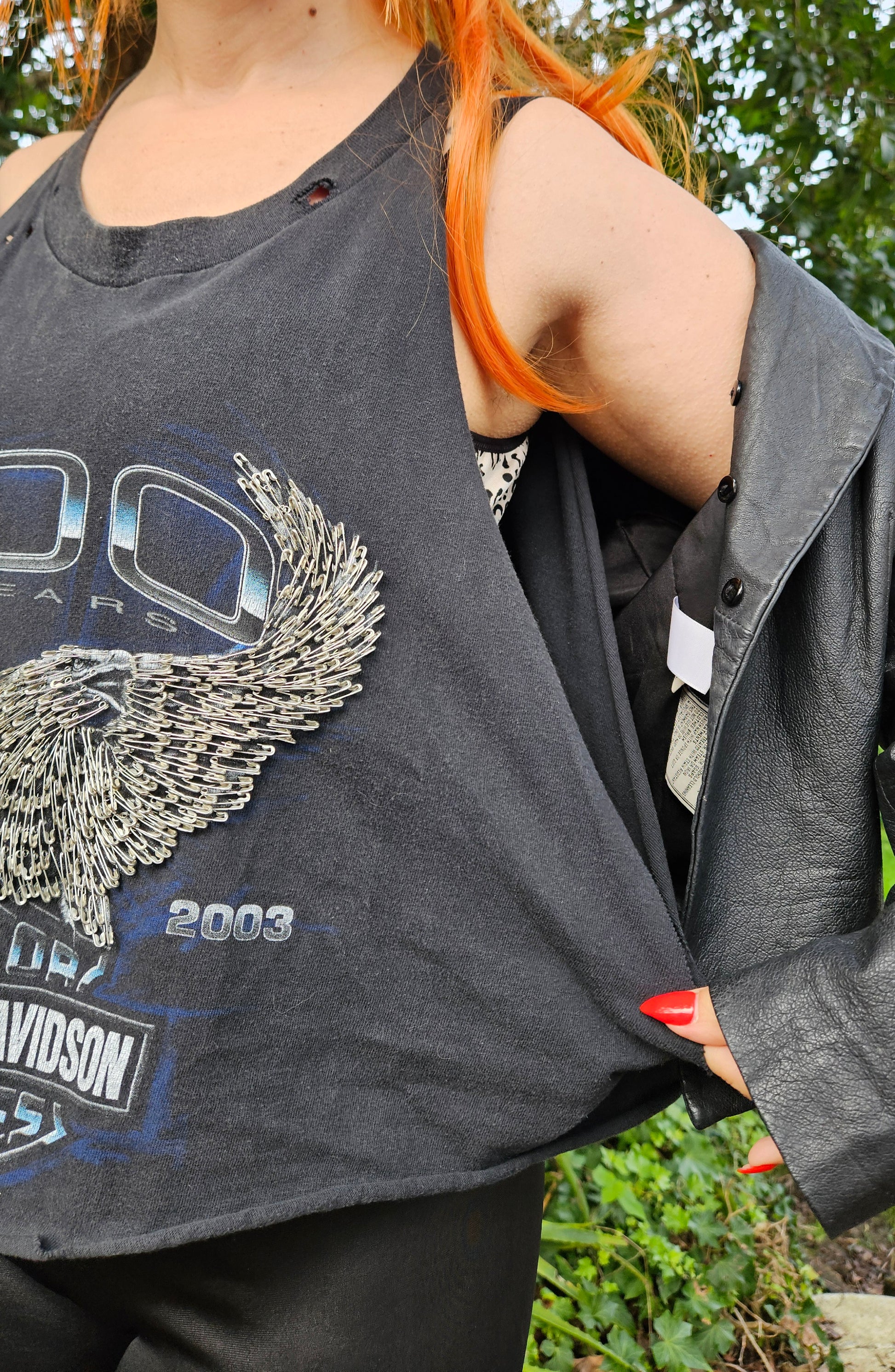 Absolutely stunning vintage Harley Davidson tank top. Vintage Harley Davidson USA Made Size XL 100 Years with metal safety pins on the eagle, a unique gem!
